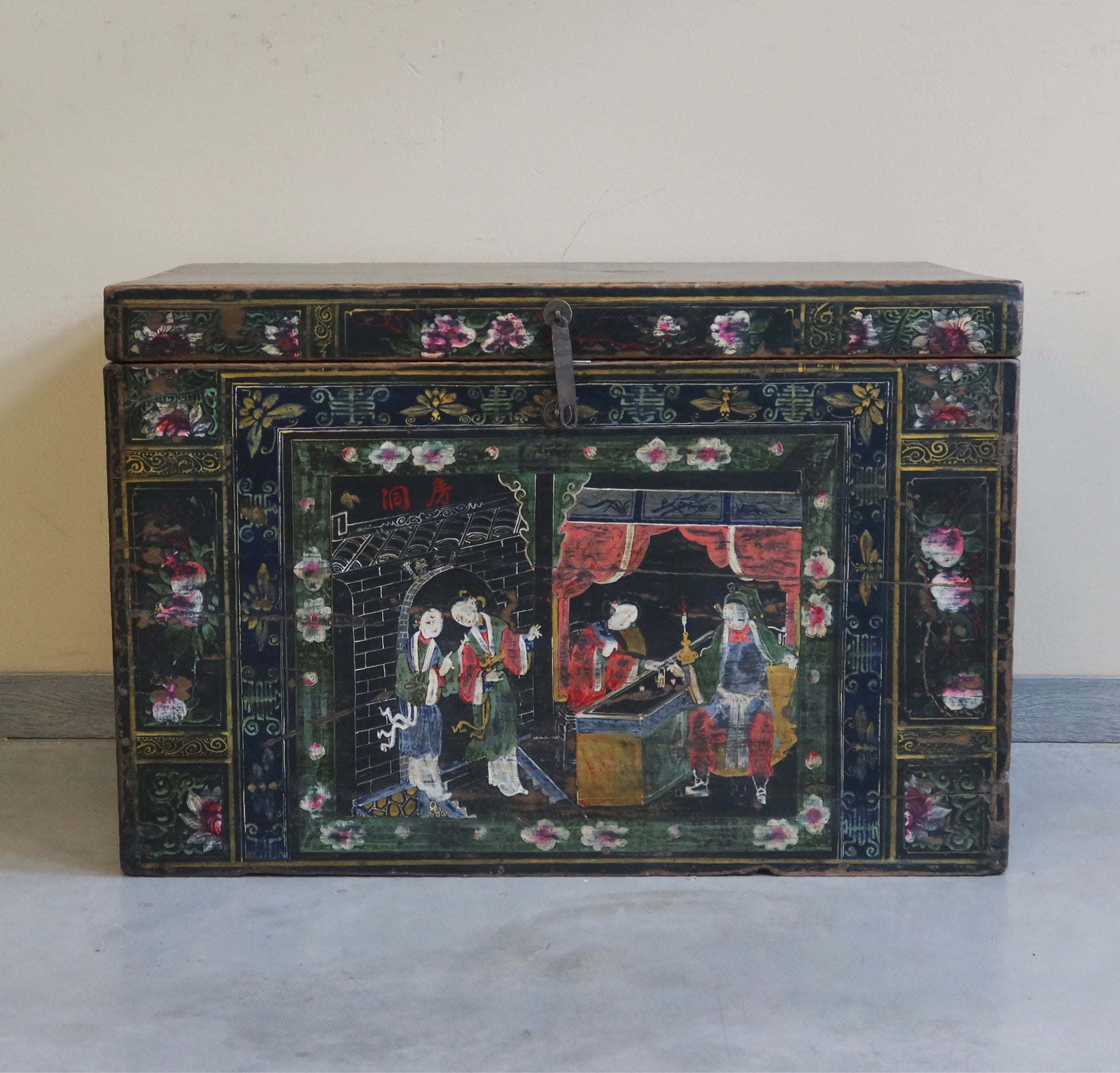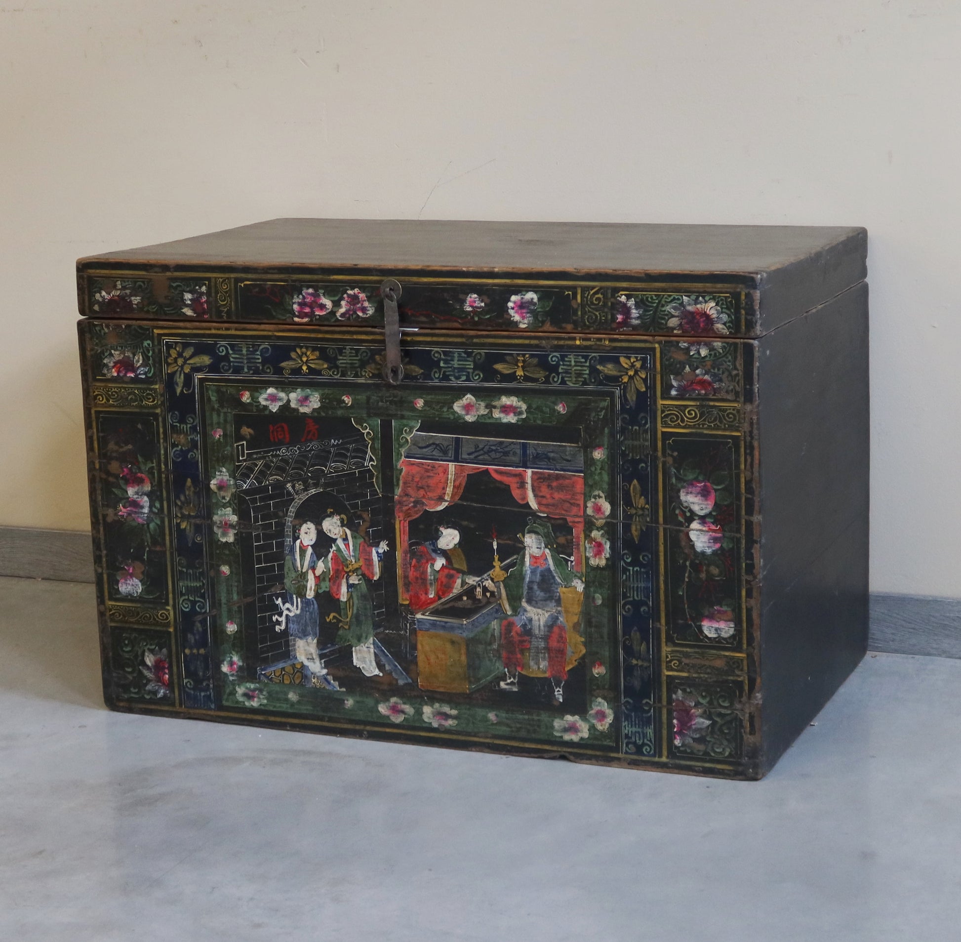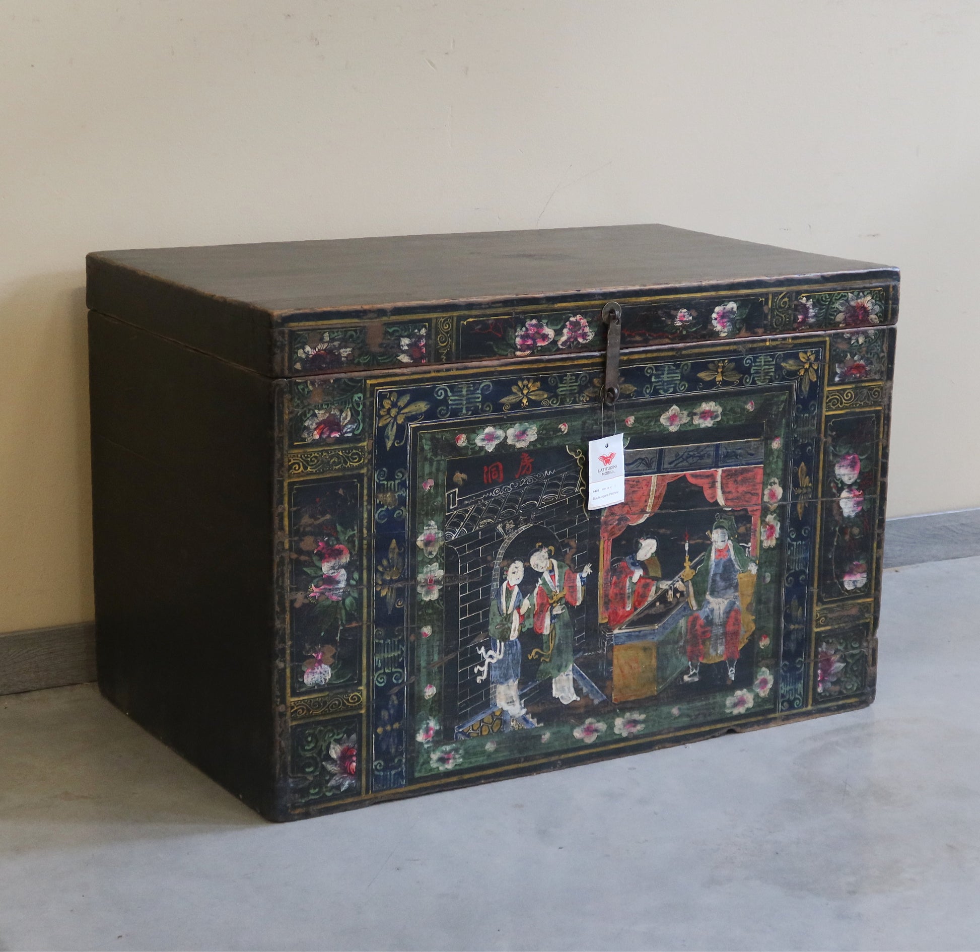 Tradizionale baule etnico dell'Opera di Pechino in lacca nera decorata da motivi caratteristici: la lacca è in patina.
