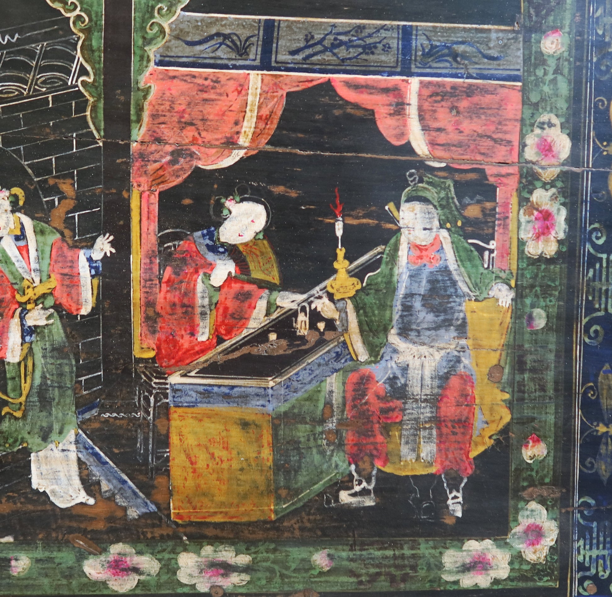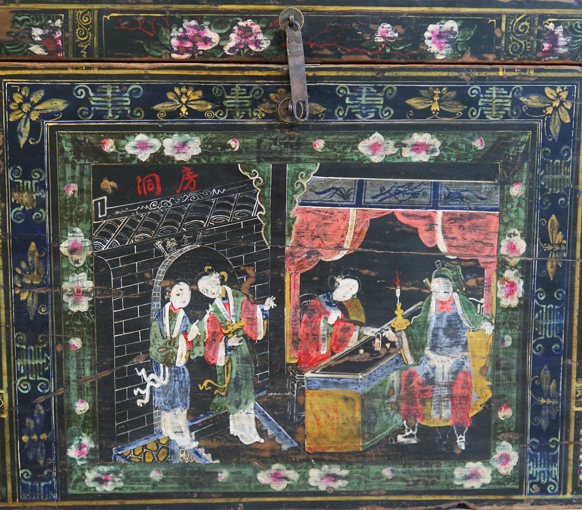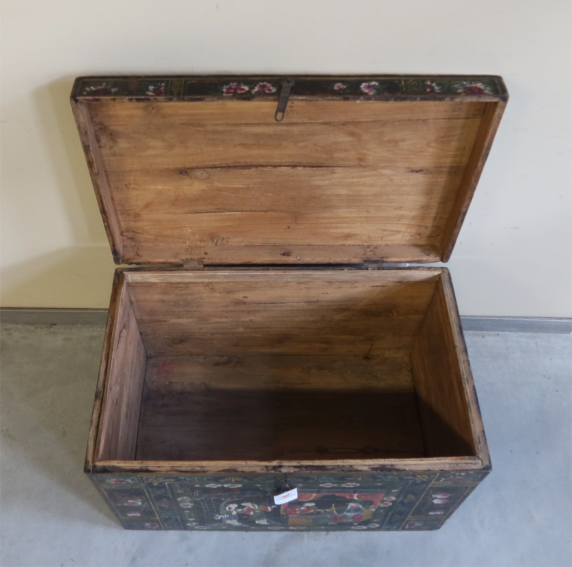 Tradizionale baule etnico dell'Opera di Pechino in lacca nera decorata da motivi caratteristici: la lacca è in patina.