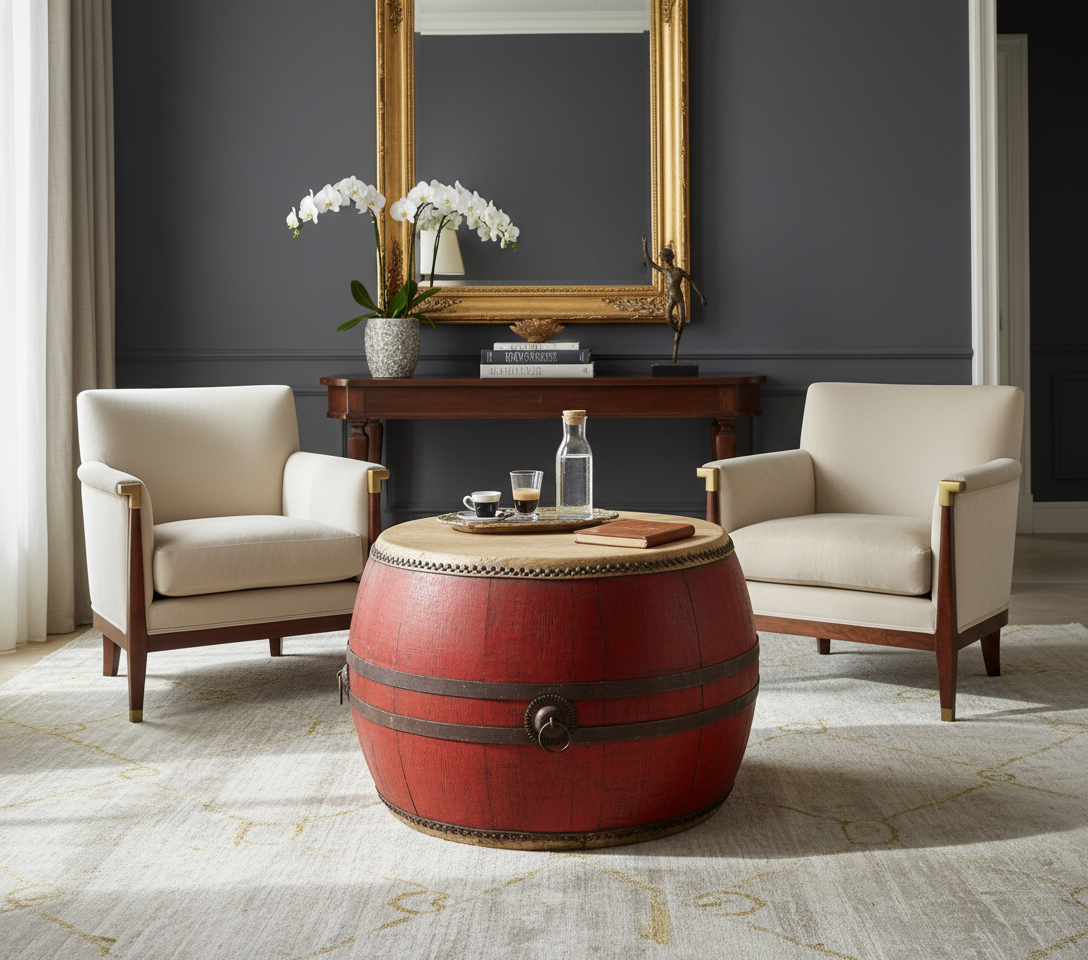 Grande tamburo cinese antico dalla caratteristica forma a botte e con la laccatura in patina. La pergamena è fissata alla struttura con decorative borchie metalliche, così come metallici sono gli anelli laterali. Di grande impatto decorativo, può essere utilizzato come base d'appoggio o anche come tavolo etnico in un grande soggiorno! Il diametro del piano d'appoggio è cm 85; il diametro massimo alla stondatura è cm 101.