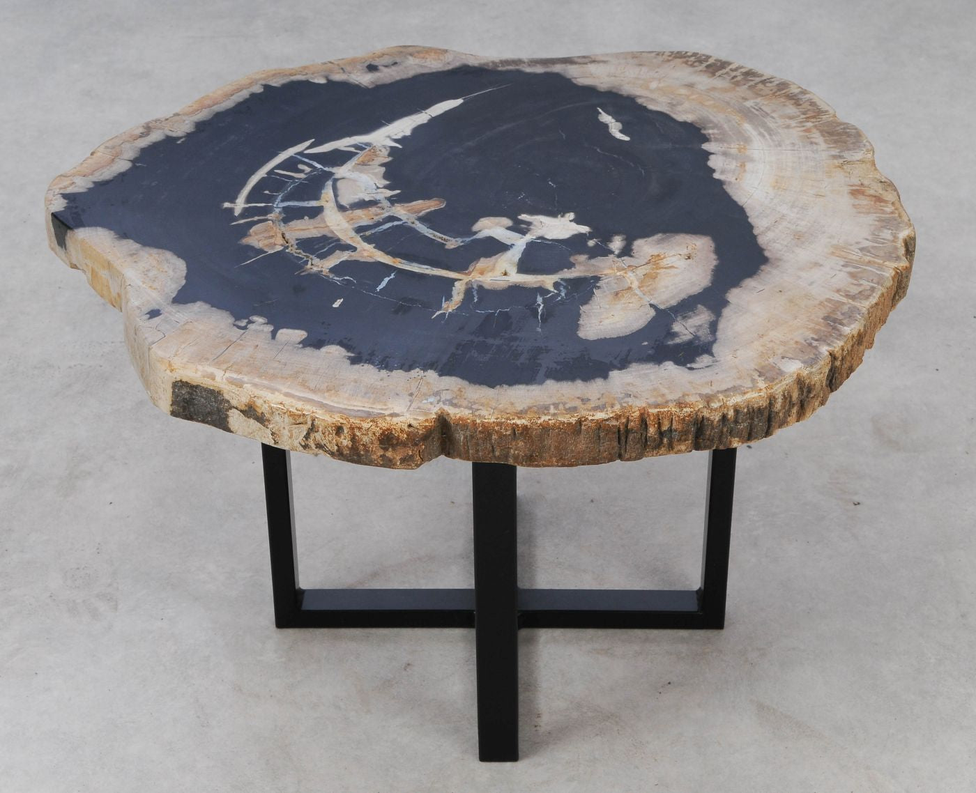 Questo tavolino in legno pietrificato unisce design e storia. Il piano, ricavato da un albero vissuto 20 milioni di anni fa, mostra colori unici frutto della naturale mineralizzazione nel tempo.