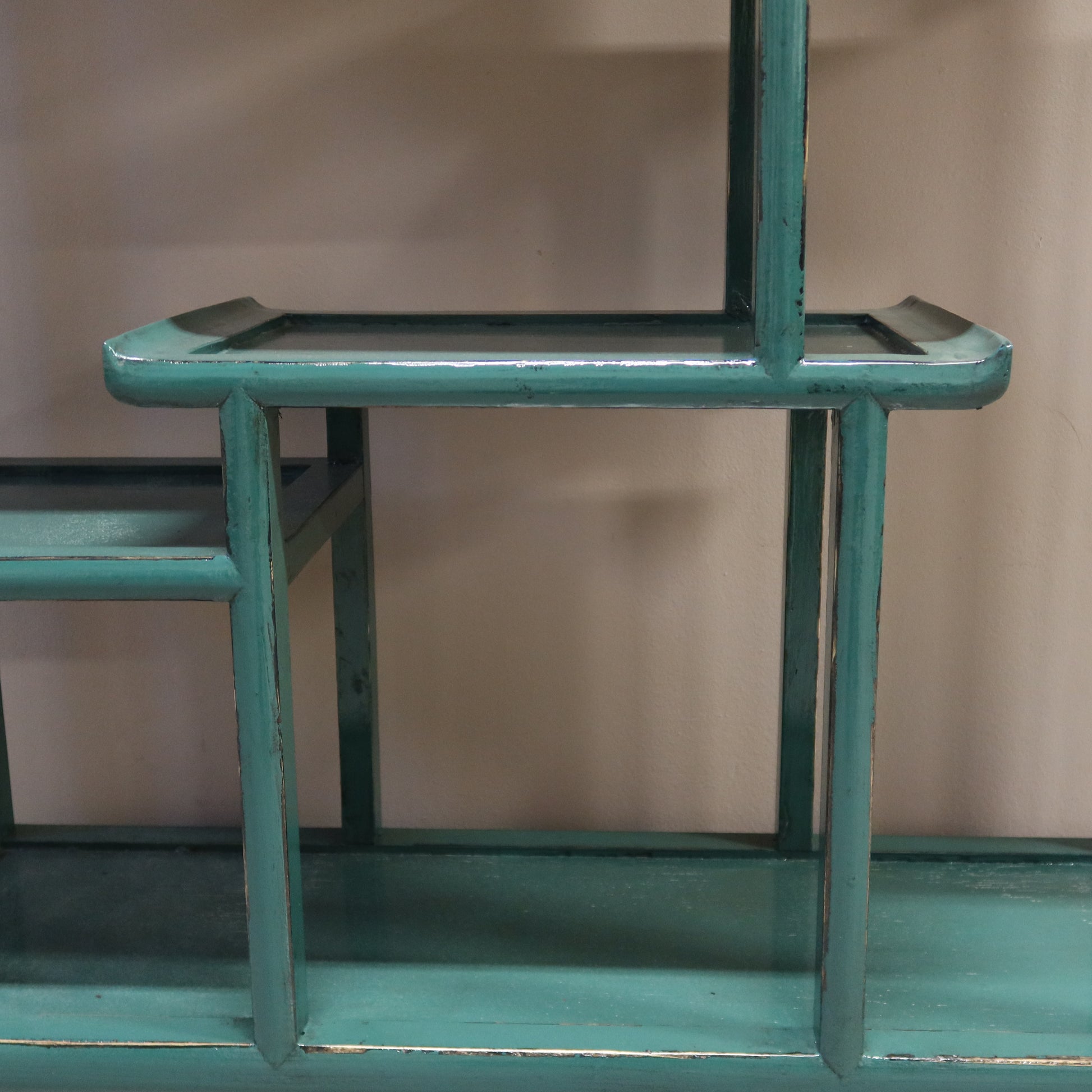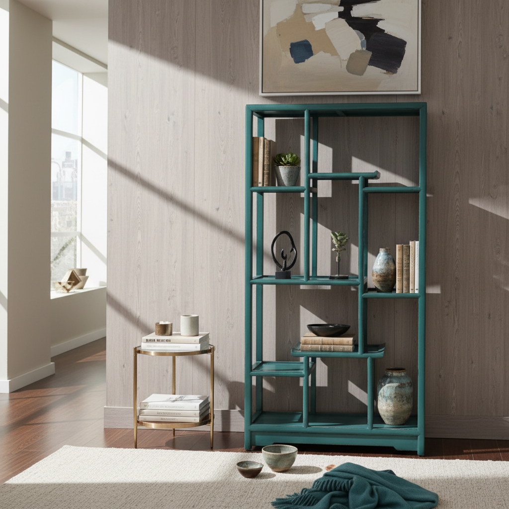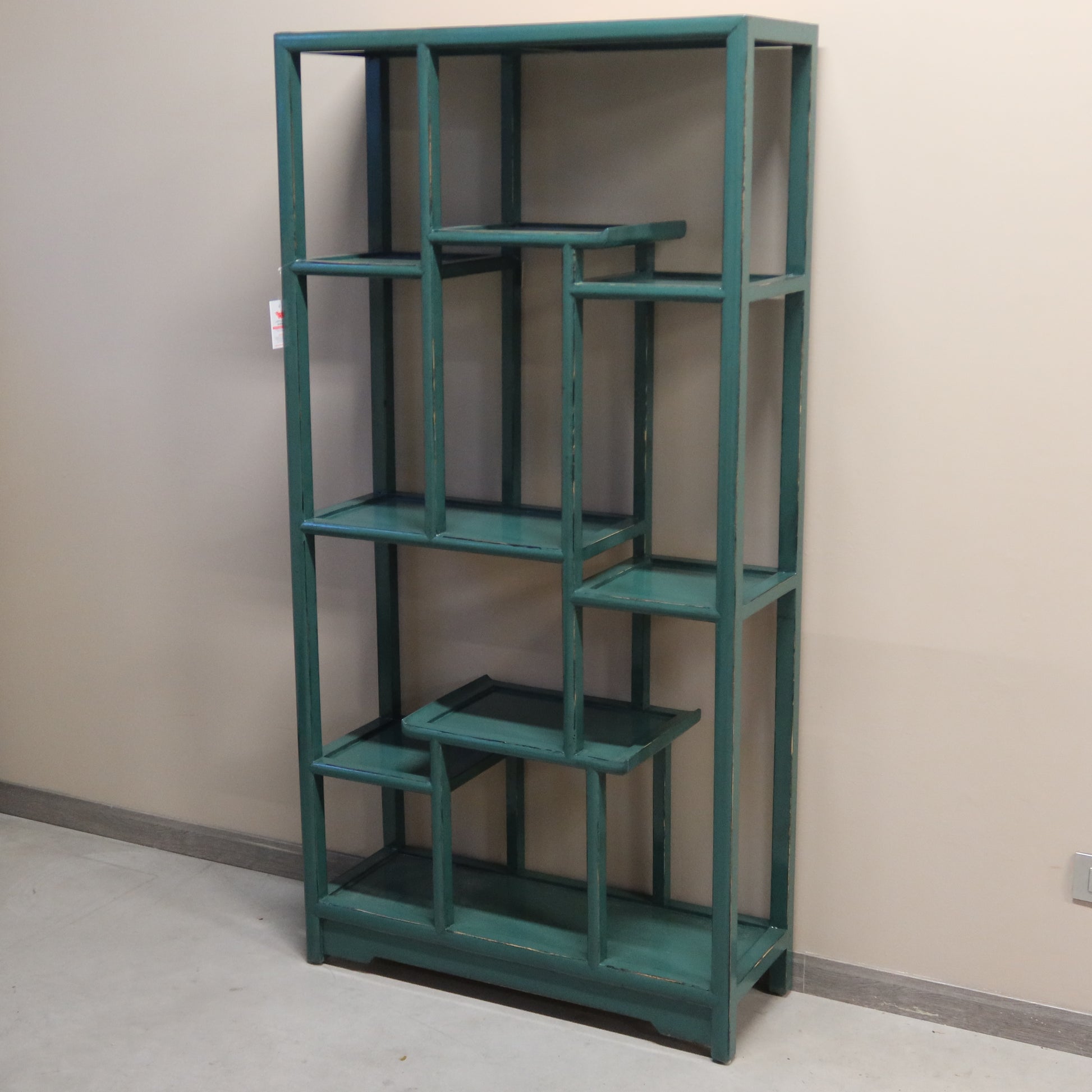 Sfiziosa libreria etnica in lacca con un particolare gioco di ripiani posti asimmetricamente. E' un mobile laccato da entrambi i lati, e può essere anche utilizzato da centro per separare due ambienti in un open space. Non solo libreria: le mensole di altezza e dimensioni diversi rendono il mobile adatto alla valorizzazione di oggetti e soprammobili.
