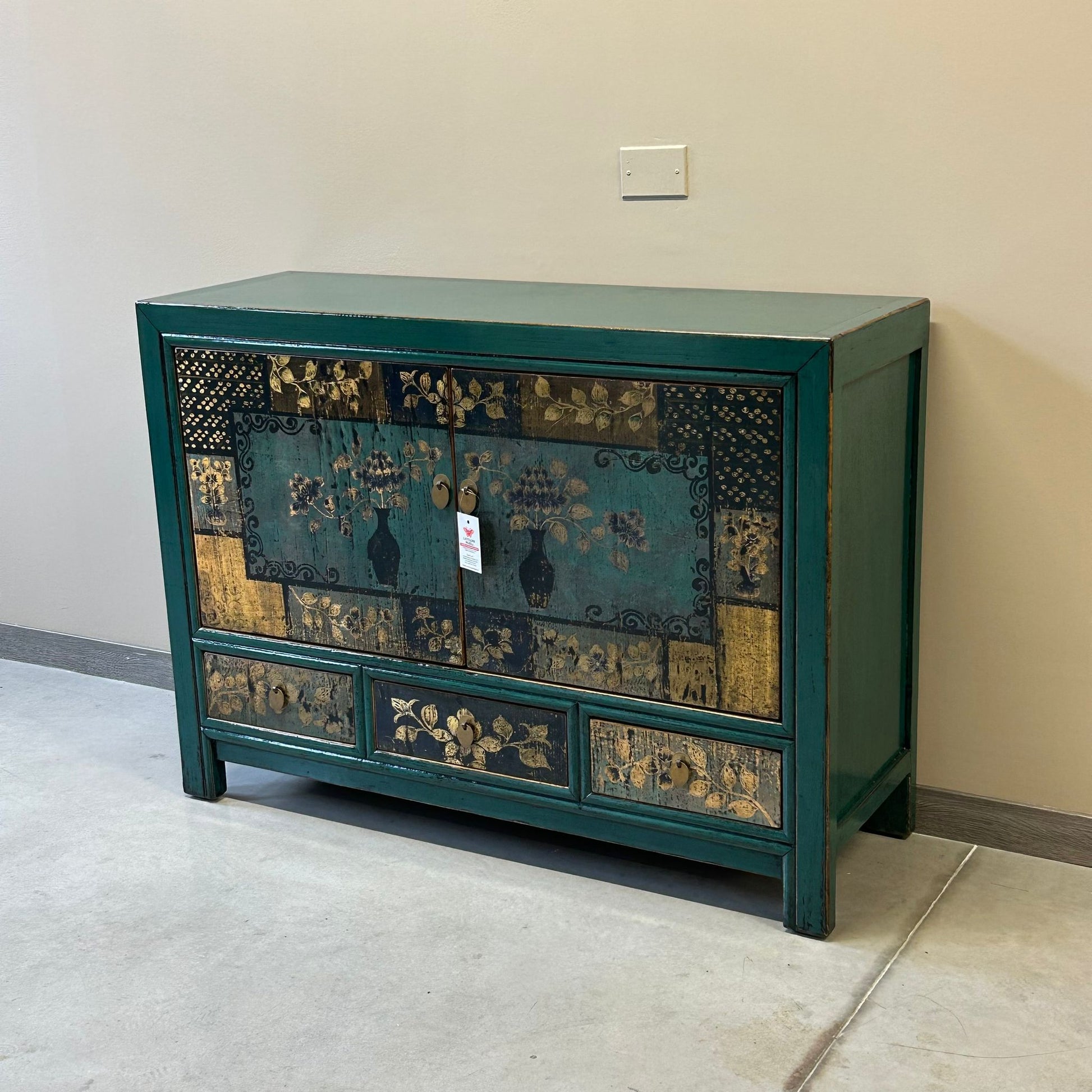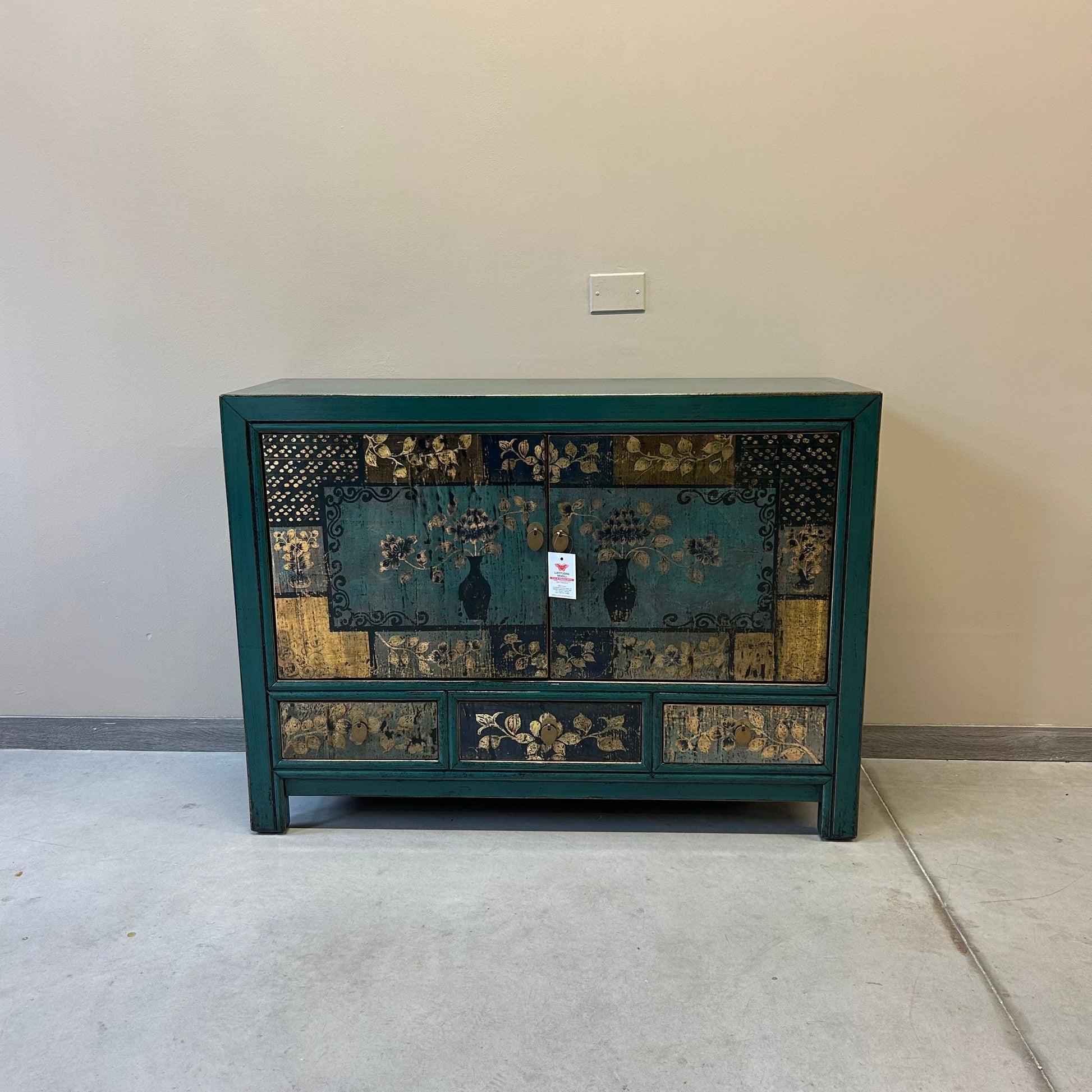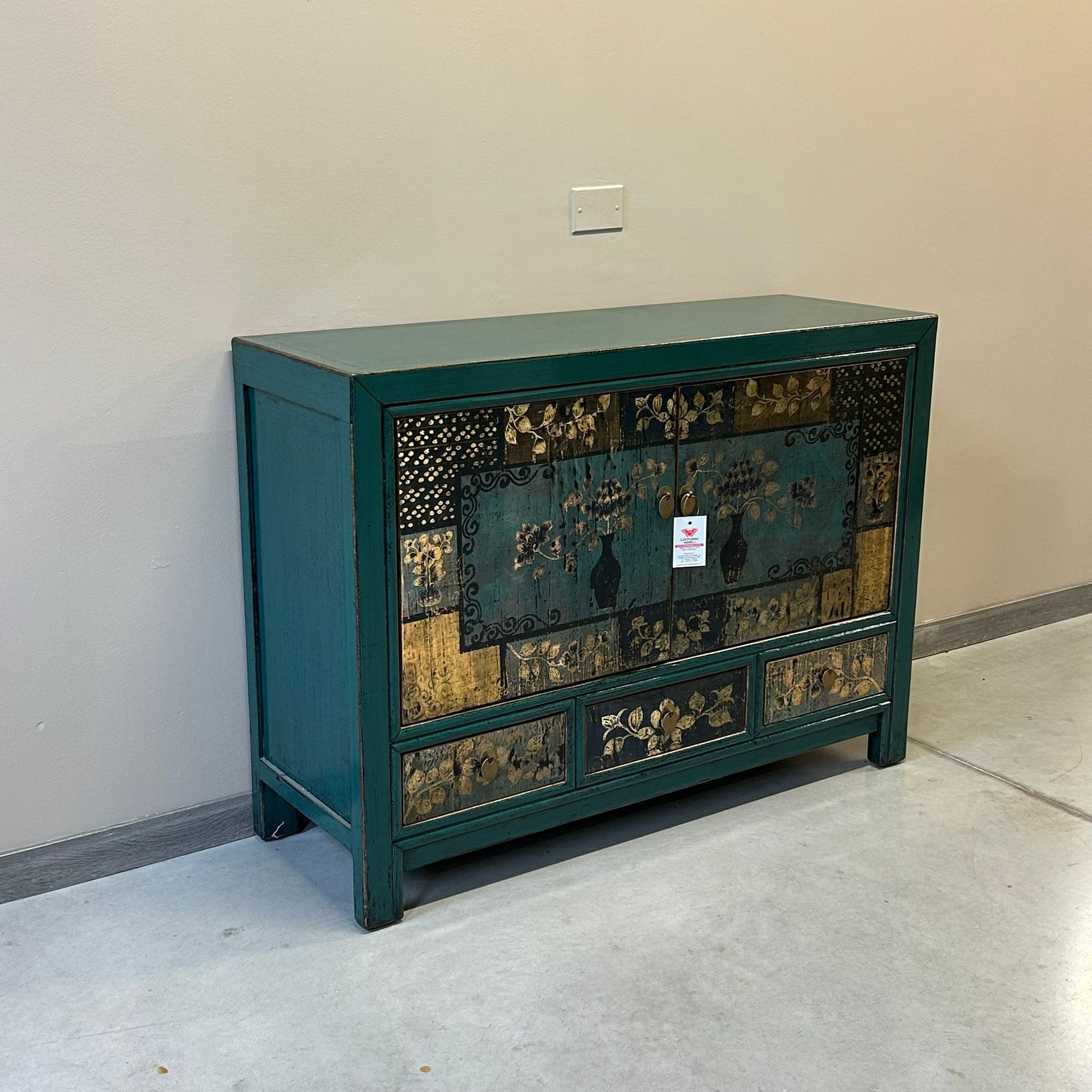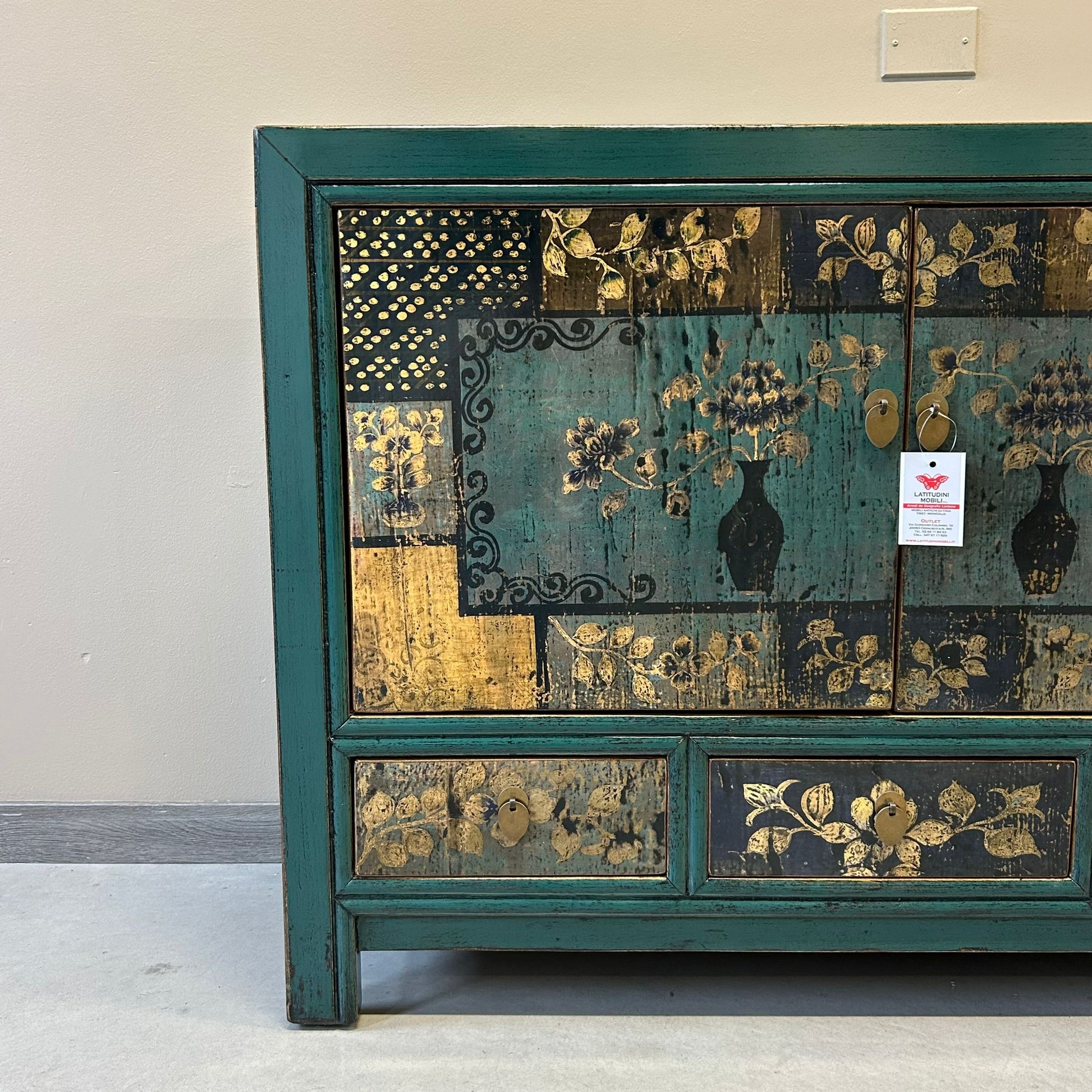 Credenza cinese proveniente dalla regione del Ganzu (Cina settentrionale) in lacca policroma con fronte decorato a motivi simmetrici: tre cassetti e pannellatura delle due ante con rappresentazione floreale inscritta in una cornice geometrica.