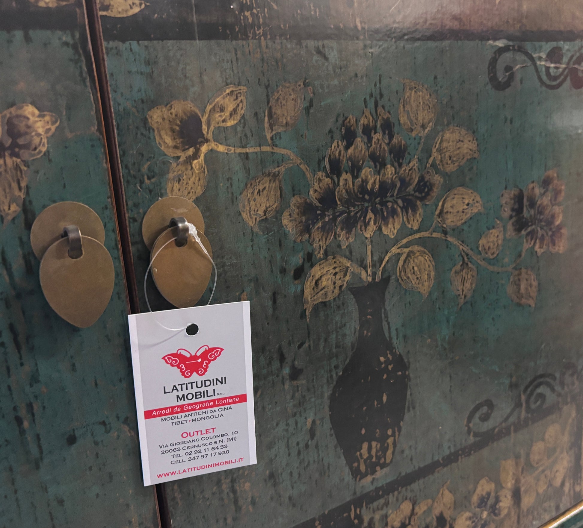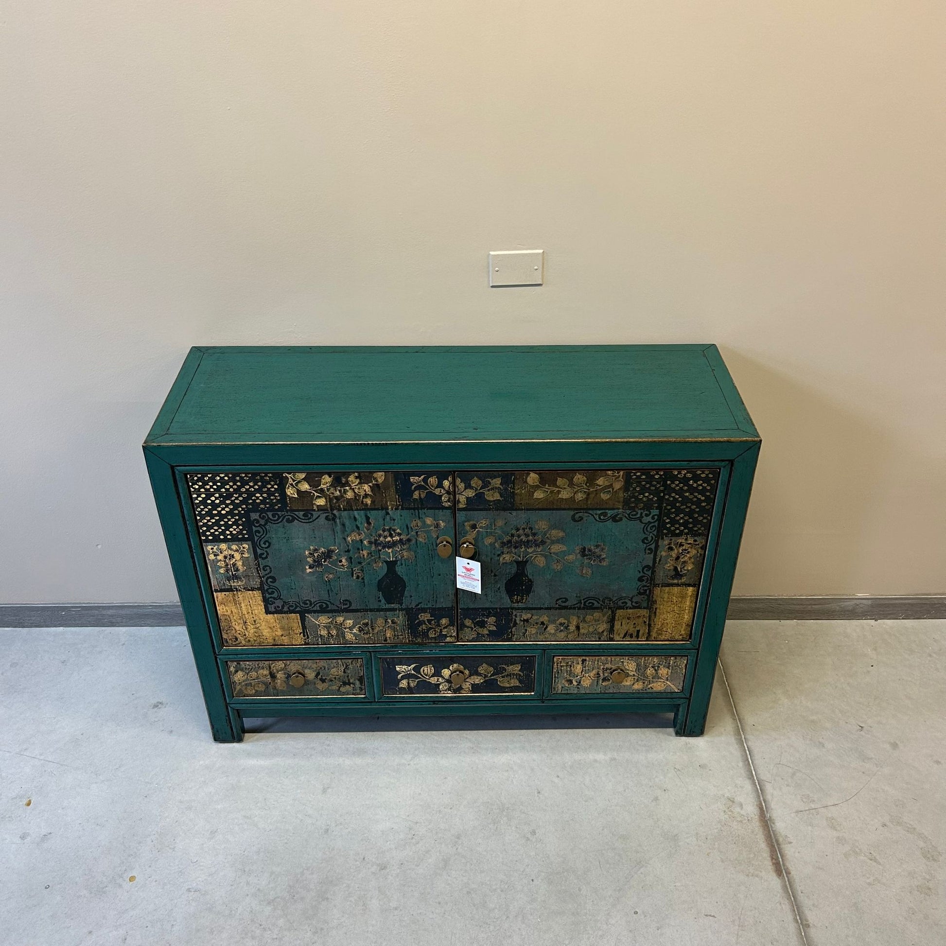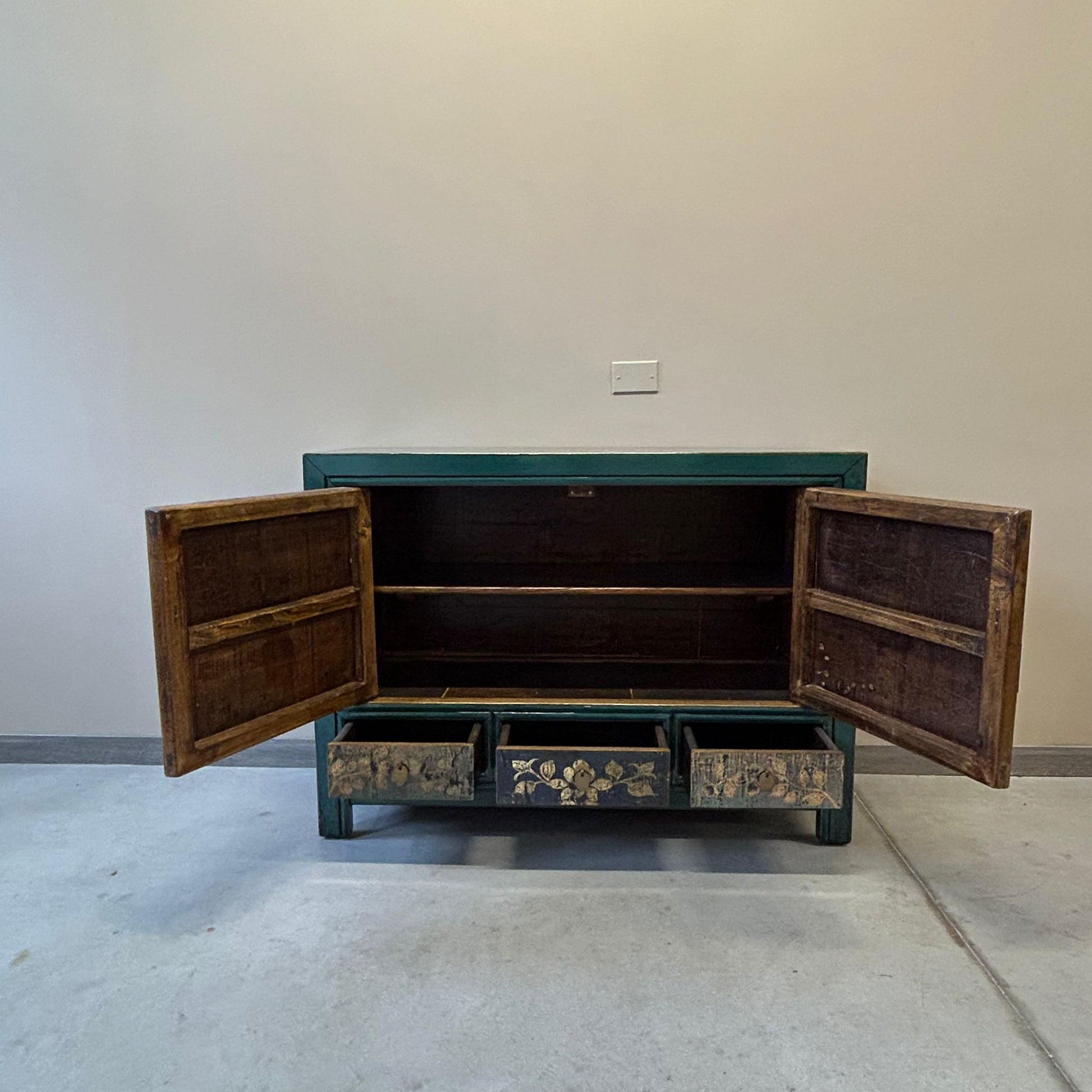 Credenza cinese proveniente dalla regione del Ganzu (Cina settentrionale) in lacca policroma con fronte decorato a motivi simmetrici: tre cassetti e pannellatura delle due ante con rappresentazione floreale inscritta in una cornice geometrica.