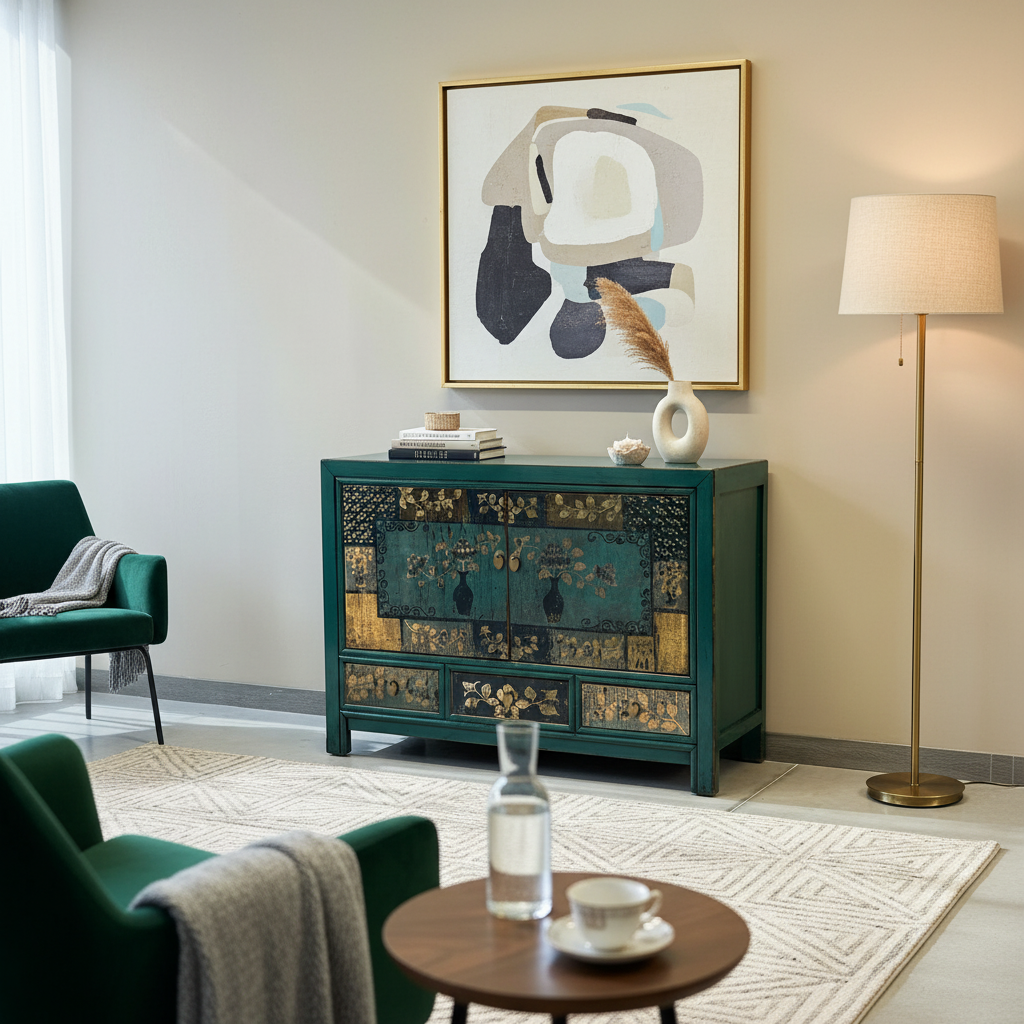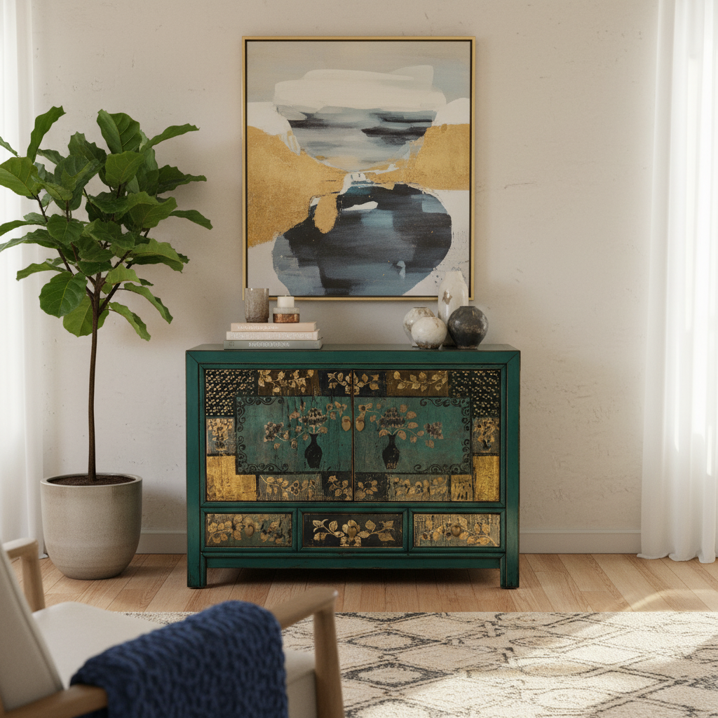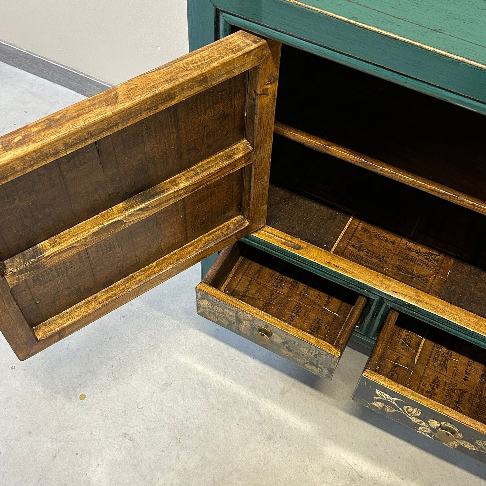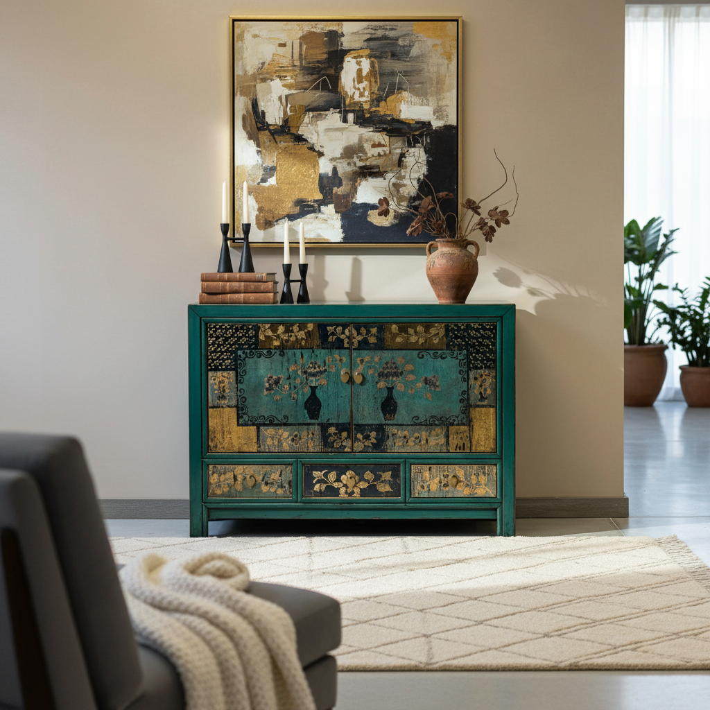 Credenza cinese proveniente dalla regione del Ganzu (Cina settentrionale) in lacca policroma con fronte decorato a motivi simmetrici: tre cassetti e pannellatura delle due ante con rappresentazione floreale inscritta in una cornice geometrica.