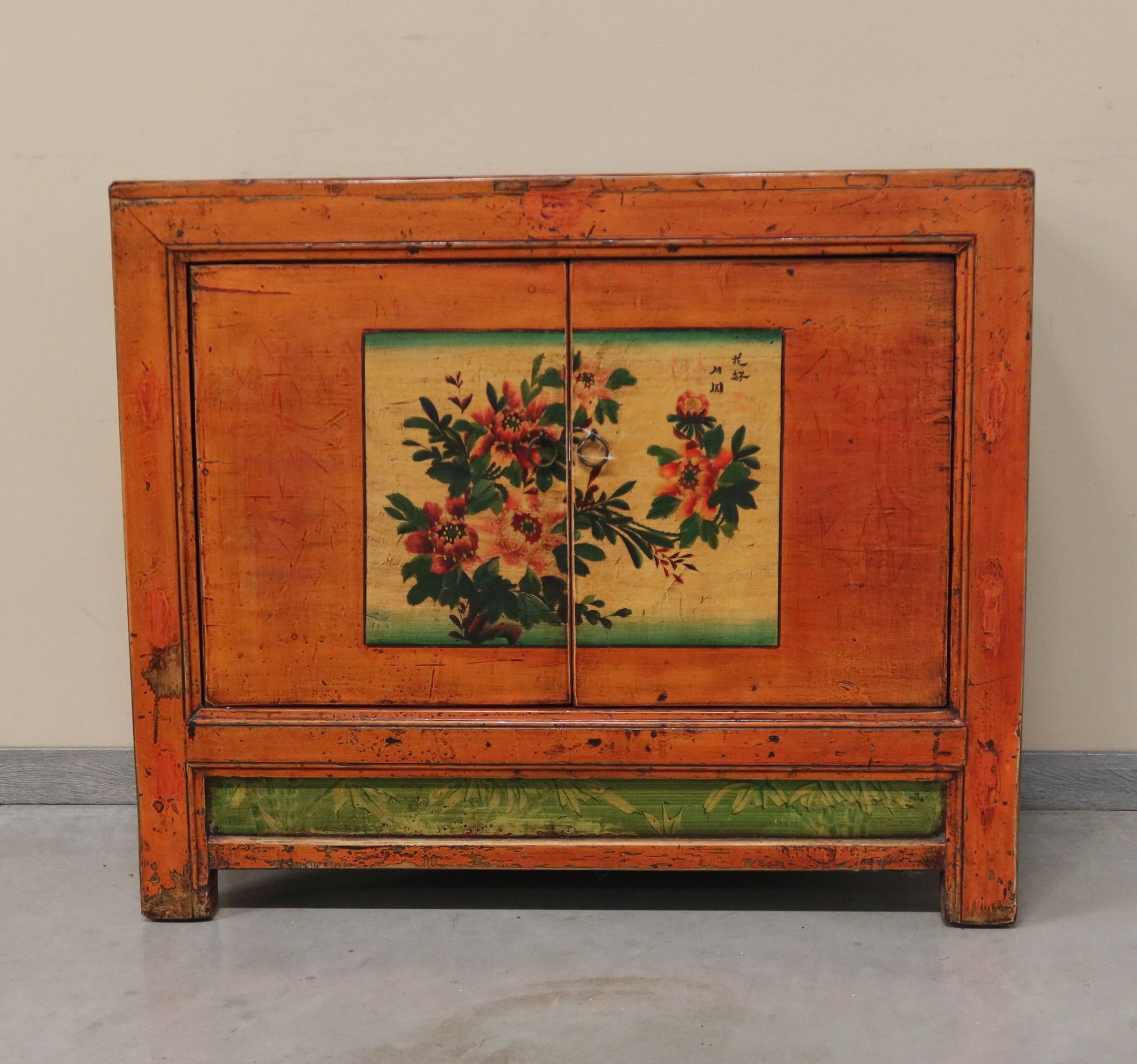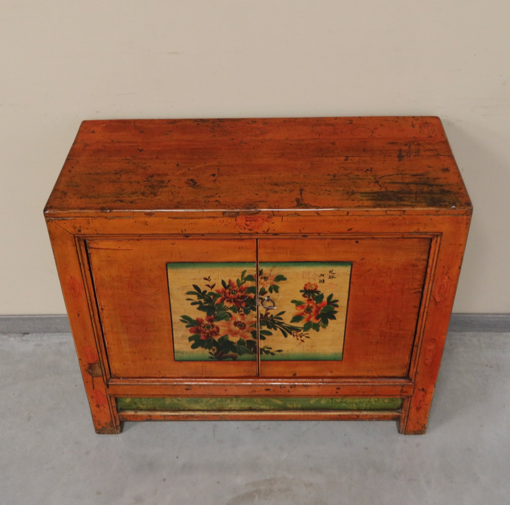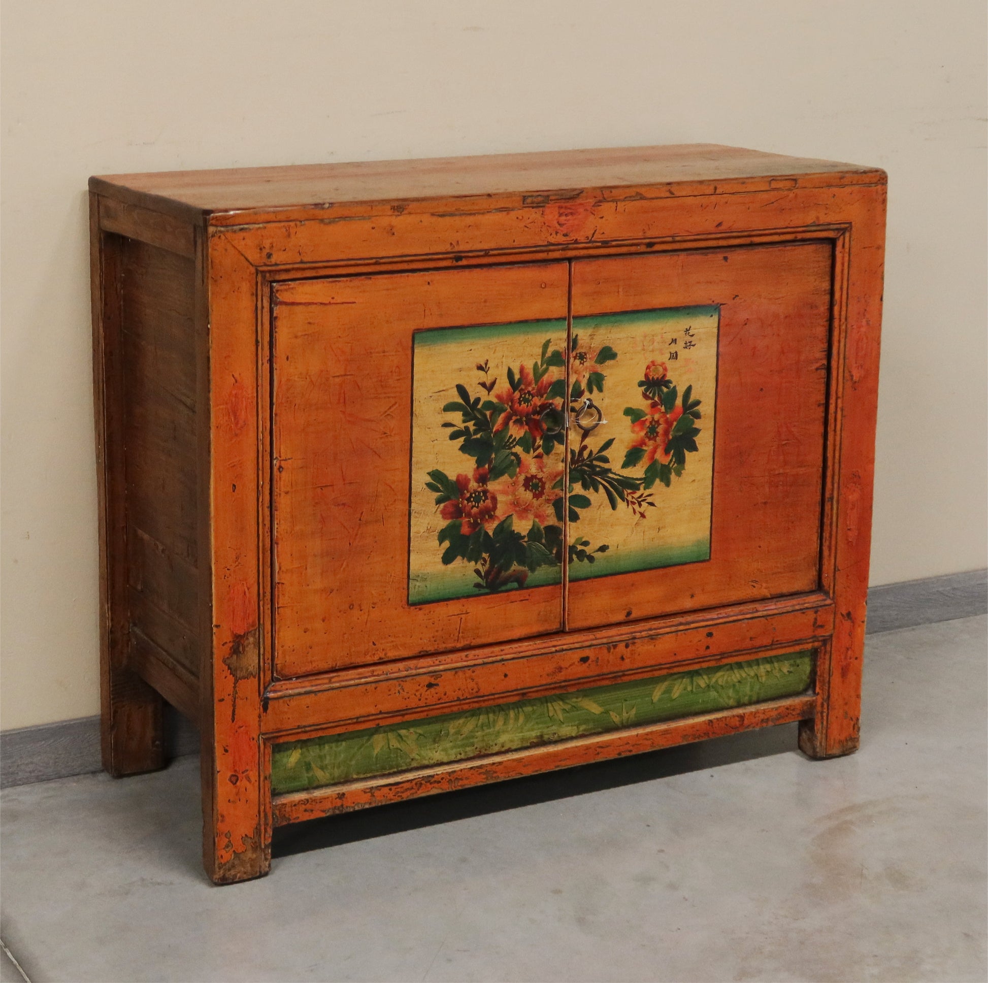 Mobile con struttura in lacca arancio e fronte a doppia anta con decoro floreale inscritto in riquadro su fondo ocra. Provenienza Mongolia Interna Cinese