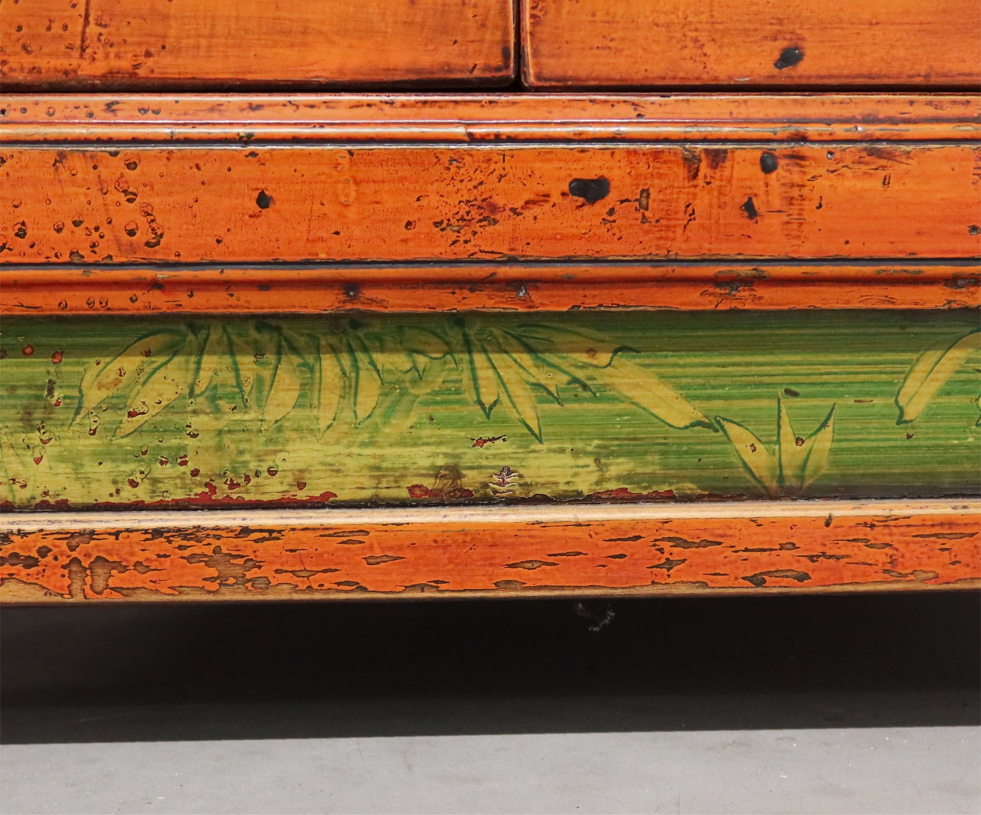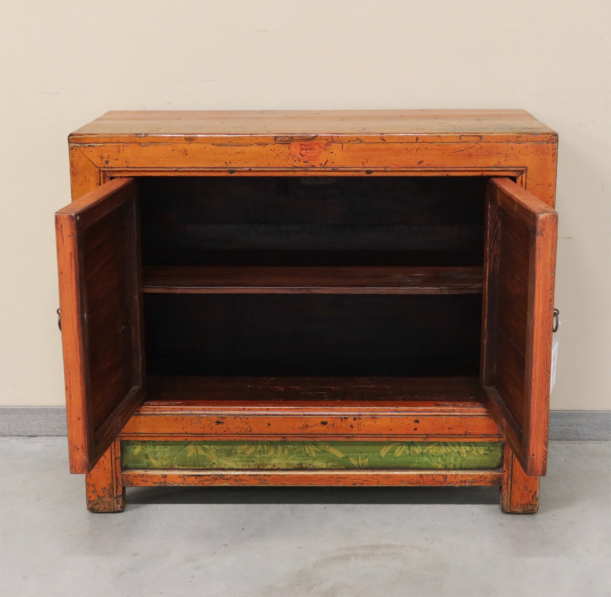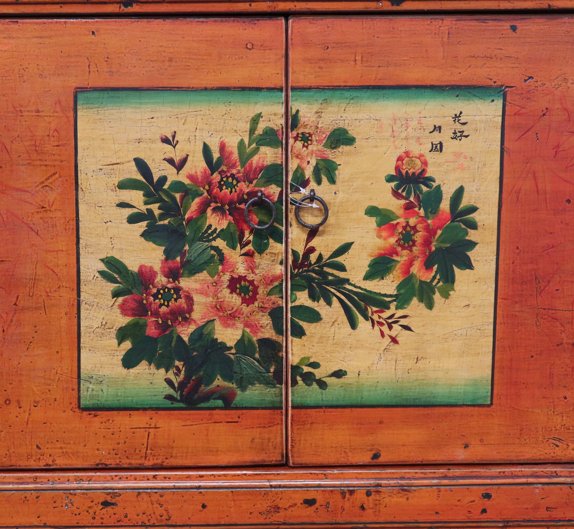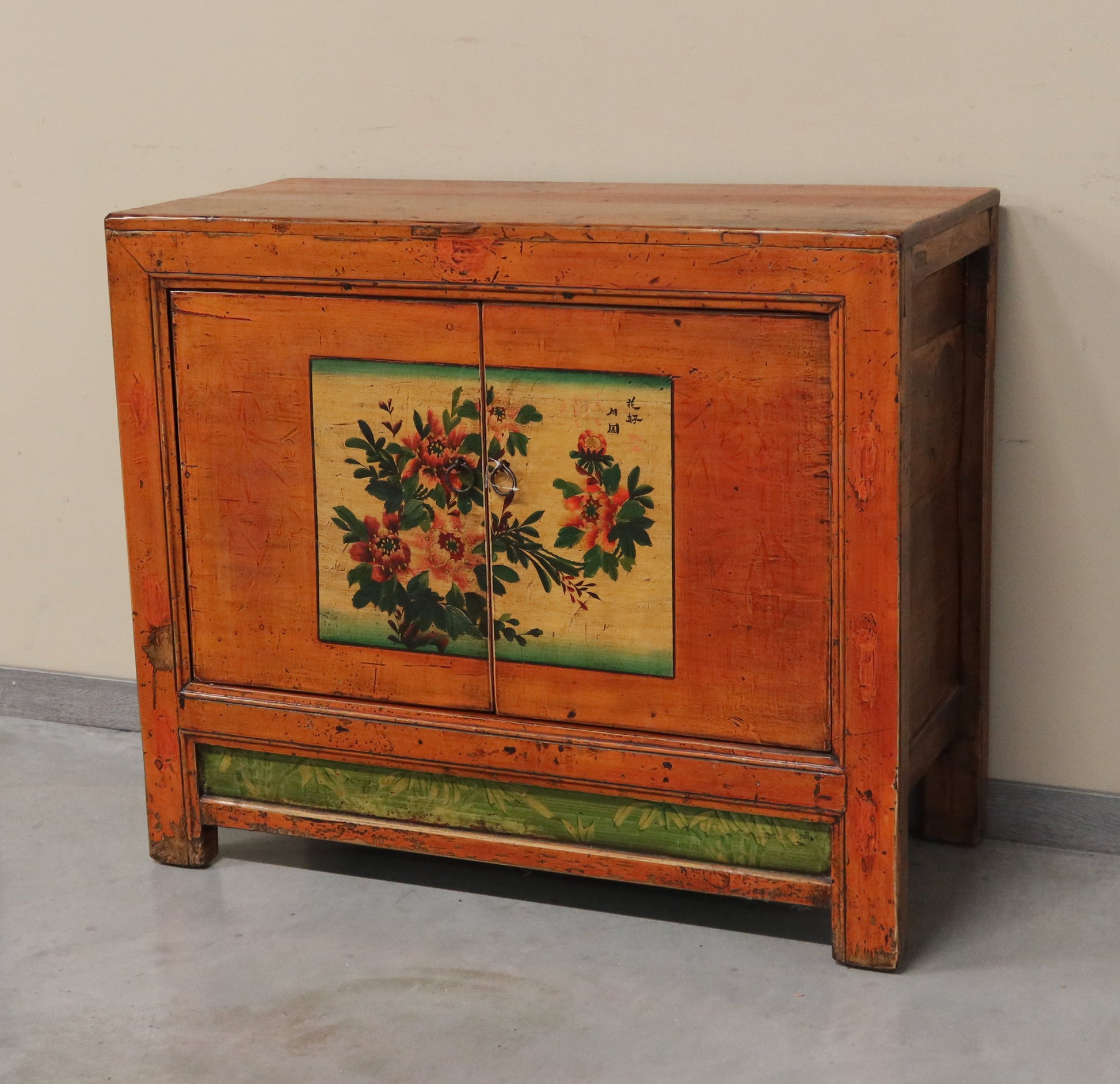 Mobile con struttura in lacca arancio e fronte a doppia anta con decoro floreale inscritto in riquadro su fondo ocra. Provenienza Mongolia Interna Cinese