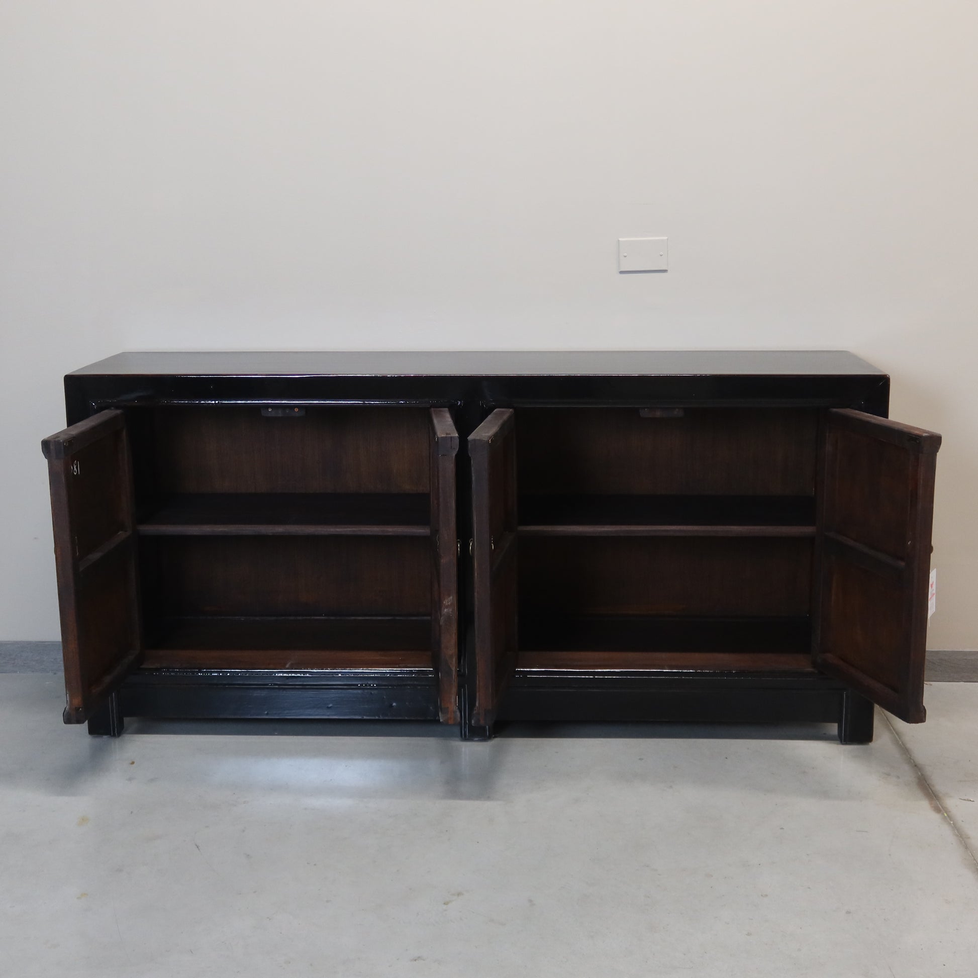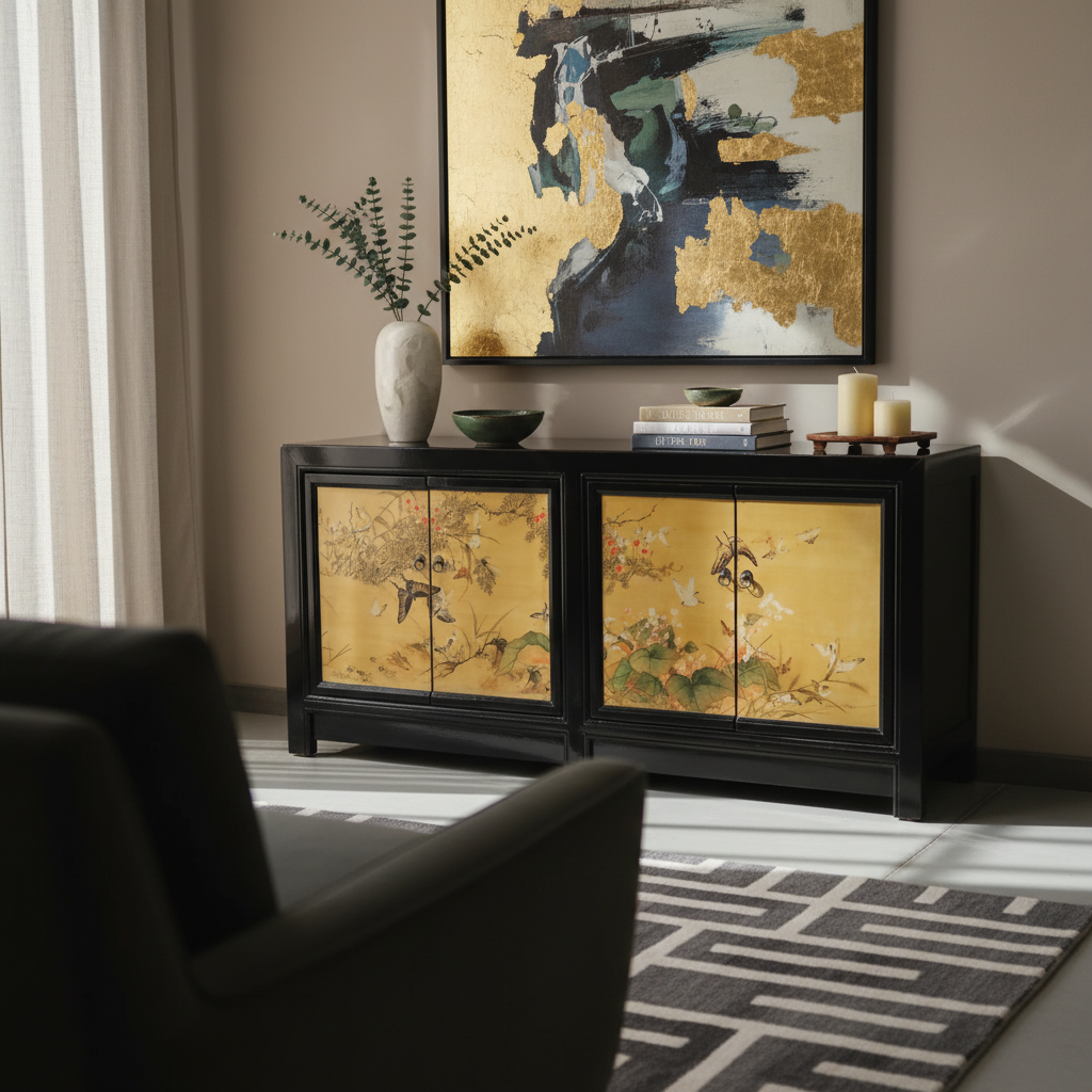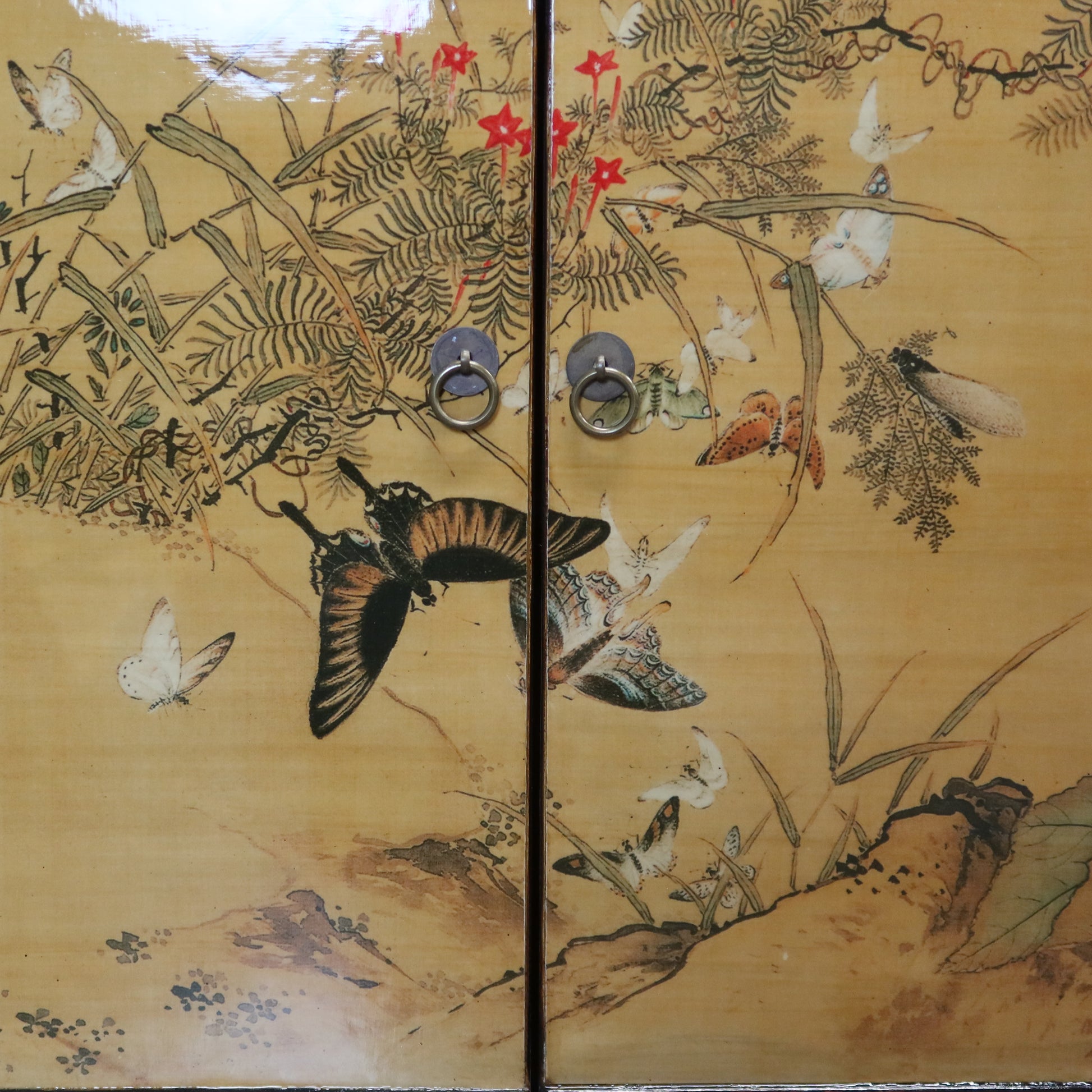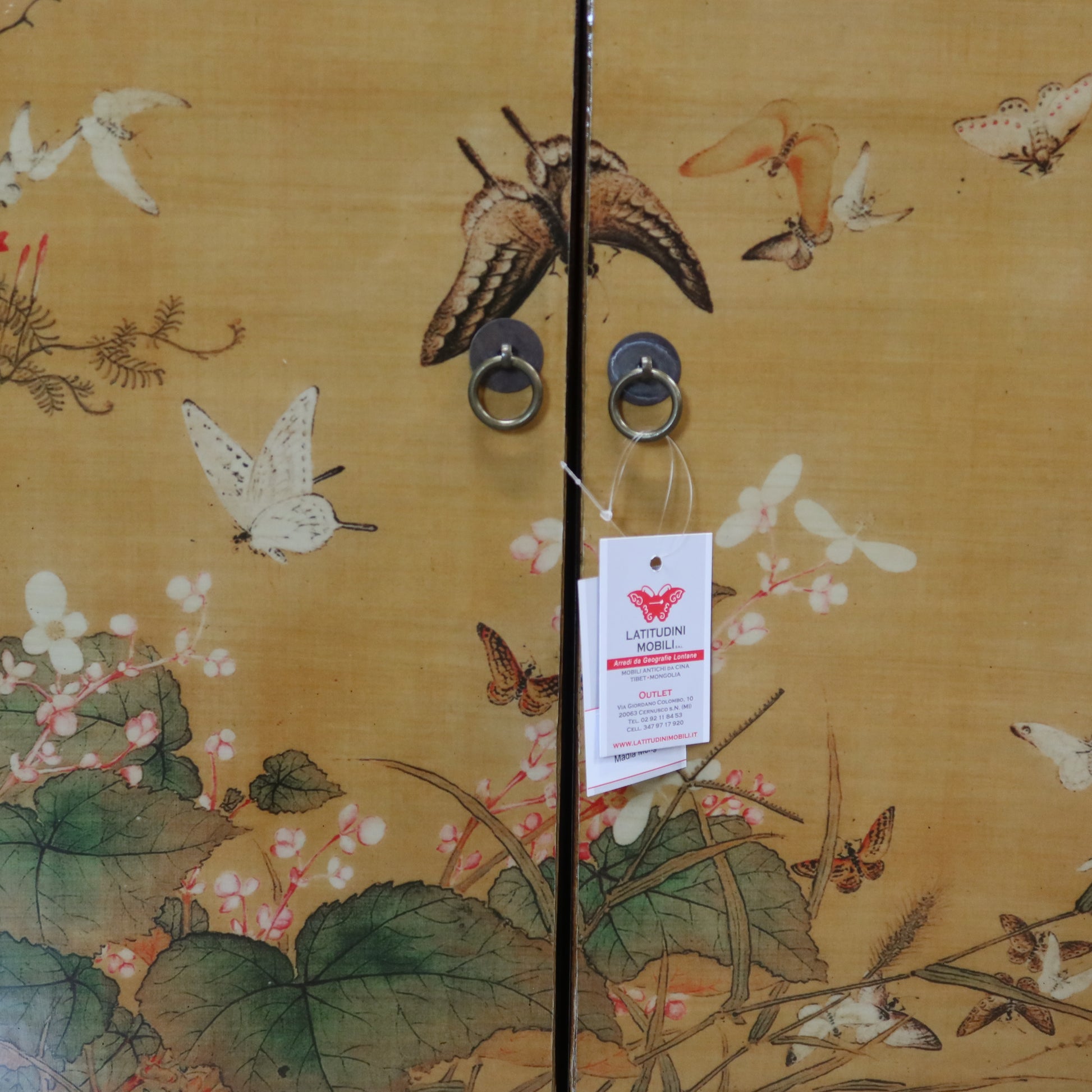 Madia etnica a doppio vano con apertura frontale: questa bella credenza ha un delicato decoro pittorico su tela applicato su legno ed è un mobile adattissimo da inserire in una zona giorno, come anche una camera da letto od uno studio.