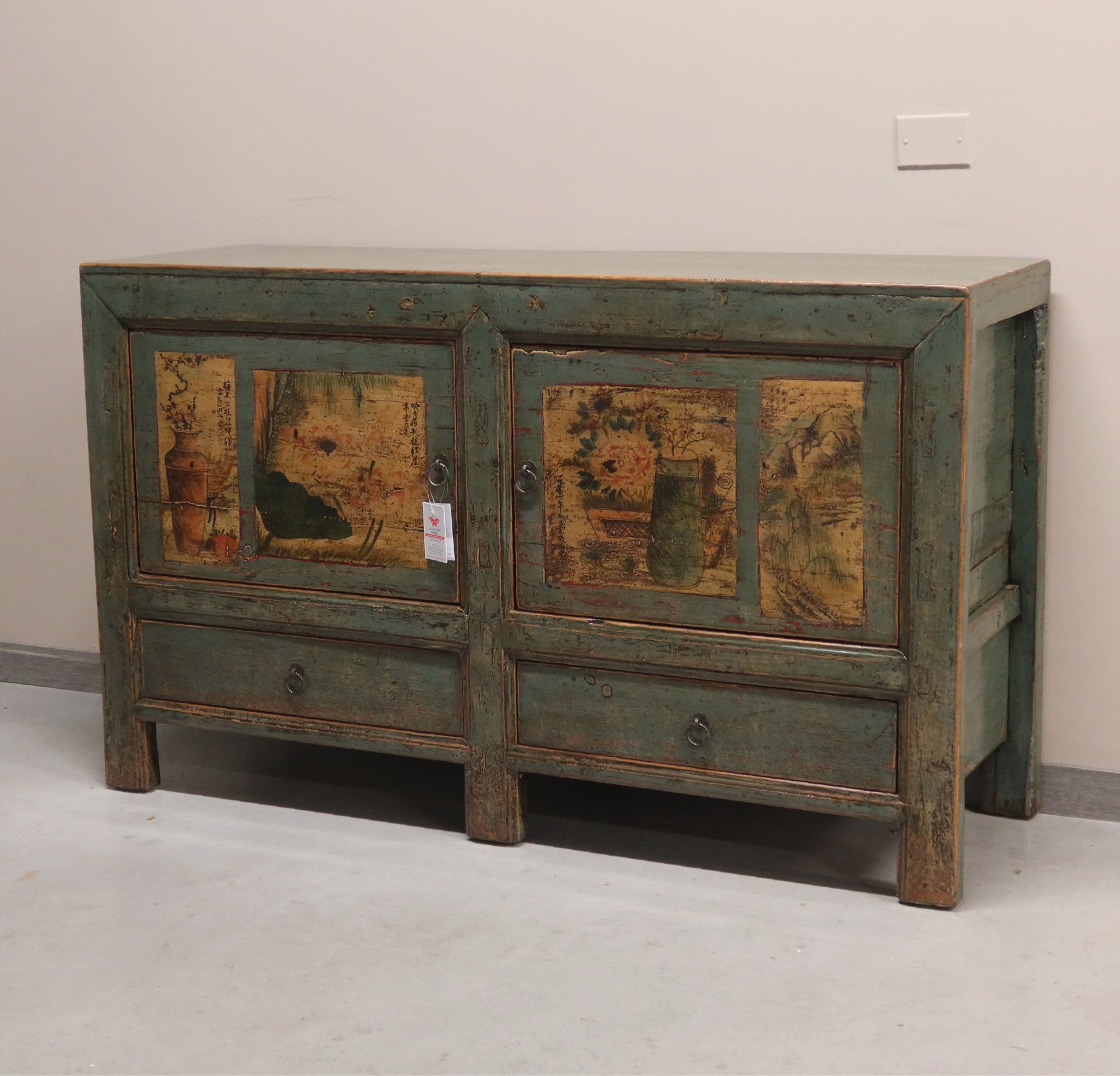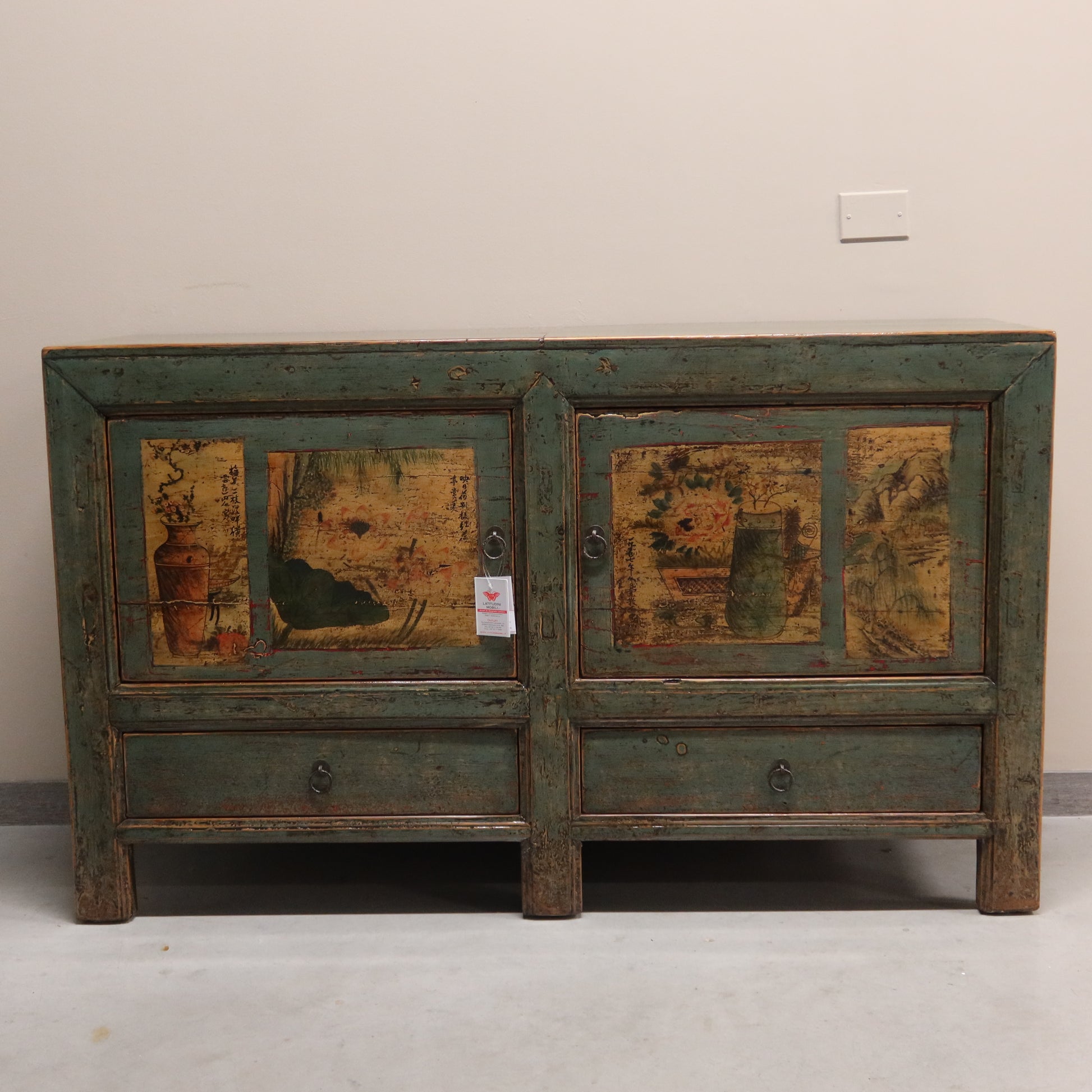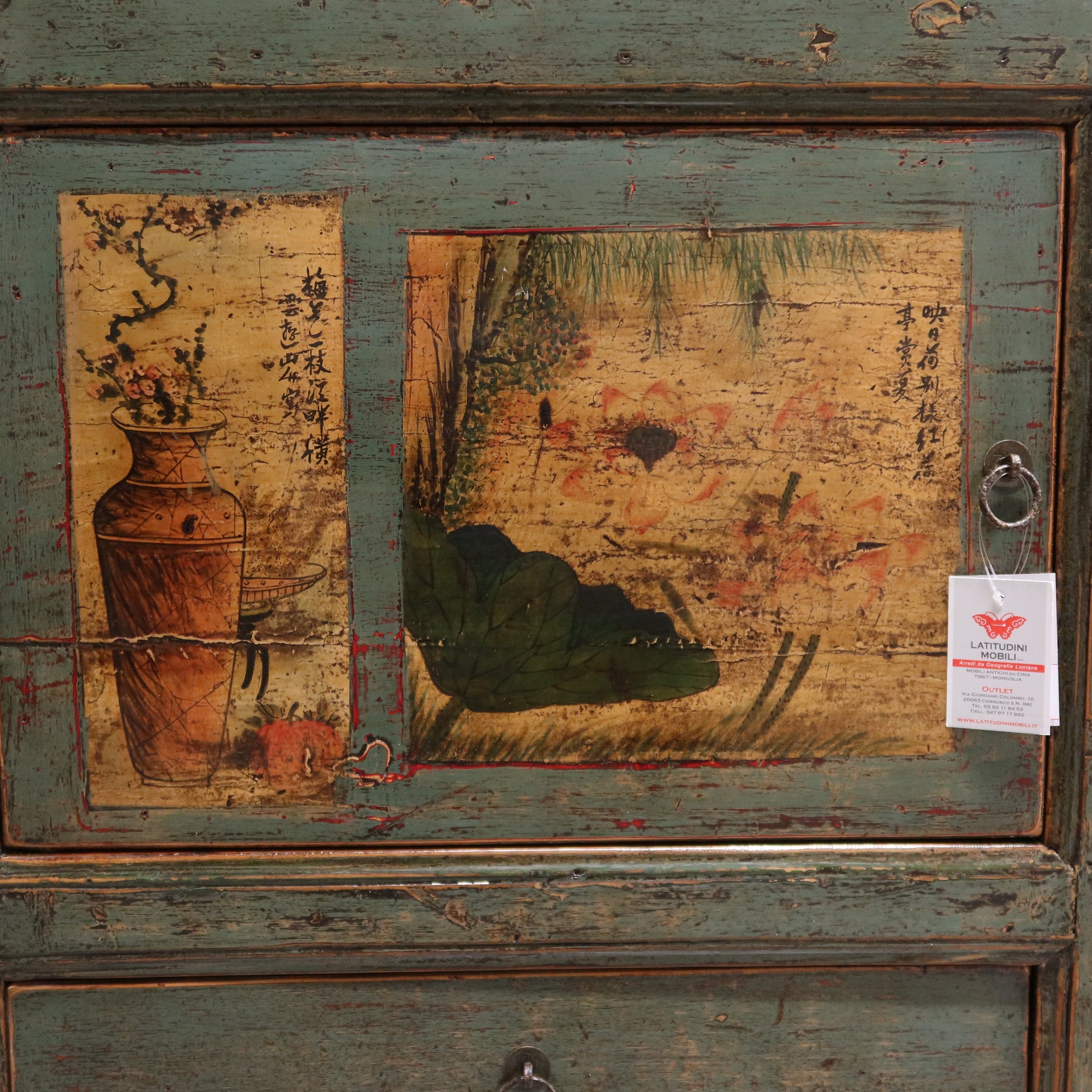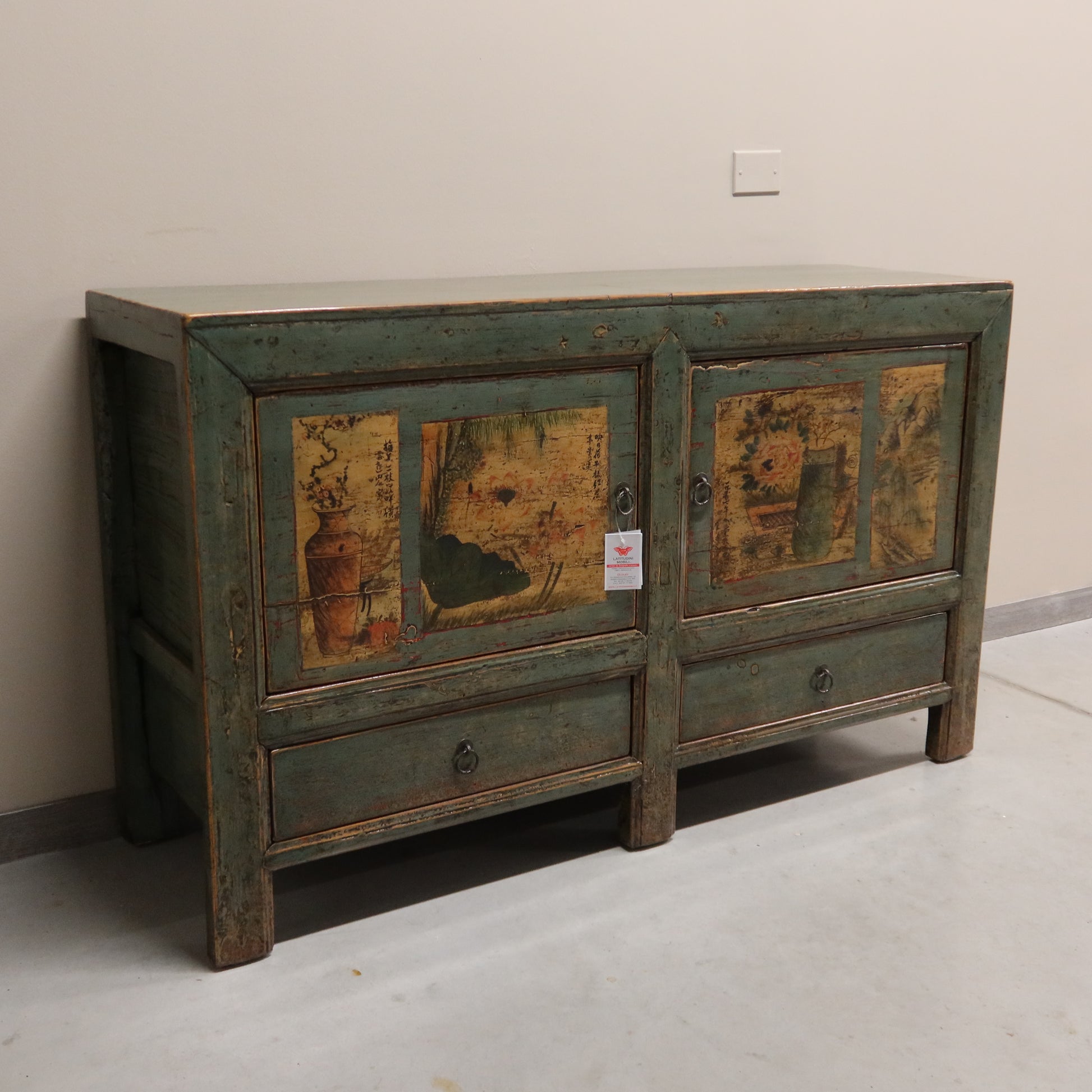 Madia etnica a doppio vano con apertura frontale: questa bella credenza ha un delicato decoro pittorico sul fronte ed è un mobile adattissimo da inserire in una zona giorno, come anche una camera da letto od uno studio.