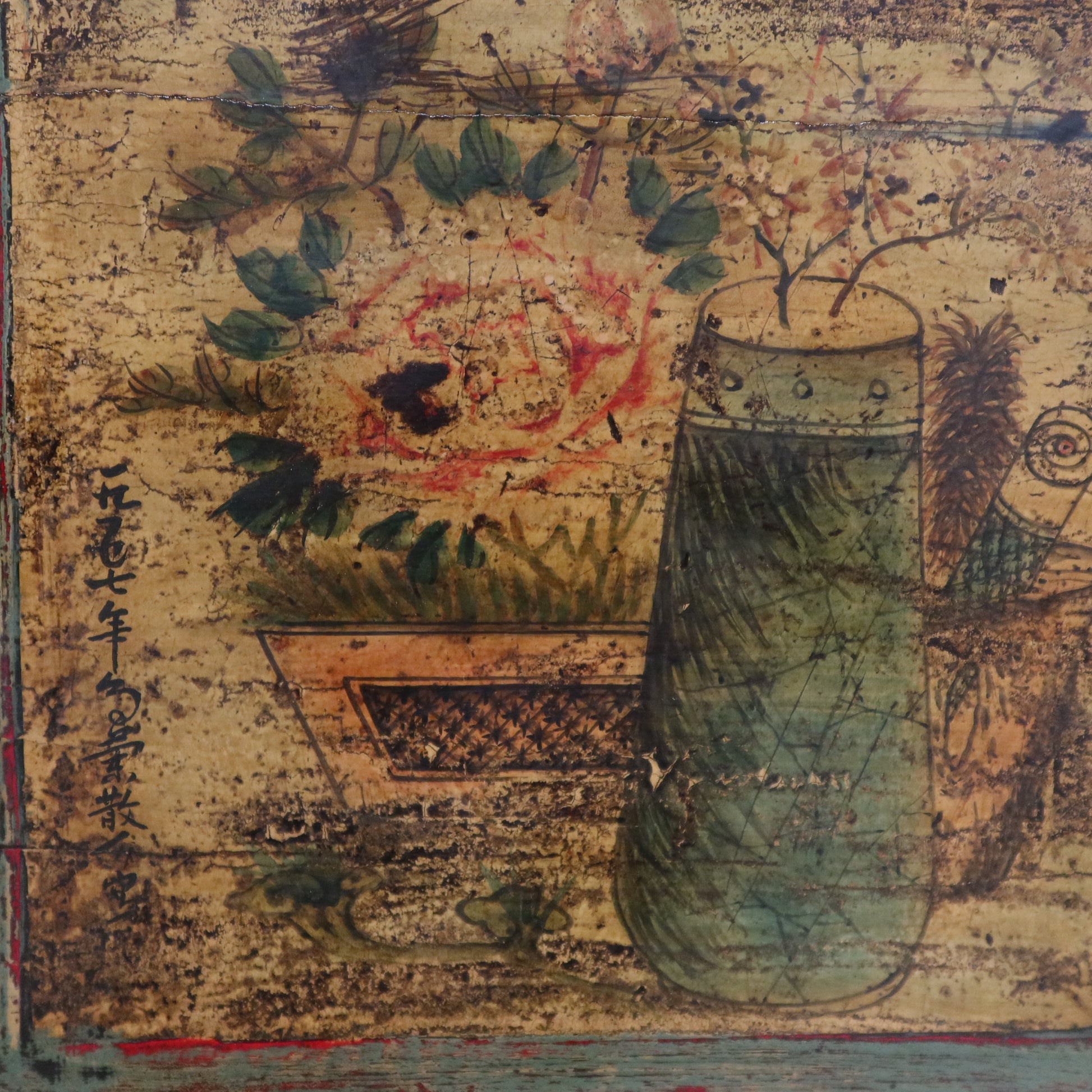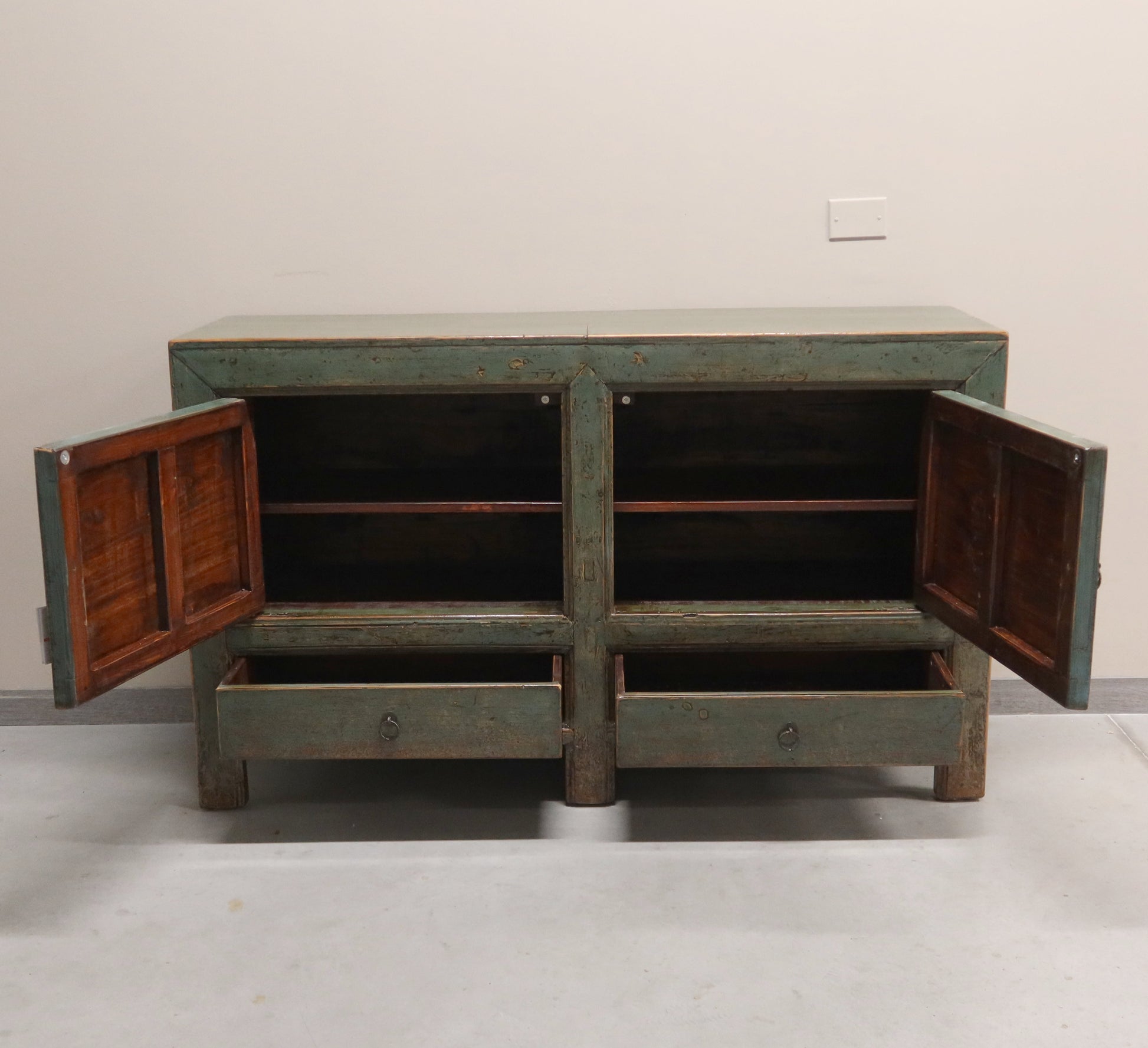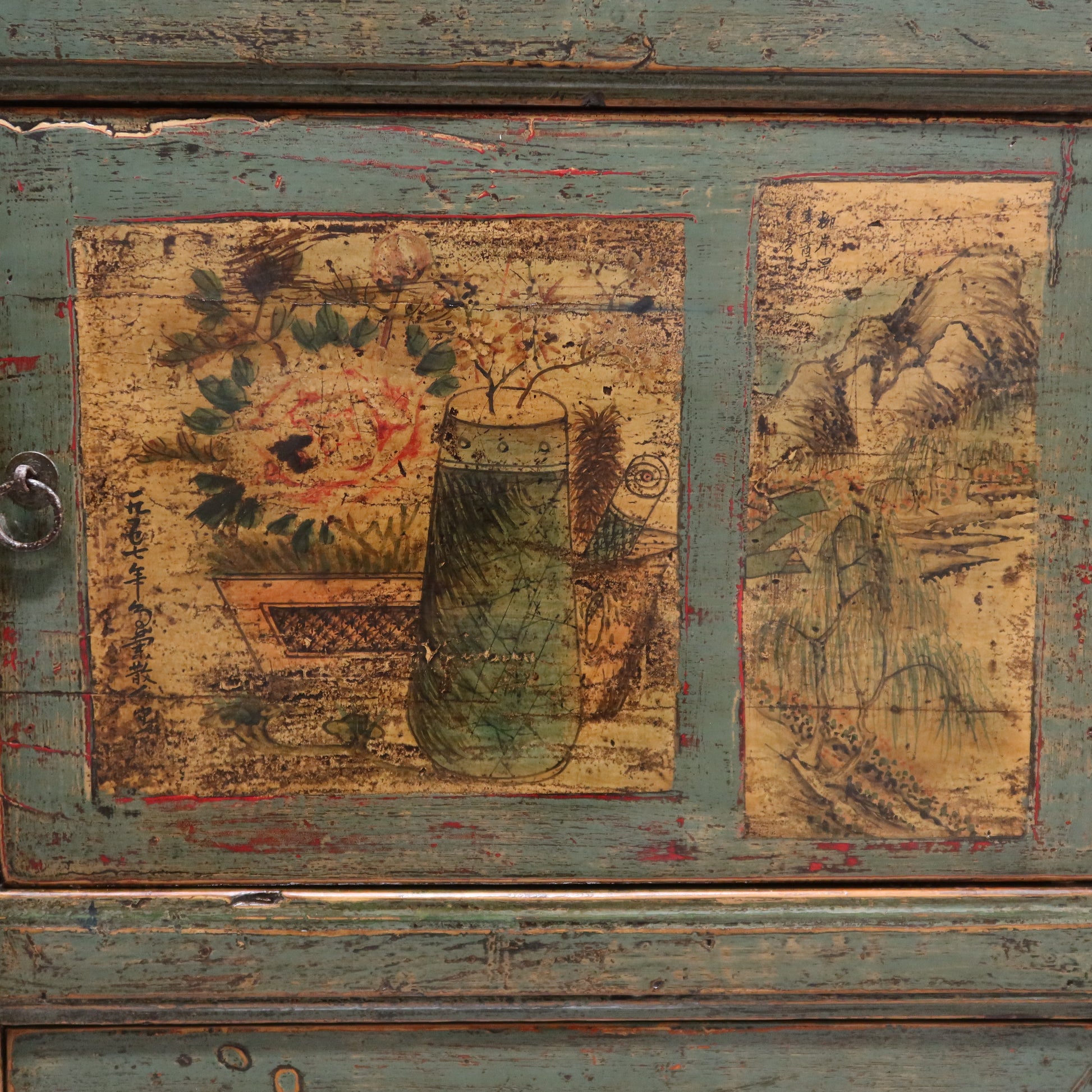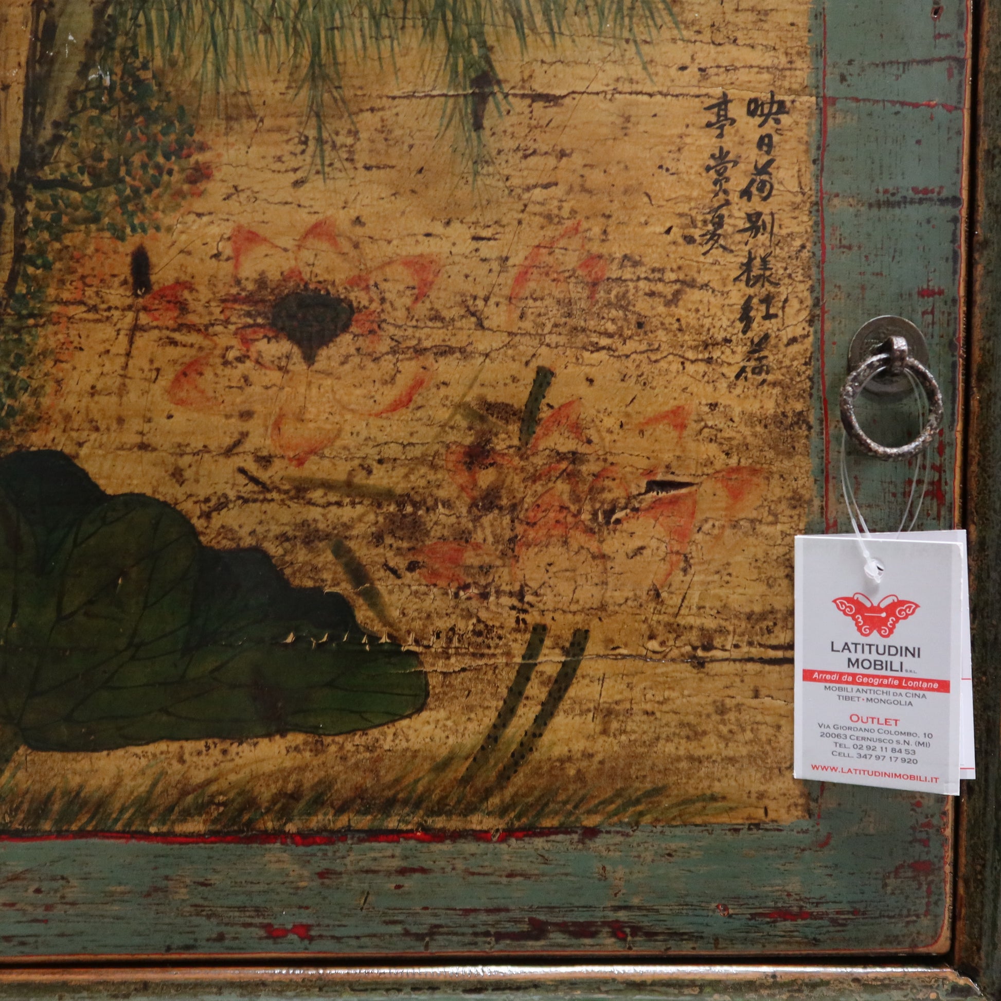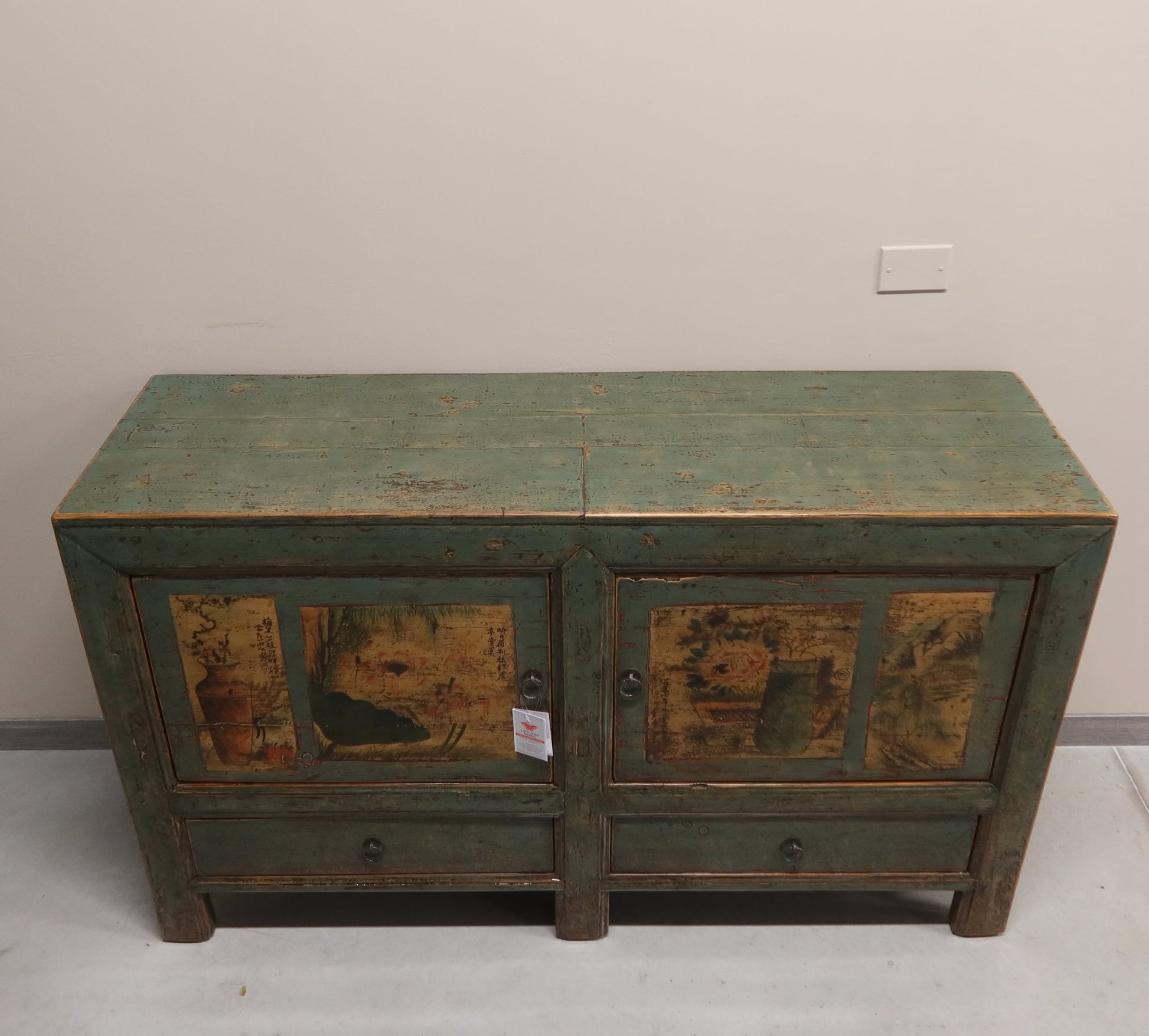 Madia etnica a doppio vano con apertura frontale: questa bella credenza ha un delicato decoro pittorico sul fronte ed è un mobile adattissimo da inserire in una zona giorno, come anche una camera da letto od uno studio.