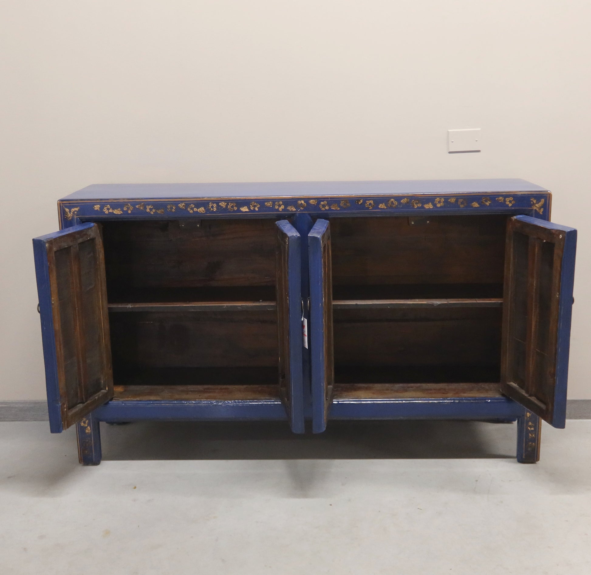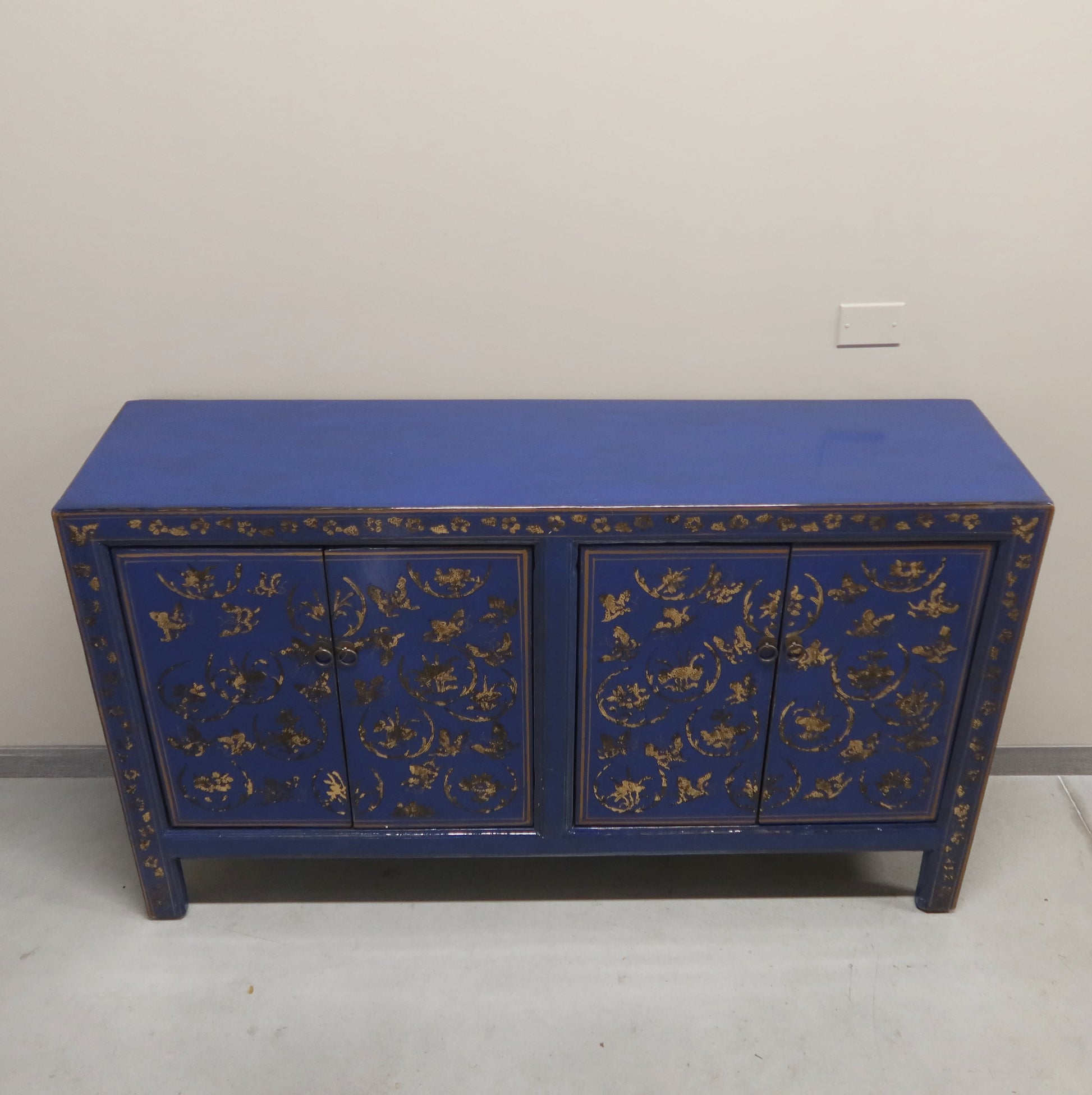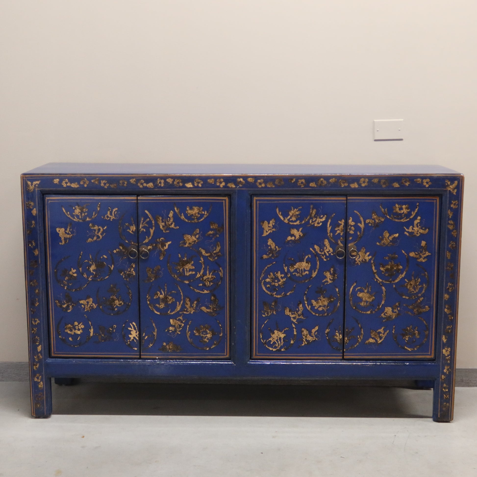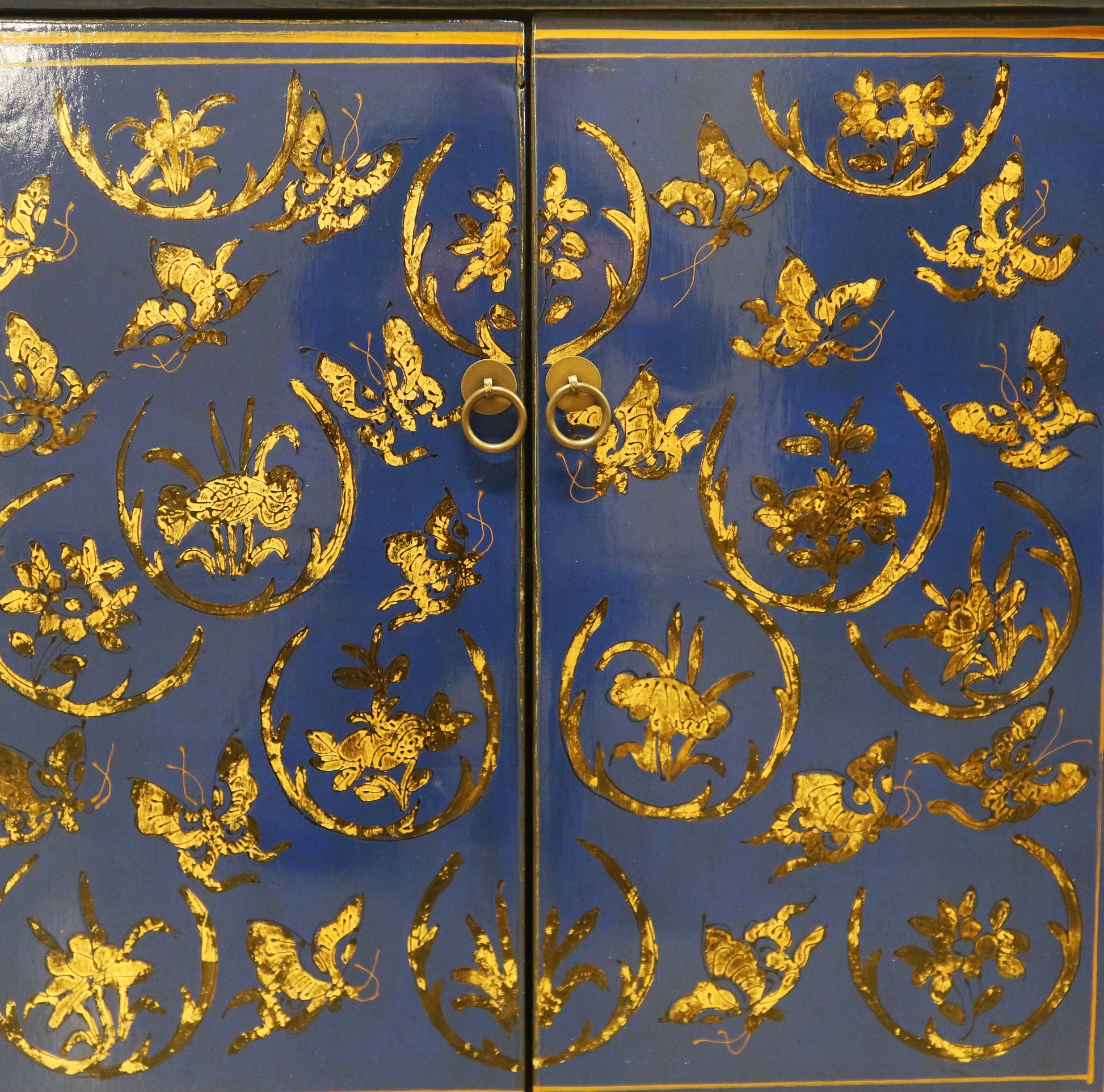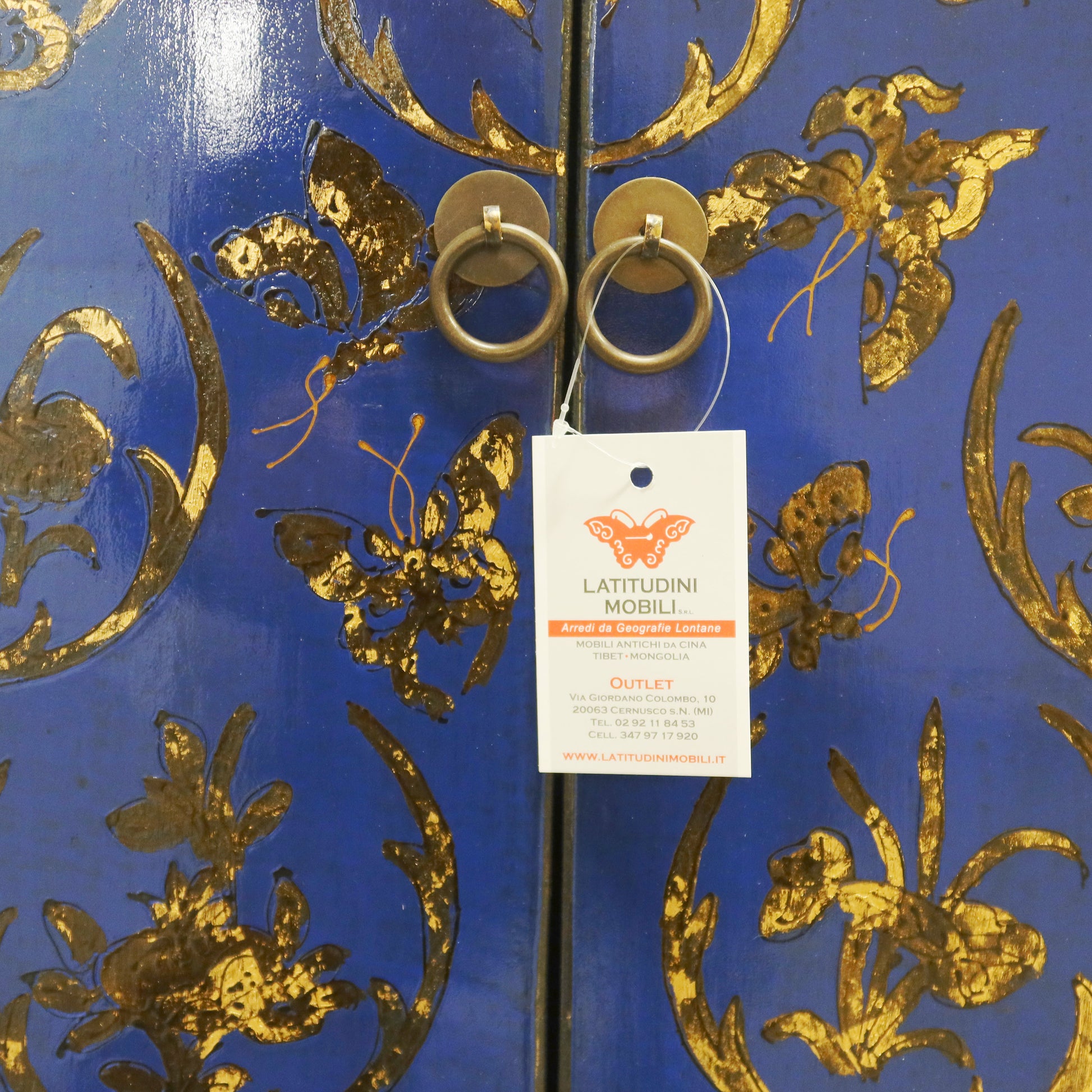 Madia etnica a 4 ante con struttura in lacca blu e pannelli con decorazioni dorate. Provenienza regione dello Shanxi.