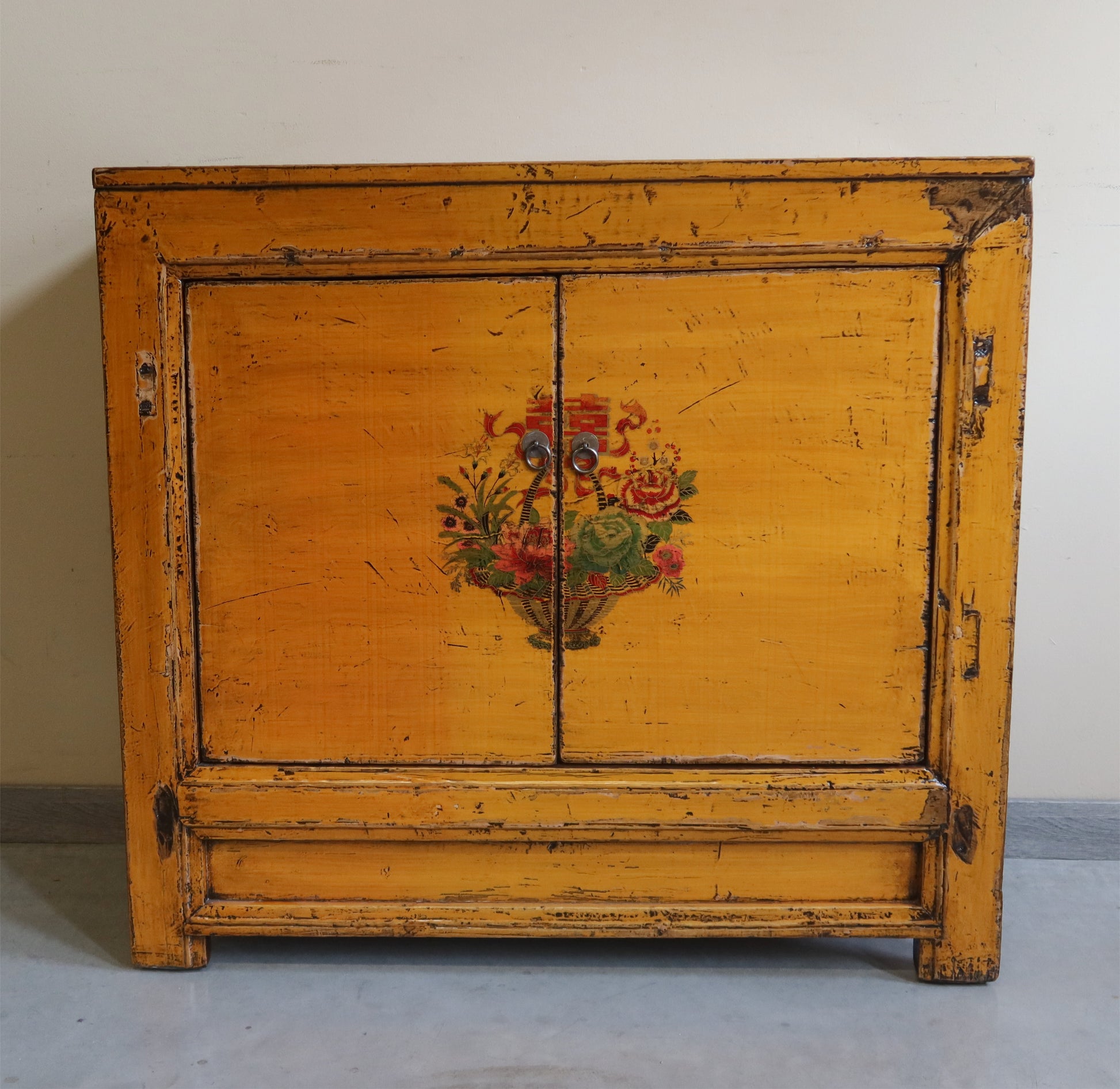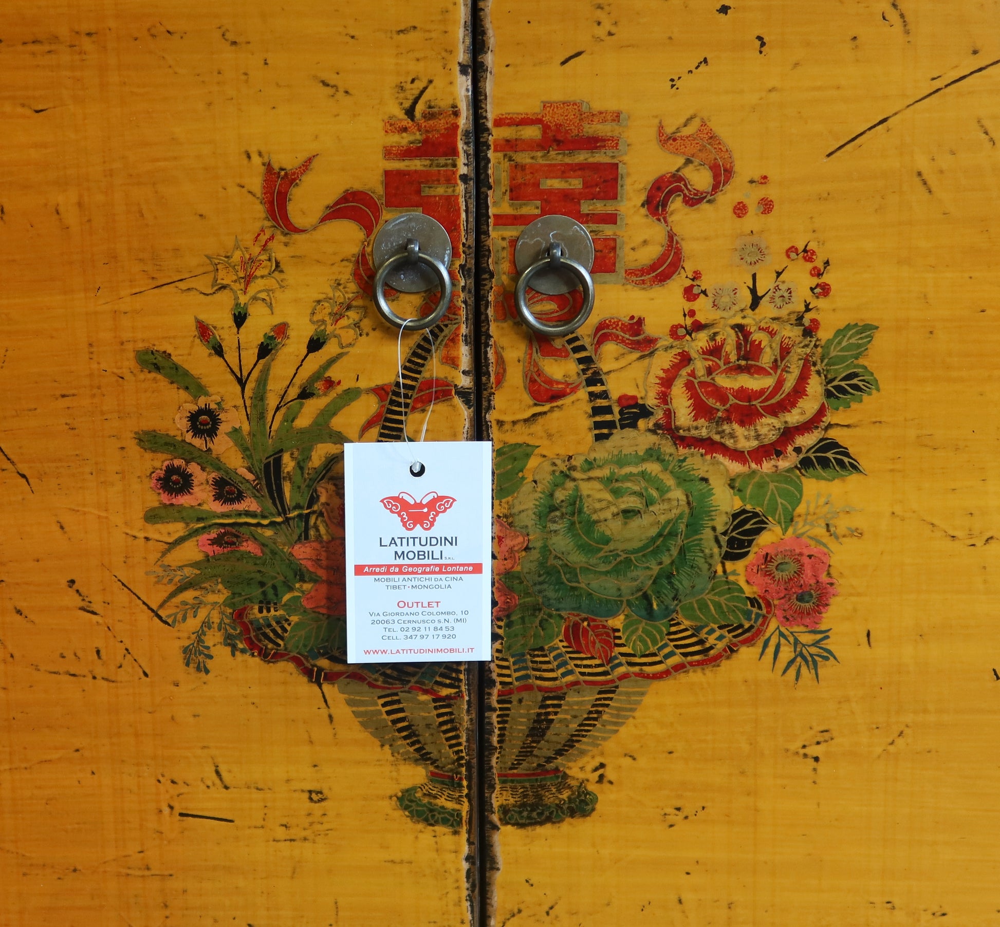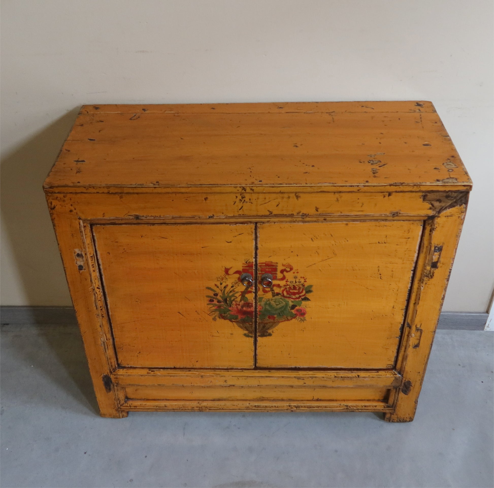 Madietta etnica a doppia anta con decoro floreale su fondo in lacca arancio.