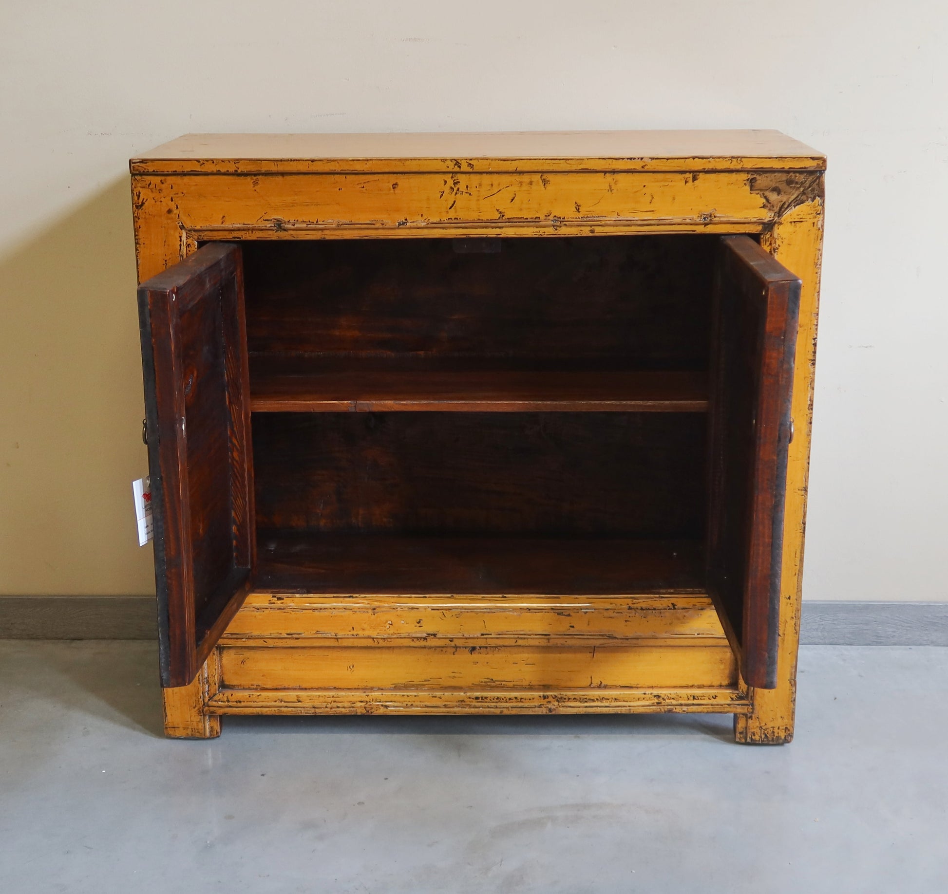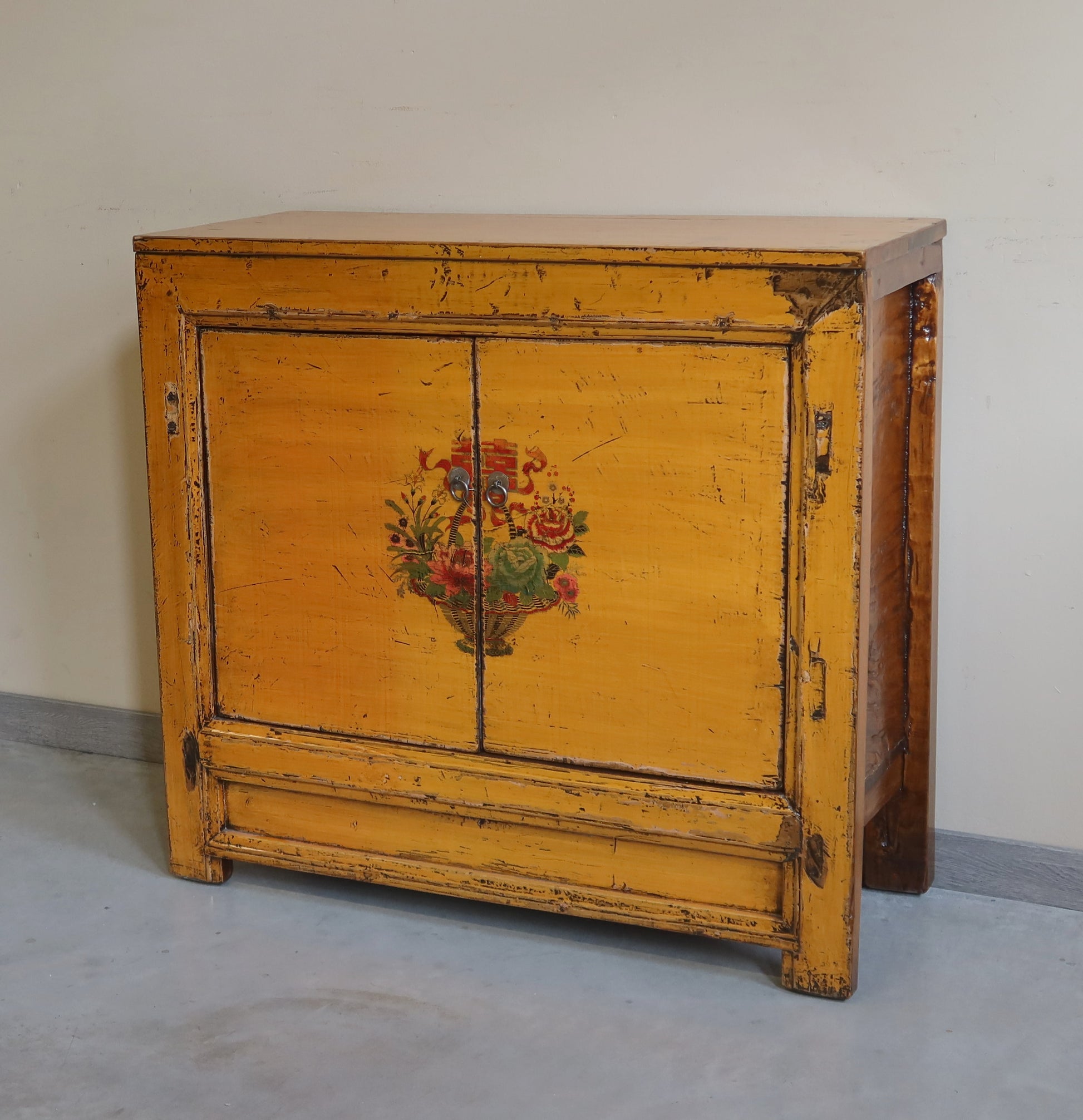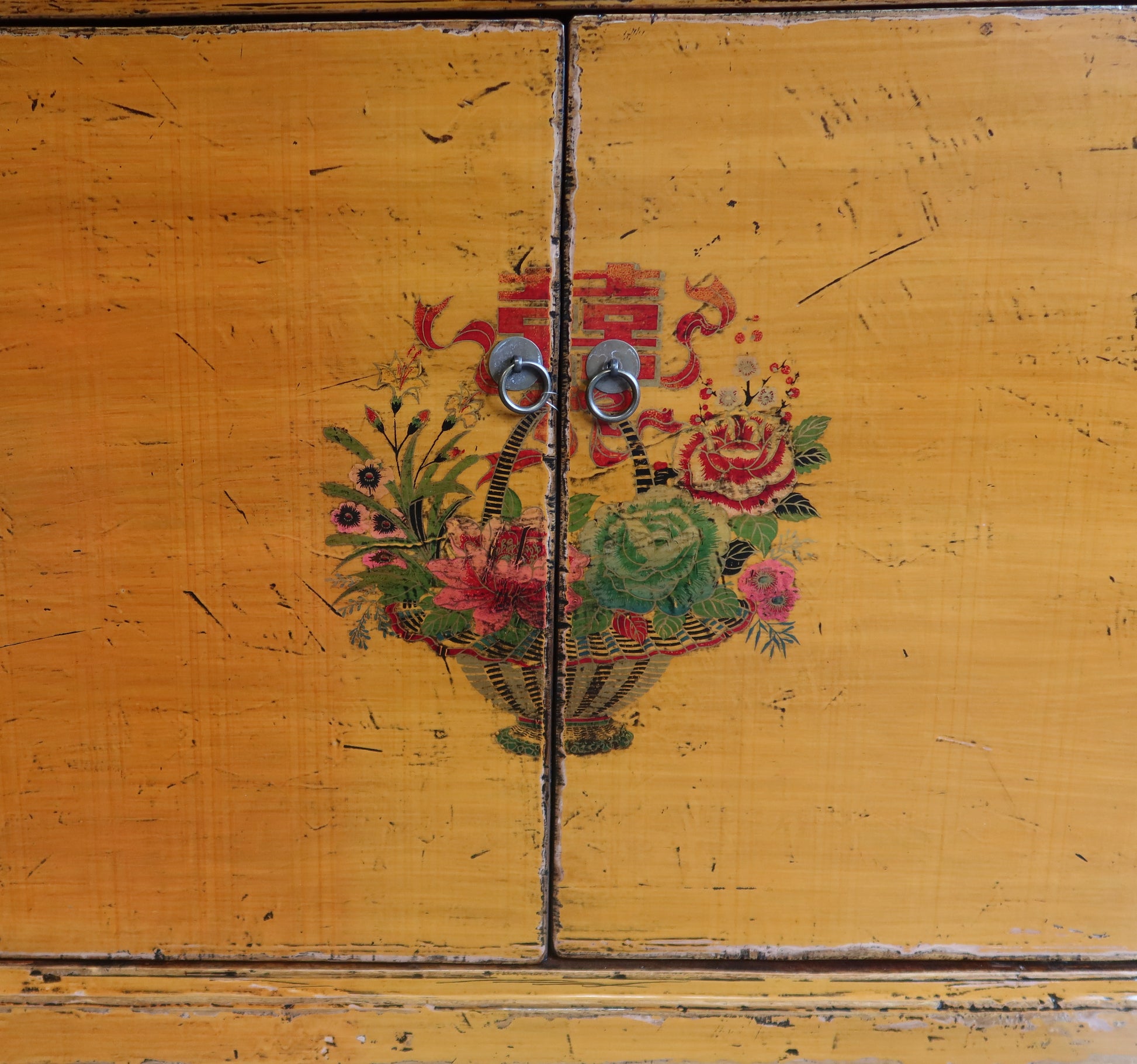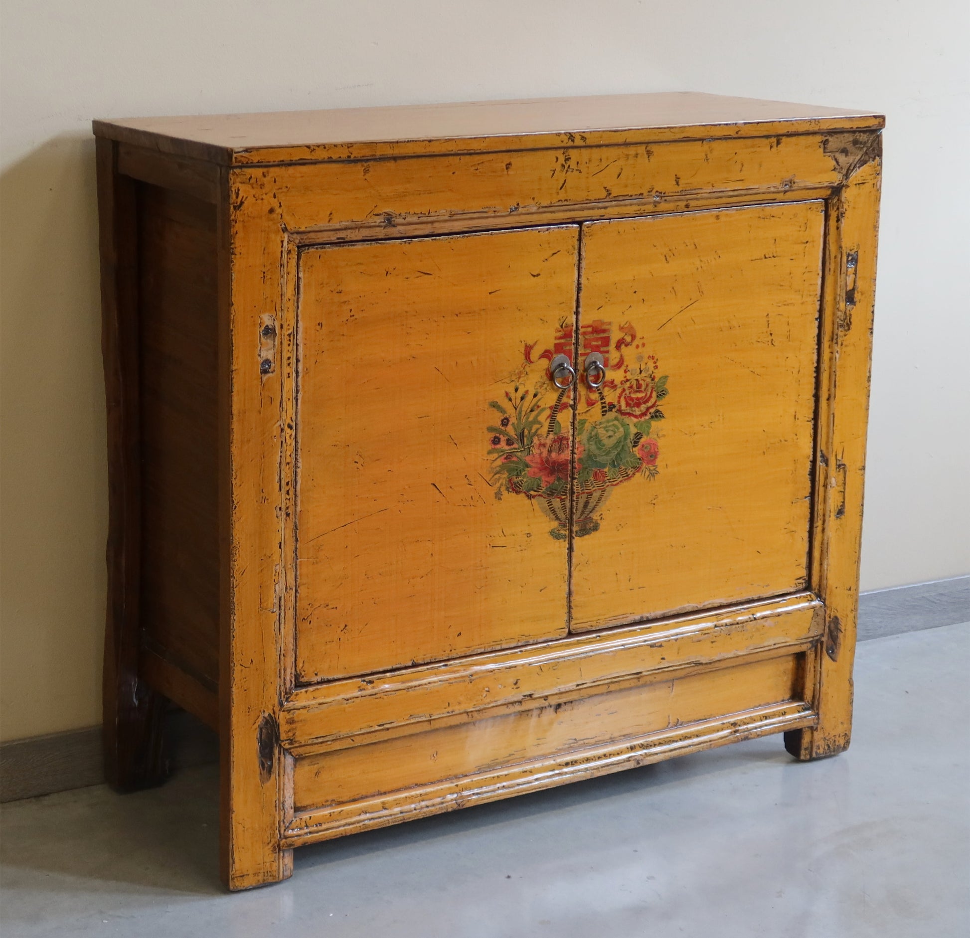 Madietta etnica a doppia anta con decoro floreale su fondo in lacca arancio.