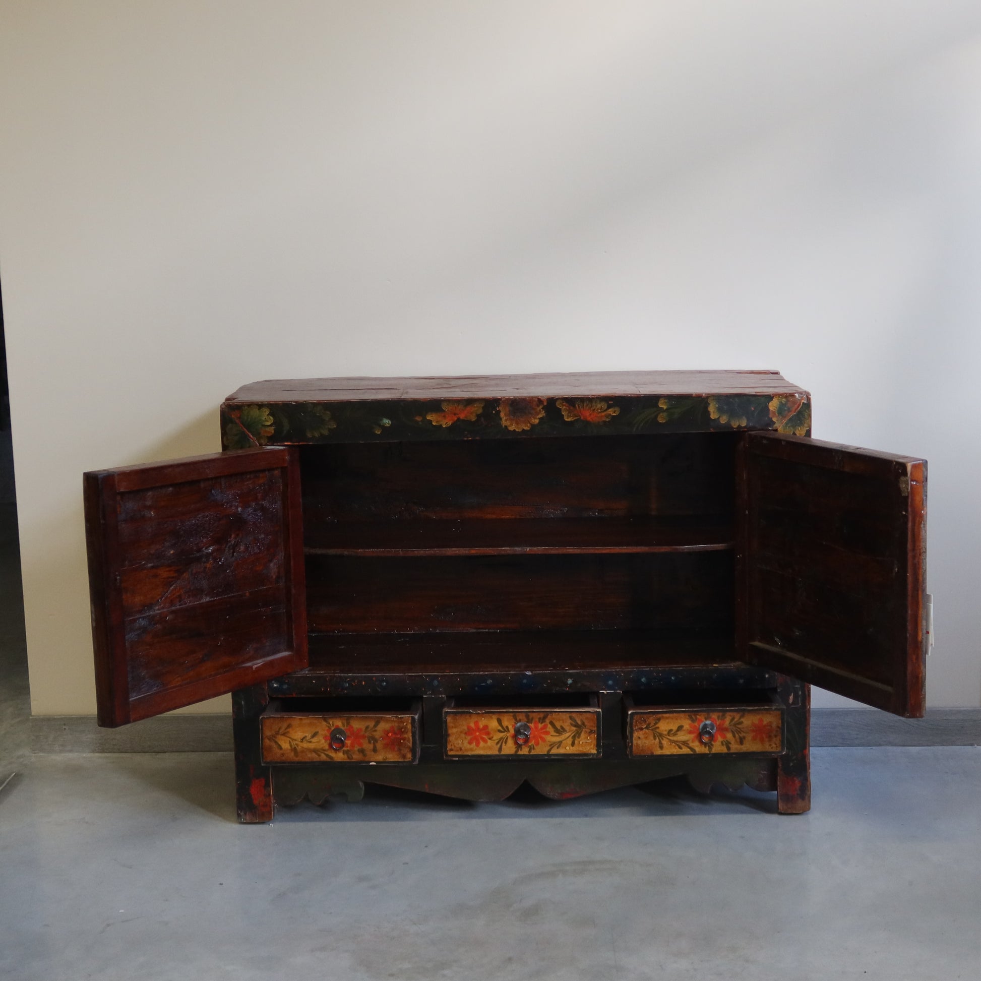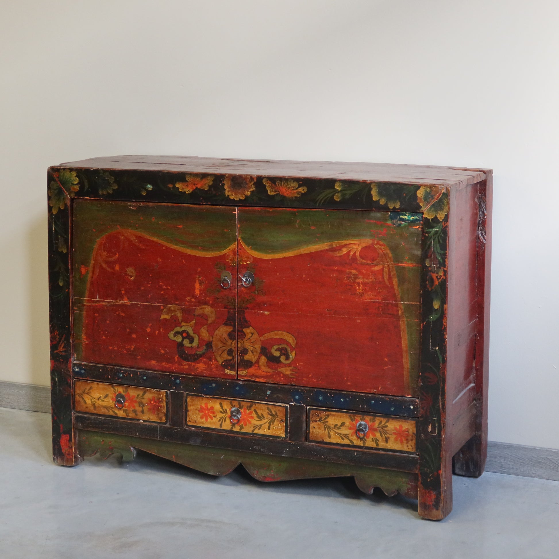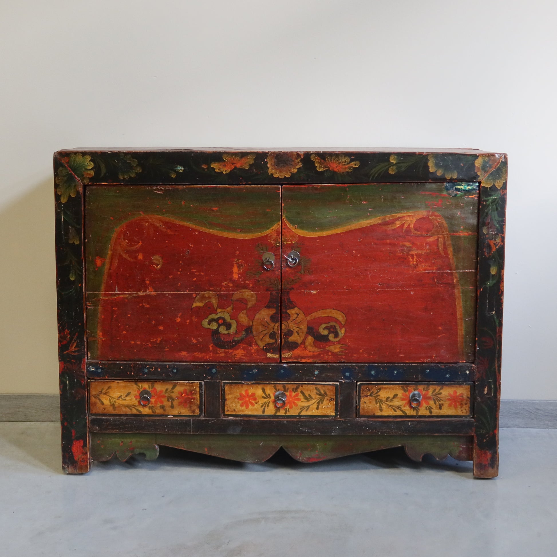 Madia a due ante in lacca con caratteristico decoro sulle ante e cassetti: provenienza Regione del Ganzu (Cina settentrionale).