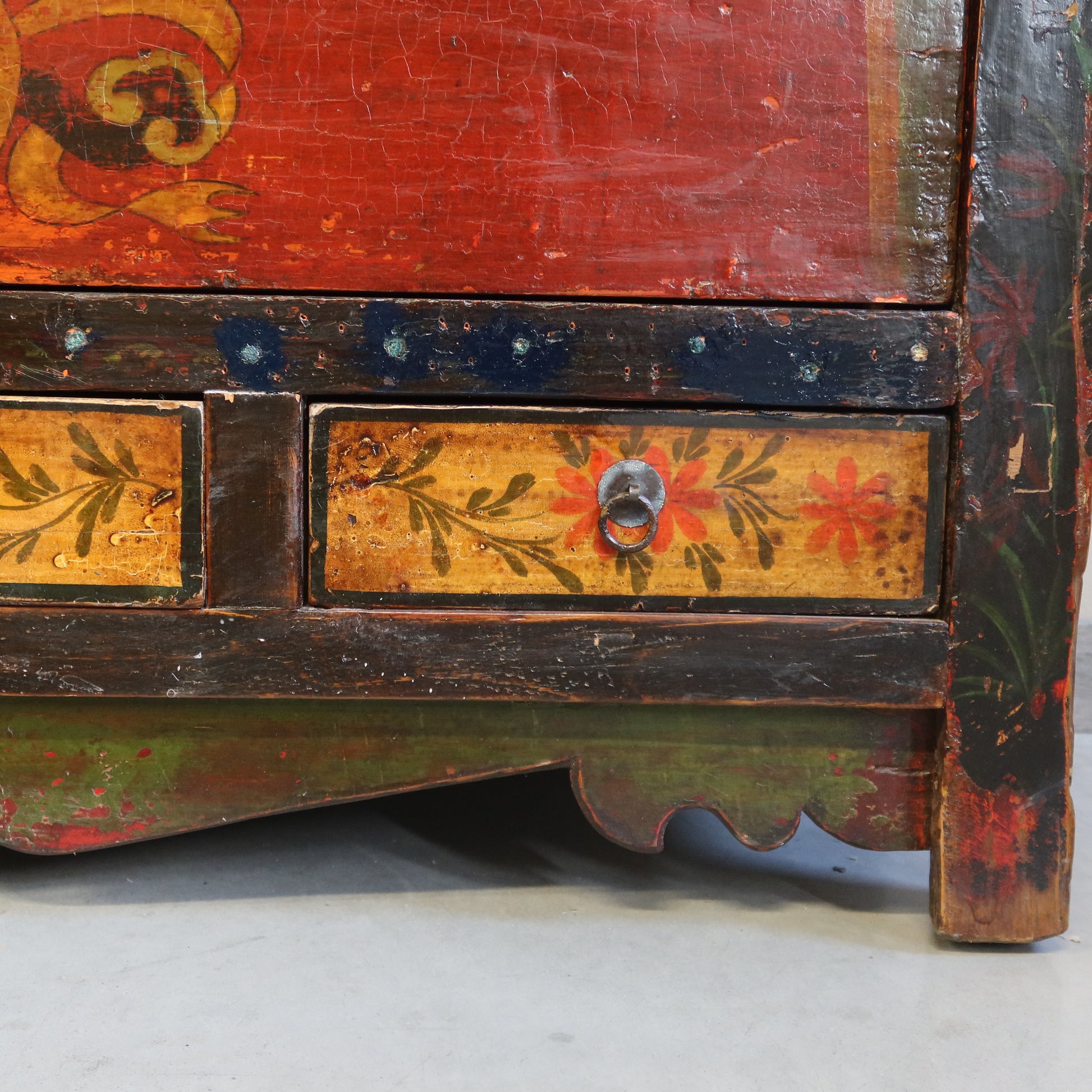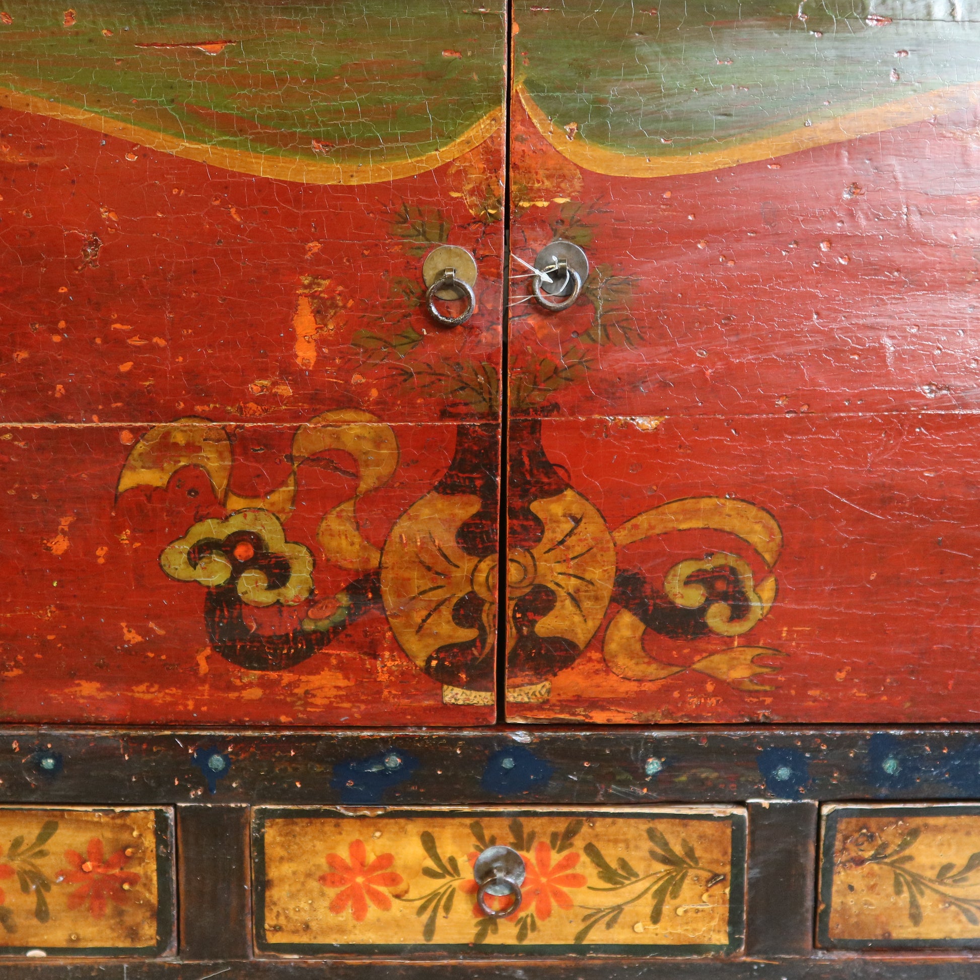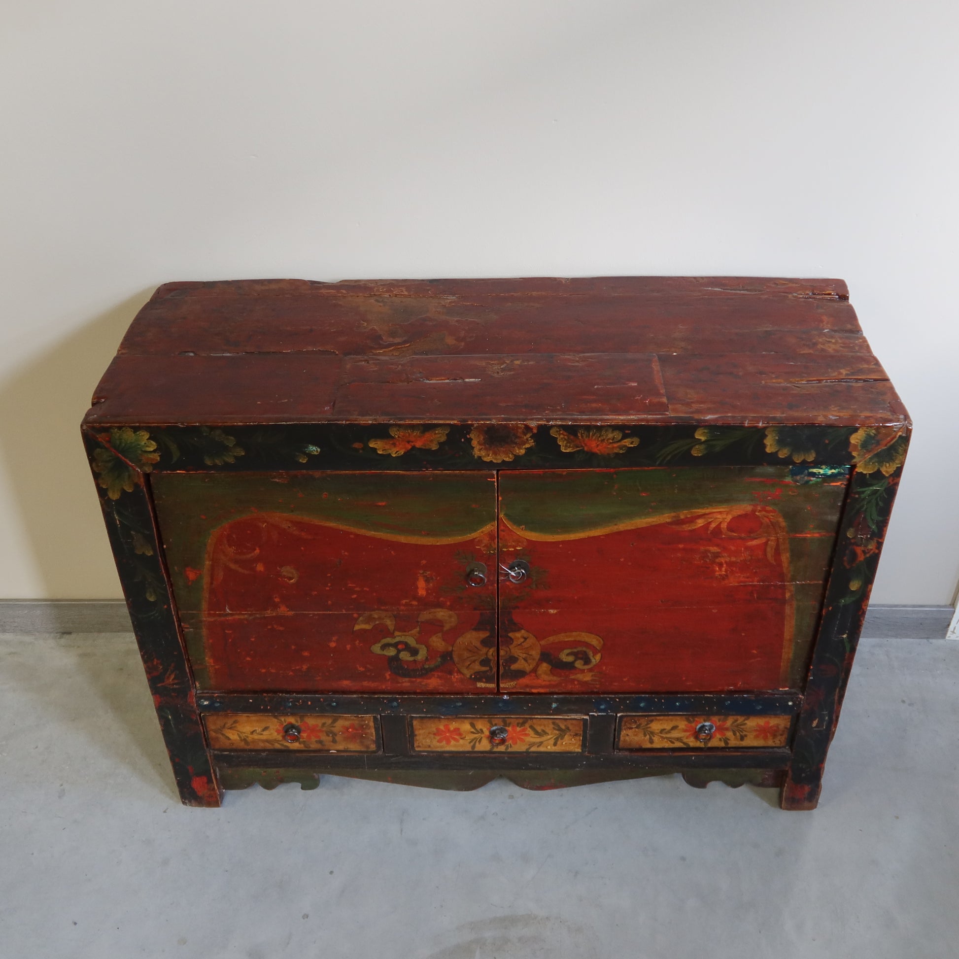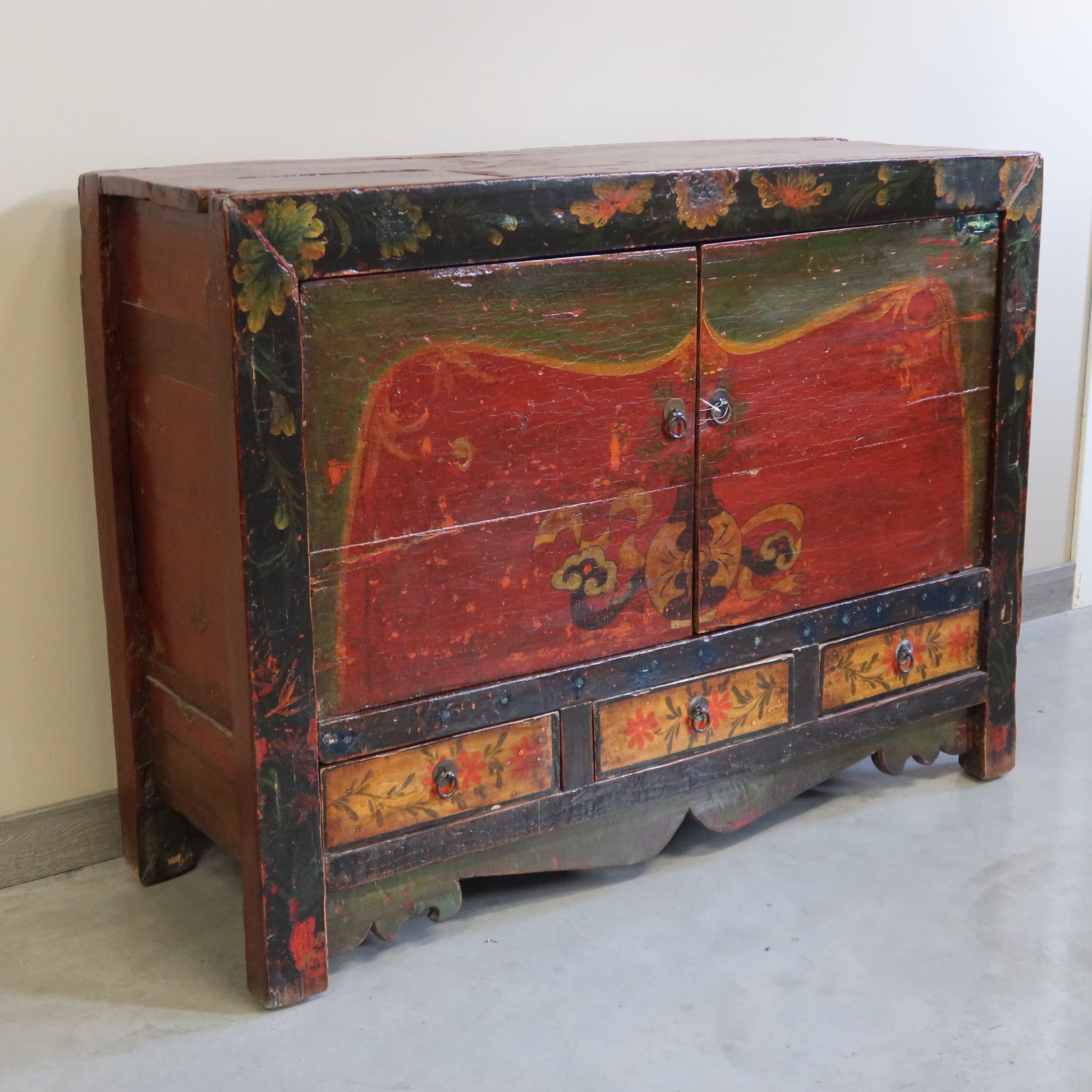 Madia a due ante in lacca con caratteristico decoro sulle ante e cassetti: provenienza Regione del Ganzu (Cina settentrionale).