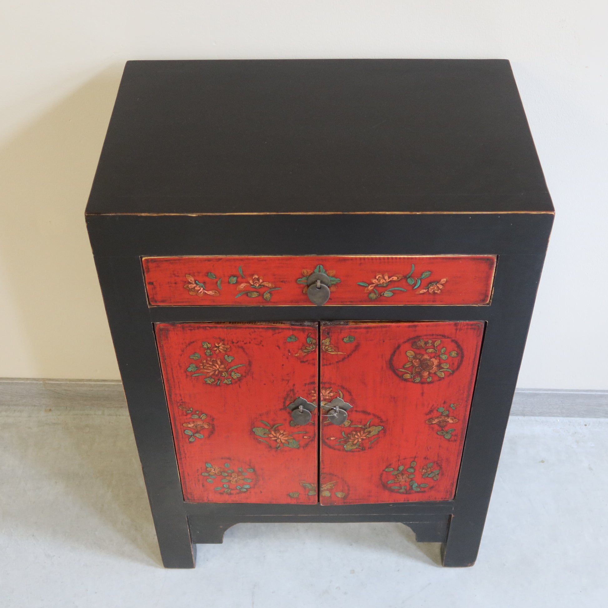 Mobiletto cinese a un cassetto e doppia anta con il fronte in lacca rossa con decoro caratteristico della regione di provenienza; la struttura è in lacca nera . Provenienza dalla regione dello Shanxi.