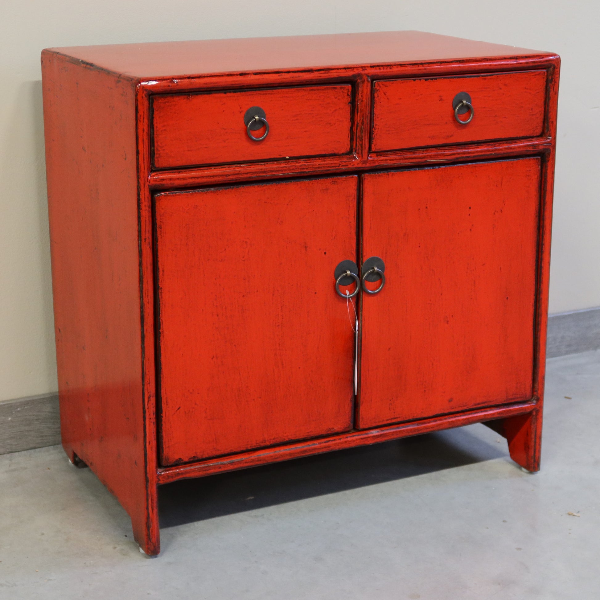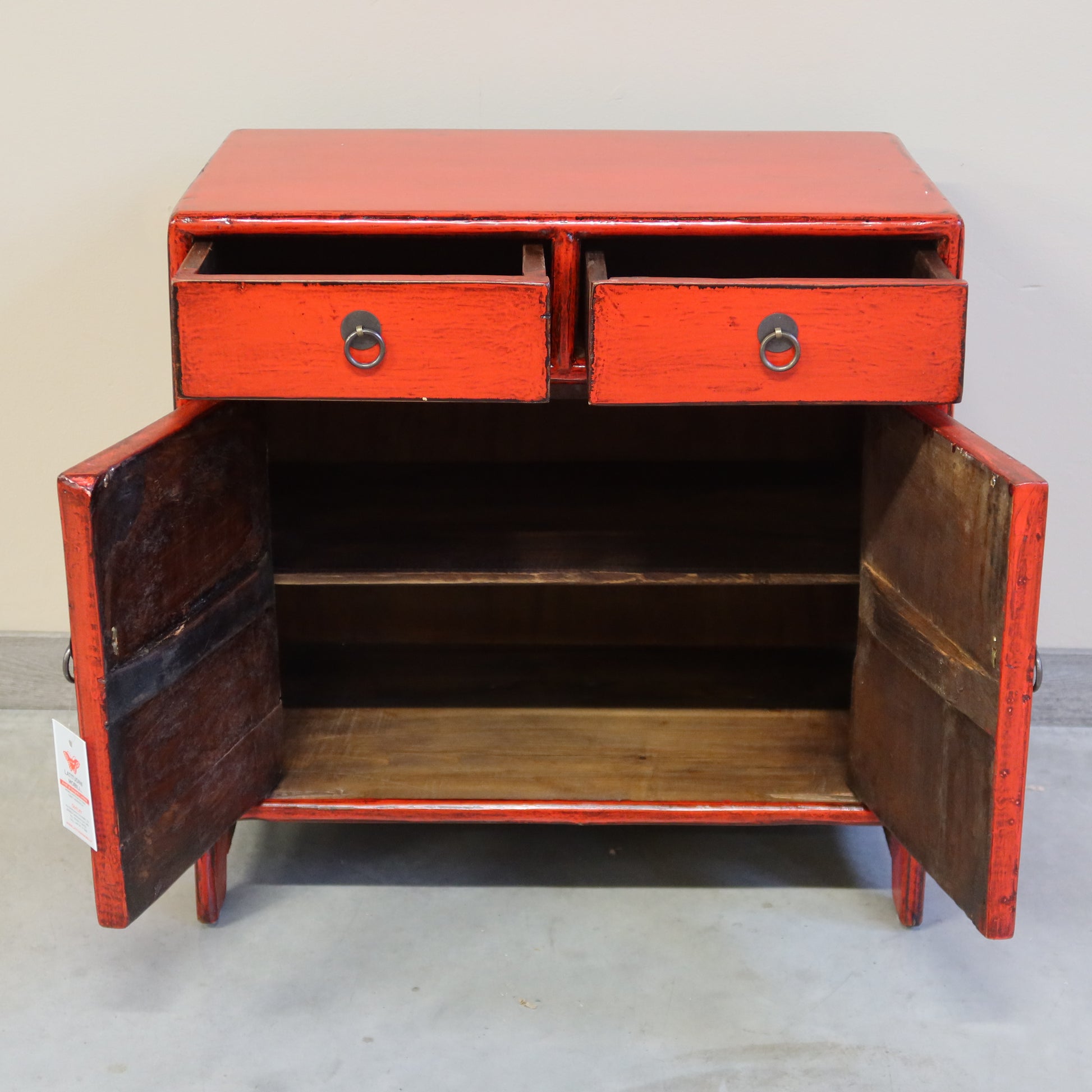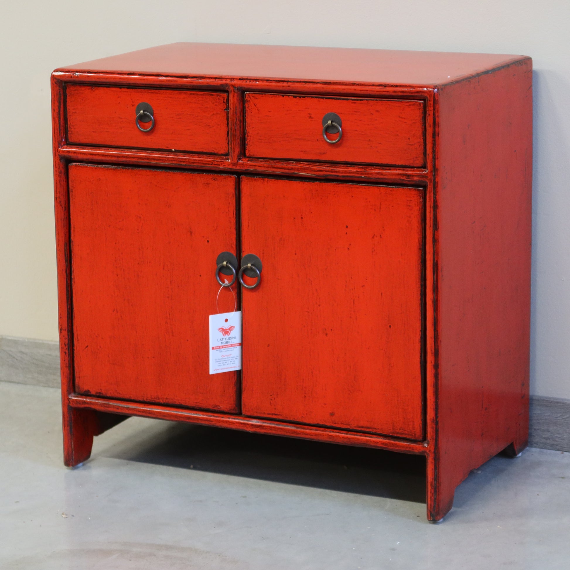 Stipo di forma semicubica a due cassetti e due ante in lacca rossa.