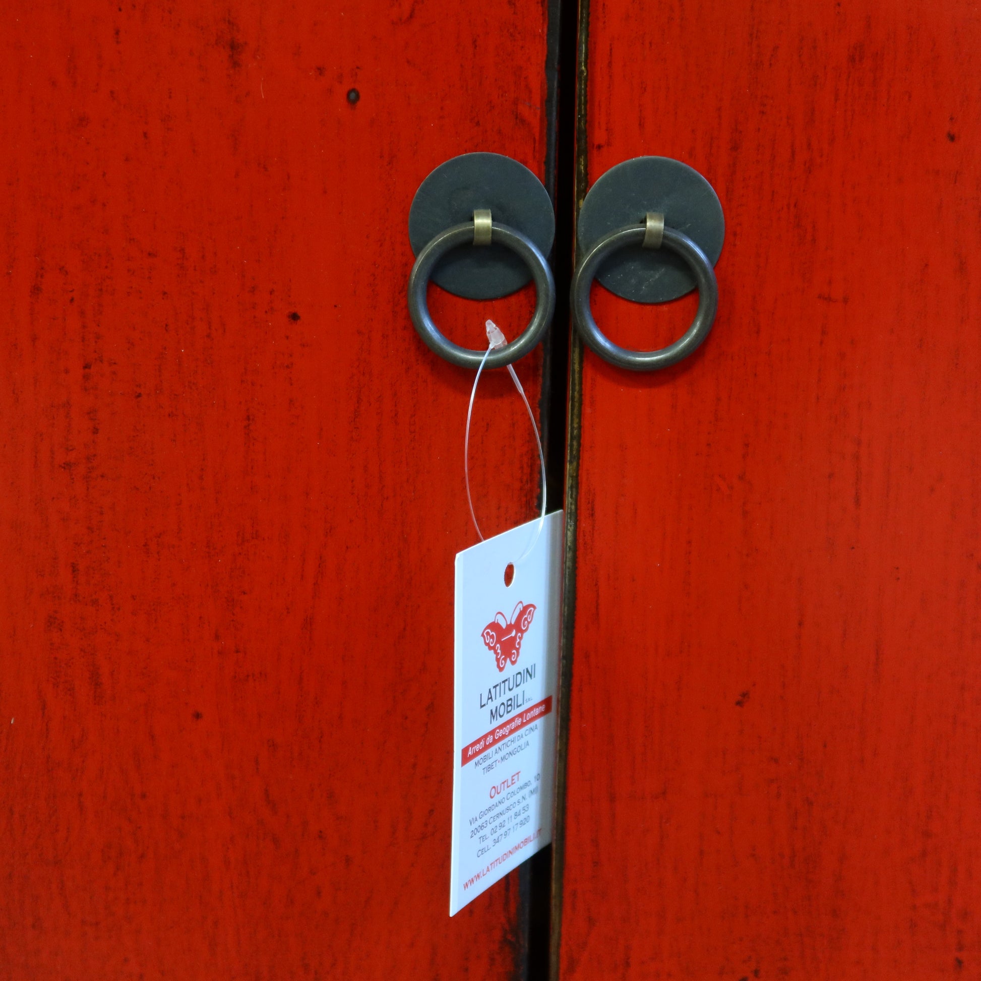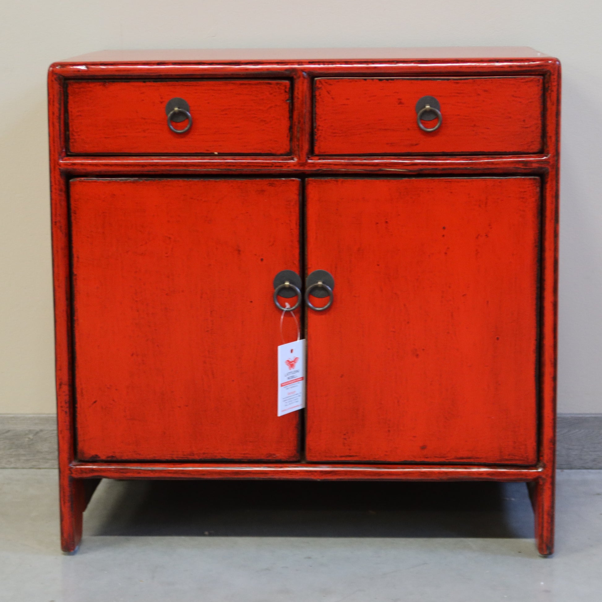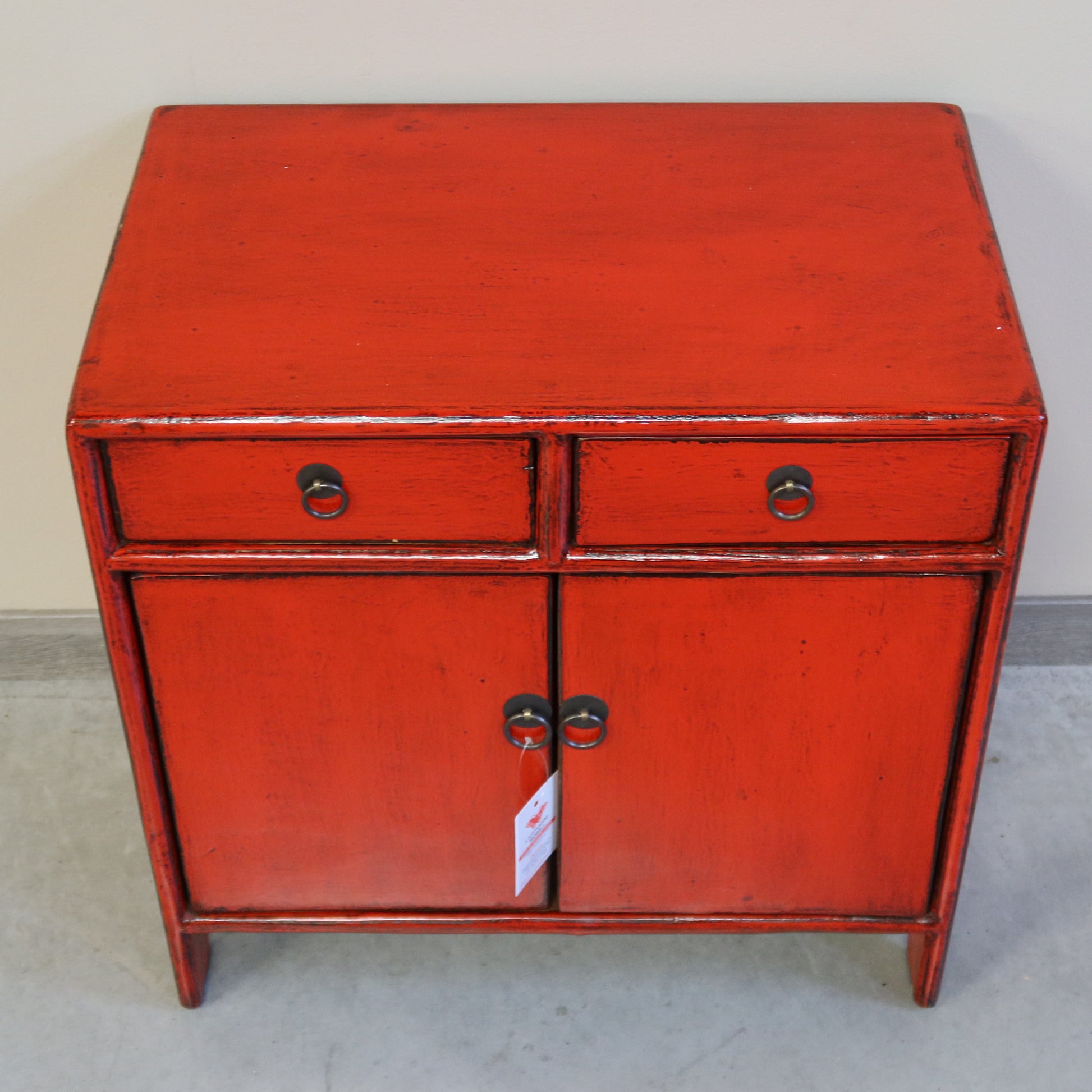Stipo di forma semicubica a due cassetti e due ante in lacca rossa.