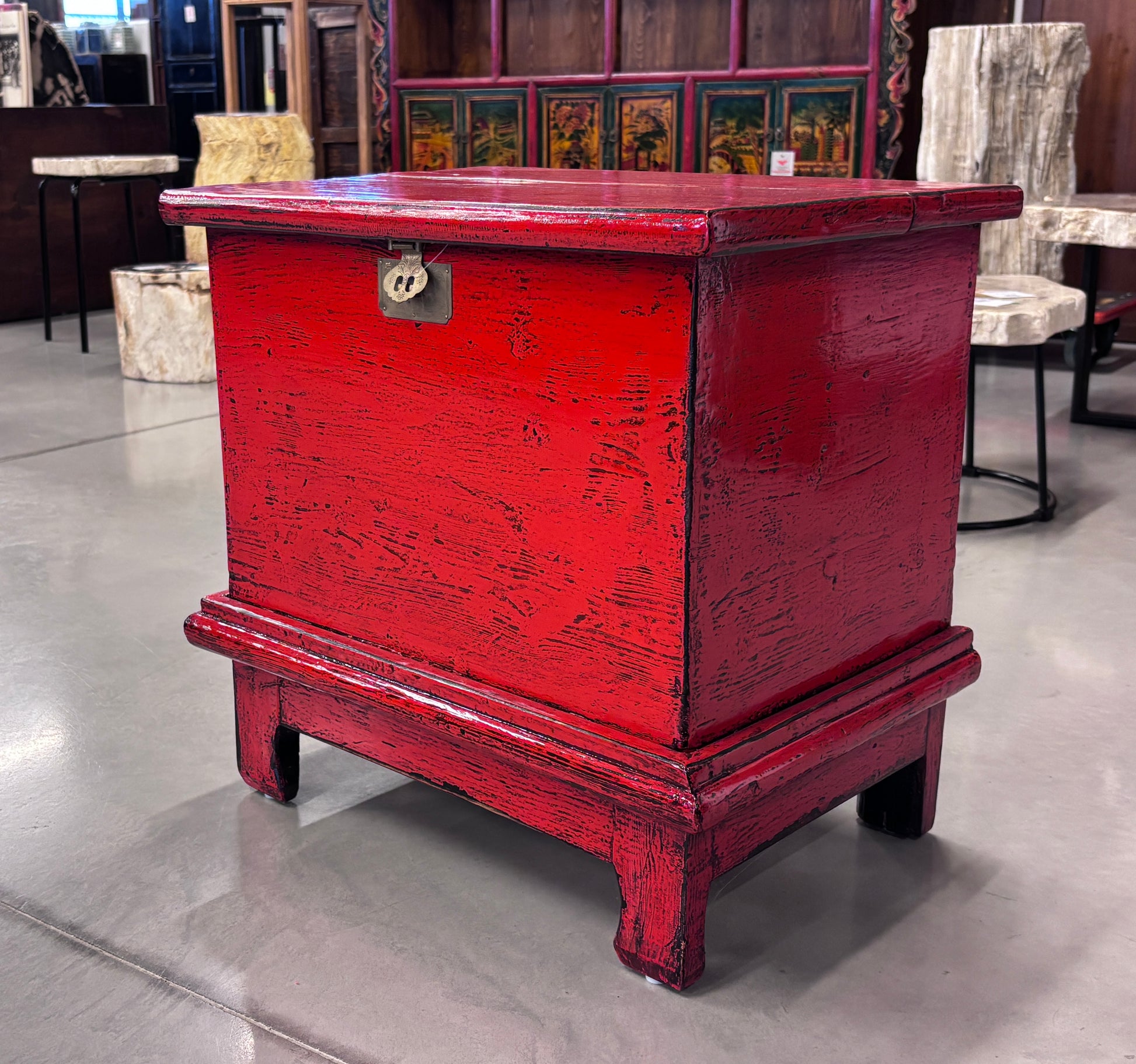 Baule con finitura laccata e apertura dall'alto con coperchio rimovibile.