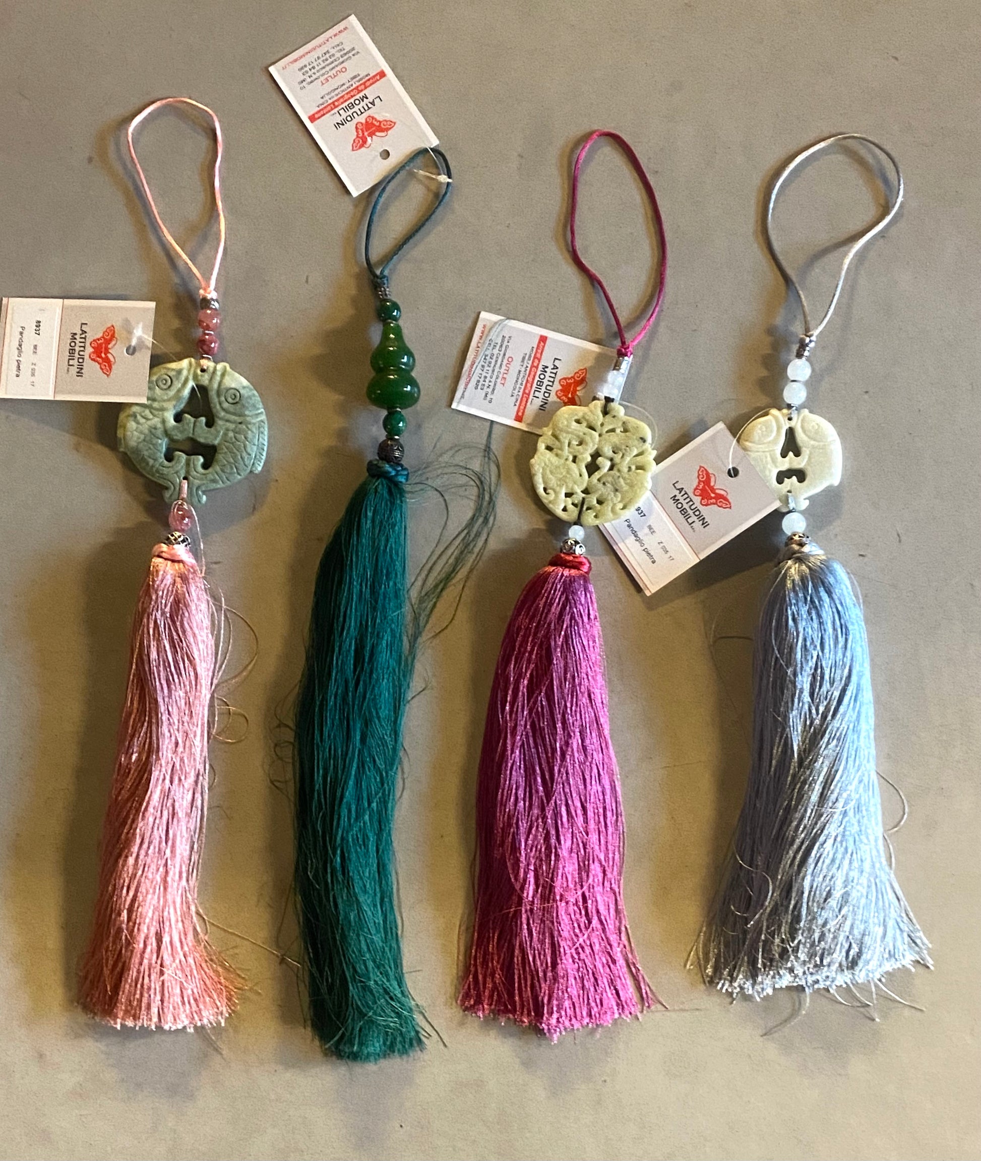 La misura del diametro di ogni pendaglio circolare è intorno ai 6 o 7 centimetri. L'altezza indicata è quella dal pendaglio e della nappa ornamentale in seta. Il prezzo indicato è per singolo oggetto.