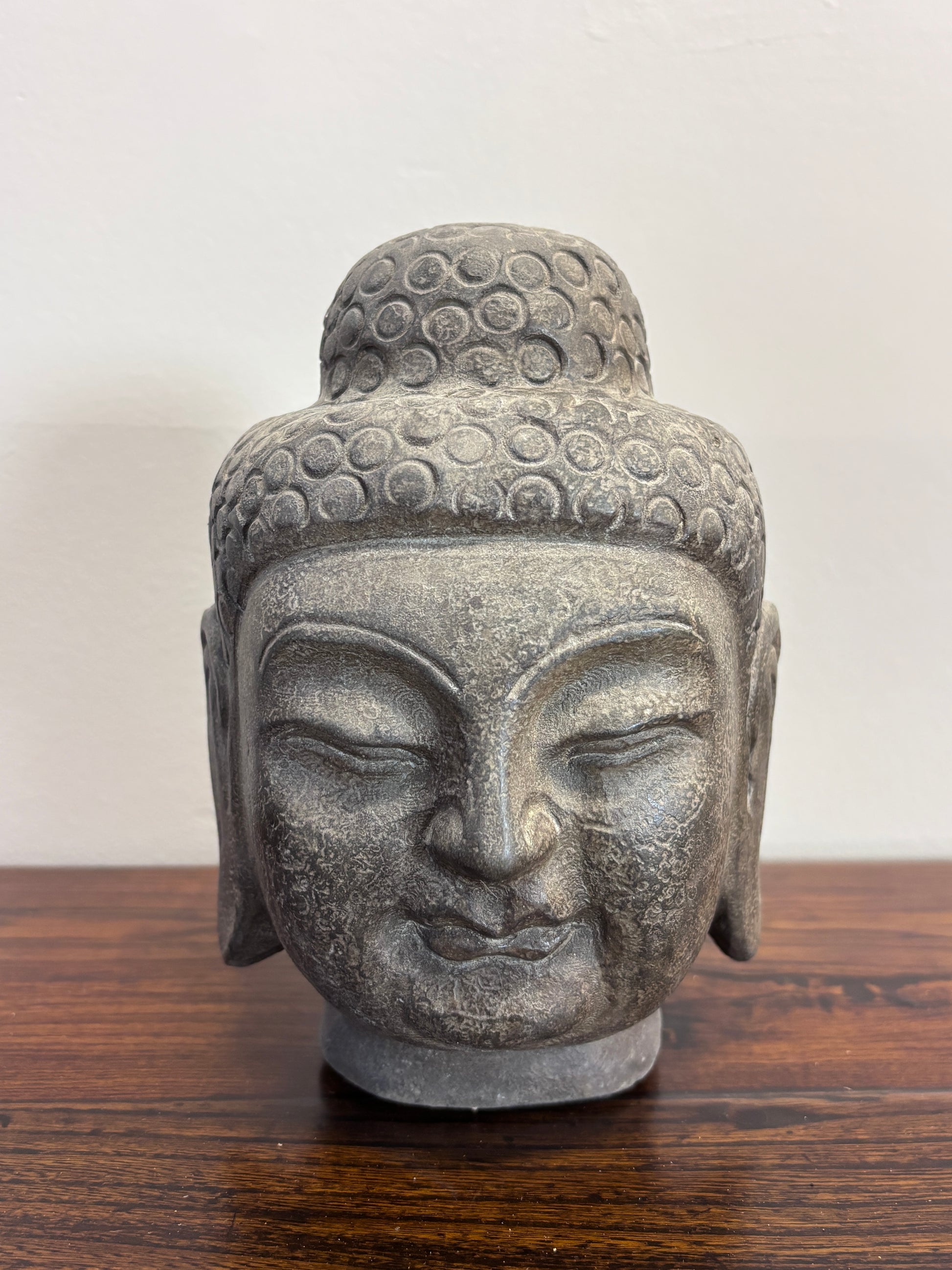 Statua in pietra raffigurante la testa del Buddha secondo l'iconografia tradizionale.