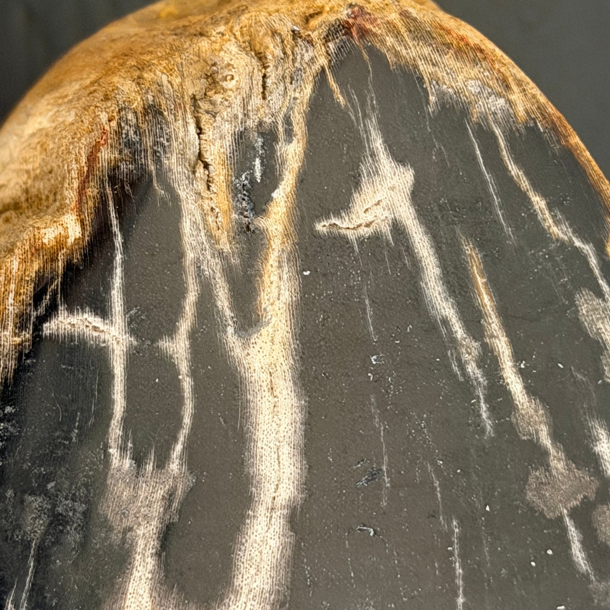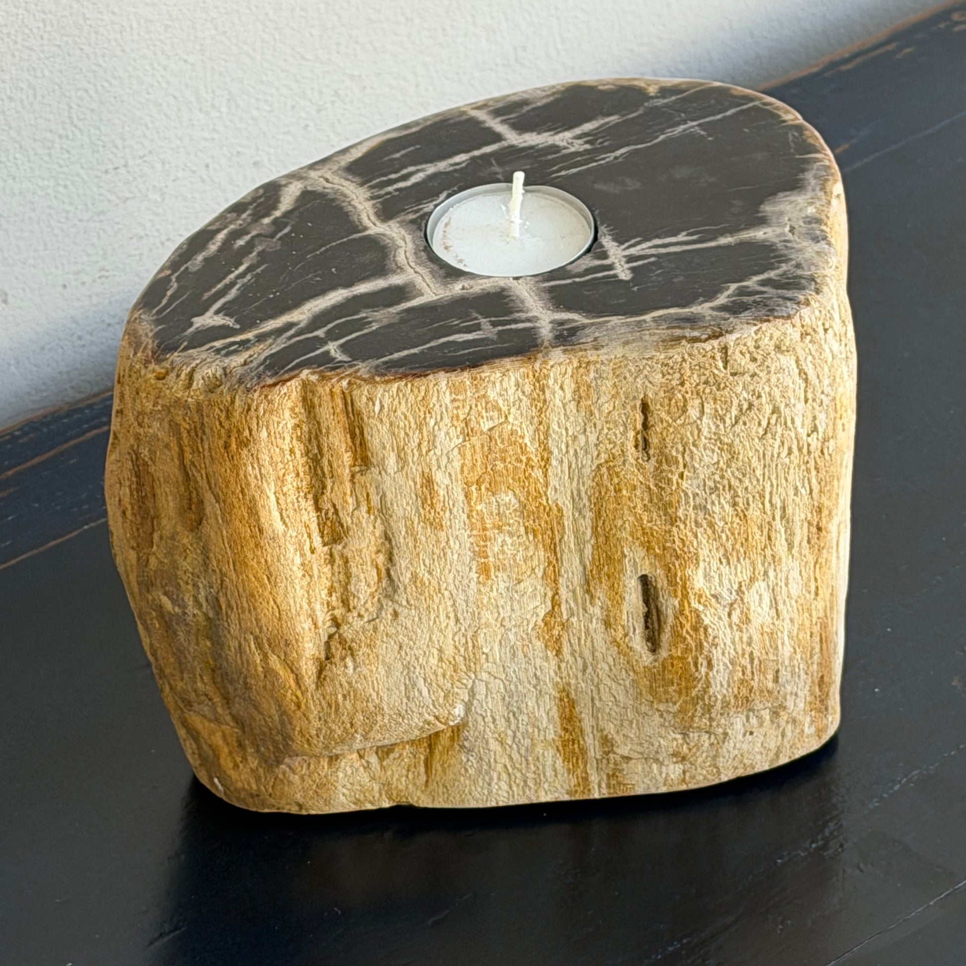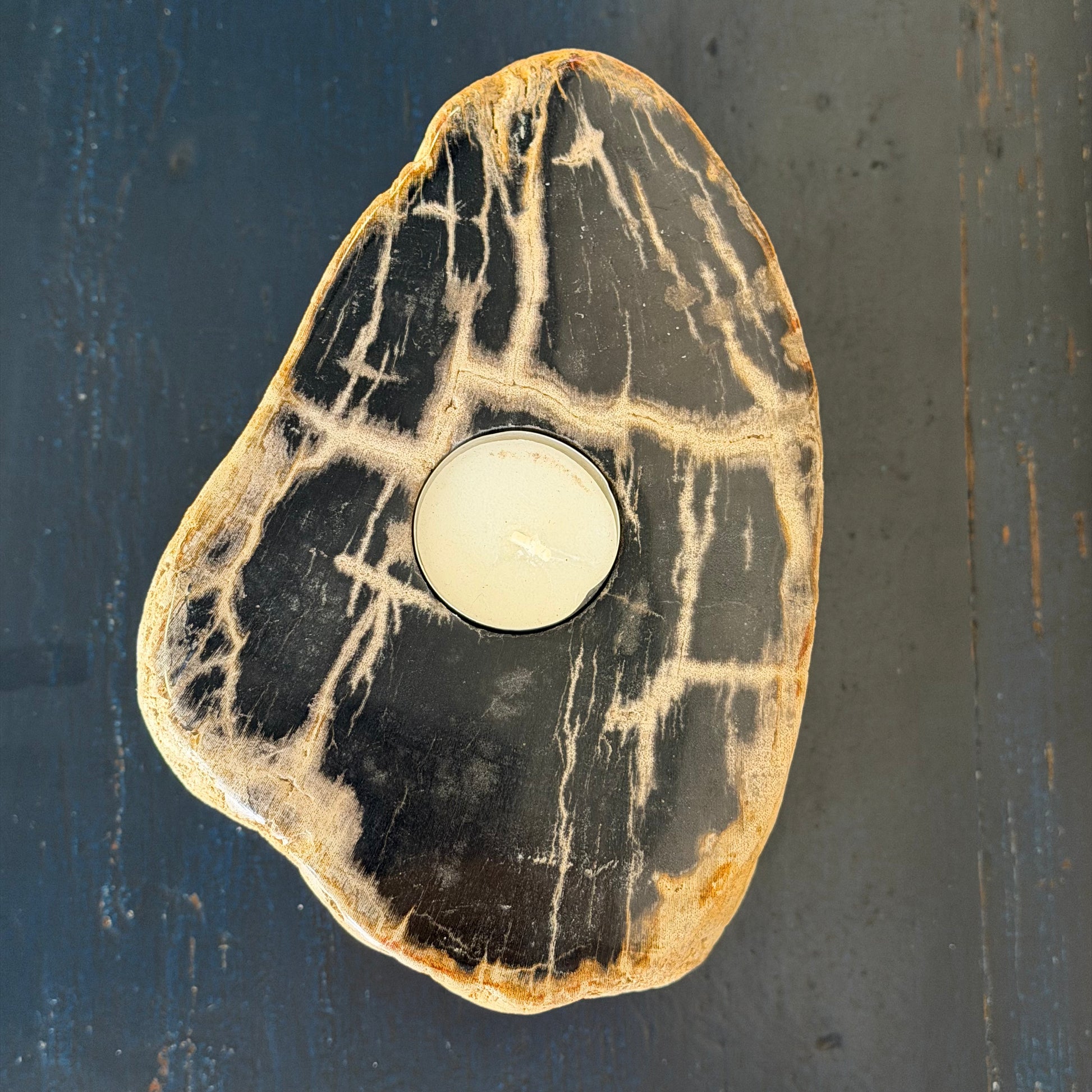 Questo oggetto decorativo unisce design e storia. È realizzato in legno fossile ovvero il legno di un albero vissuto 20 milioni di anni fa che ha attraversato un processo di mineralizzazione per cui mostra colori unici.