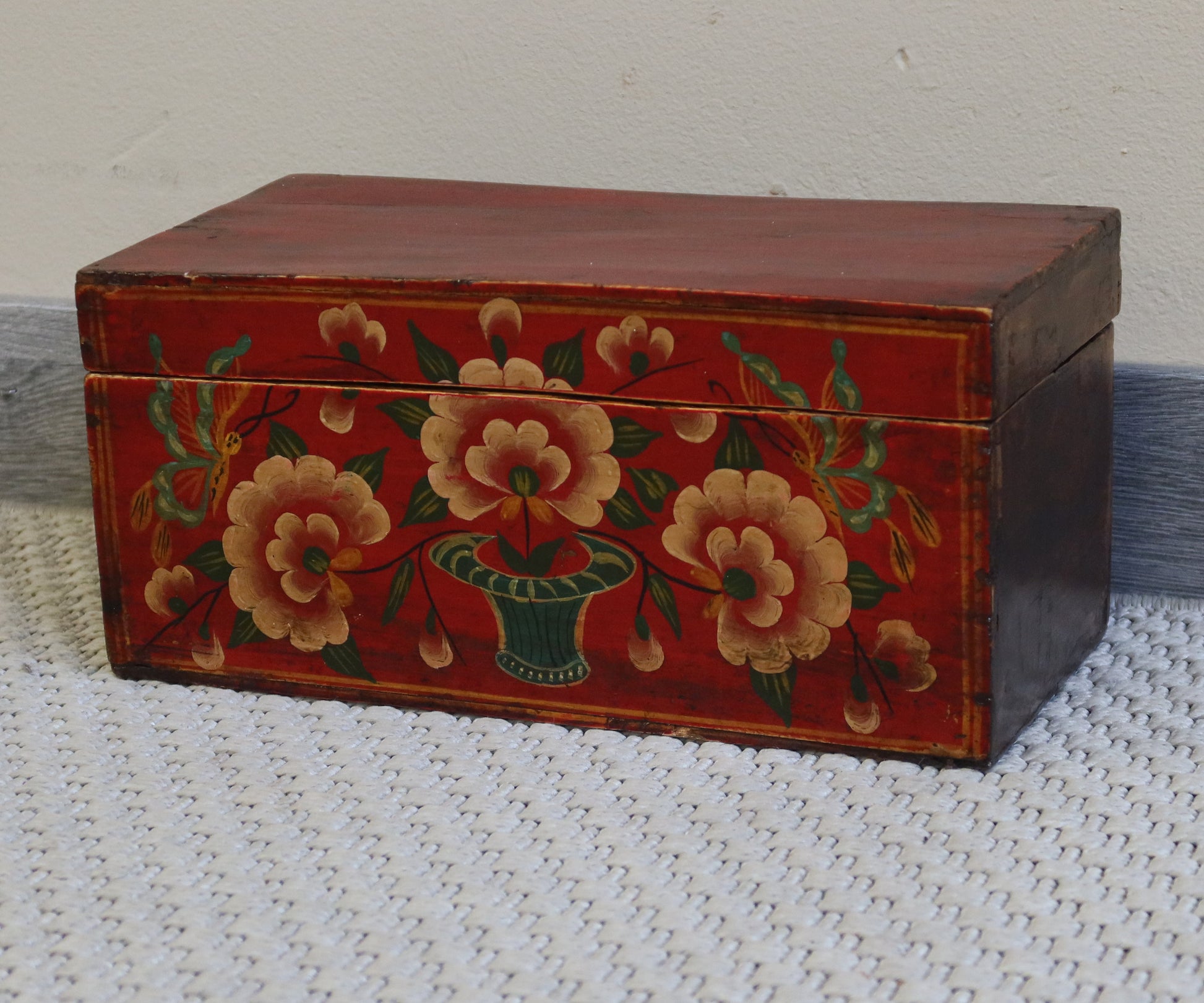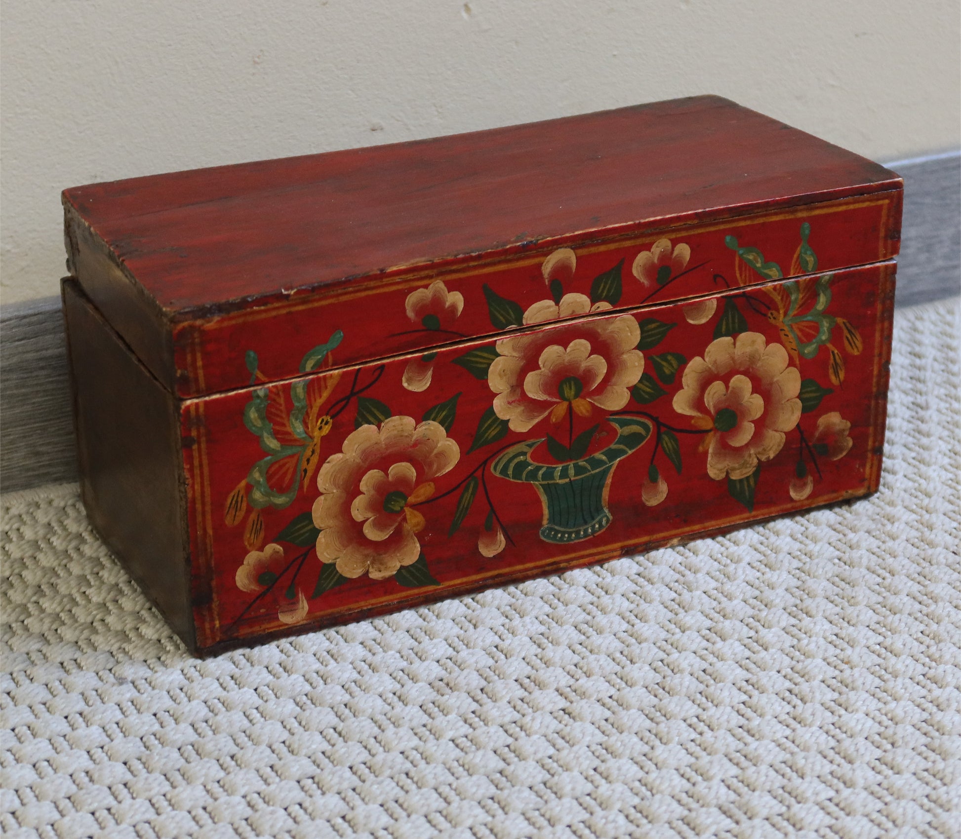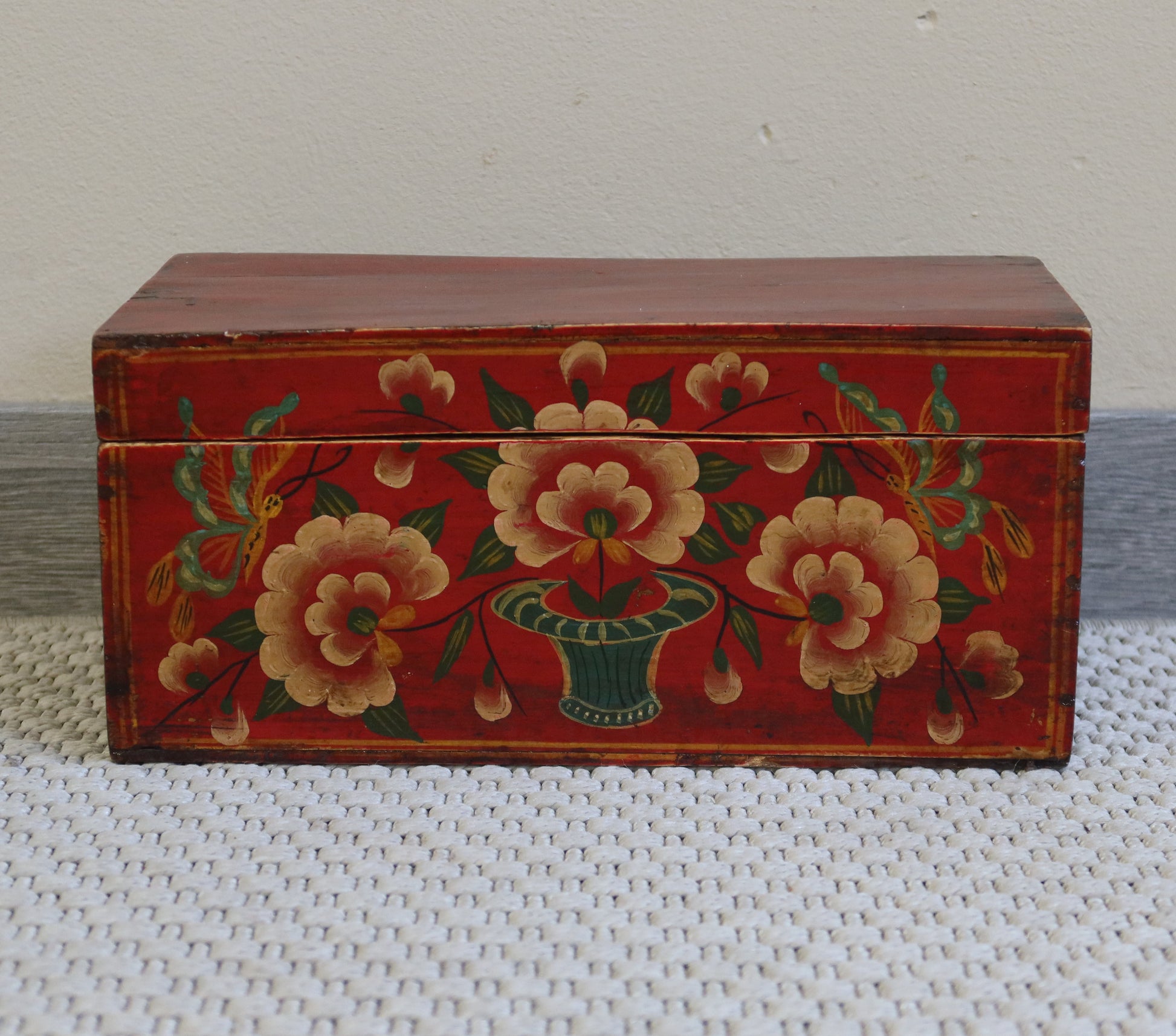 Semplice scatola a bauletto in lacca con decorazione policrome sul fronte. Provenienza regione della Mongolia.