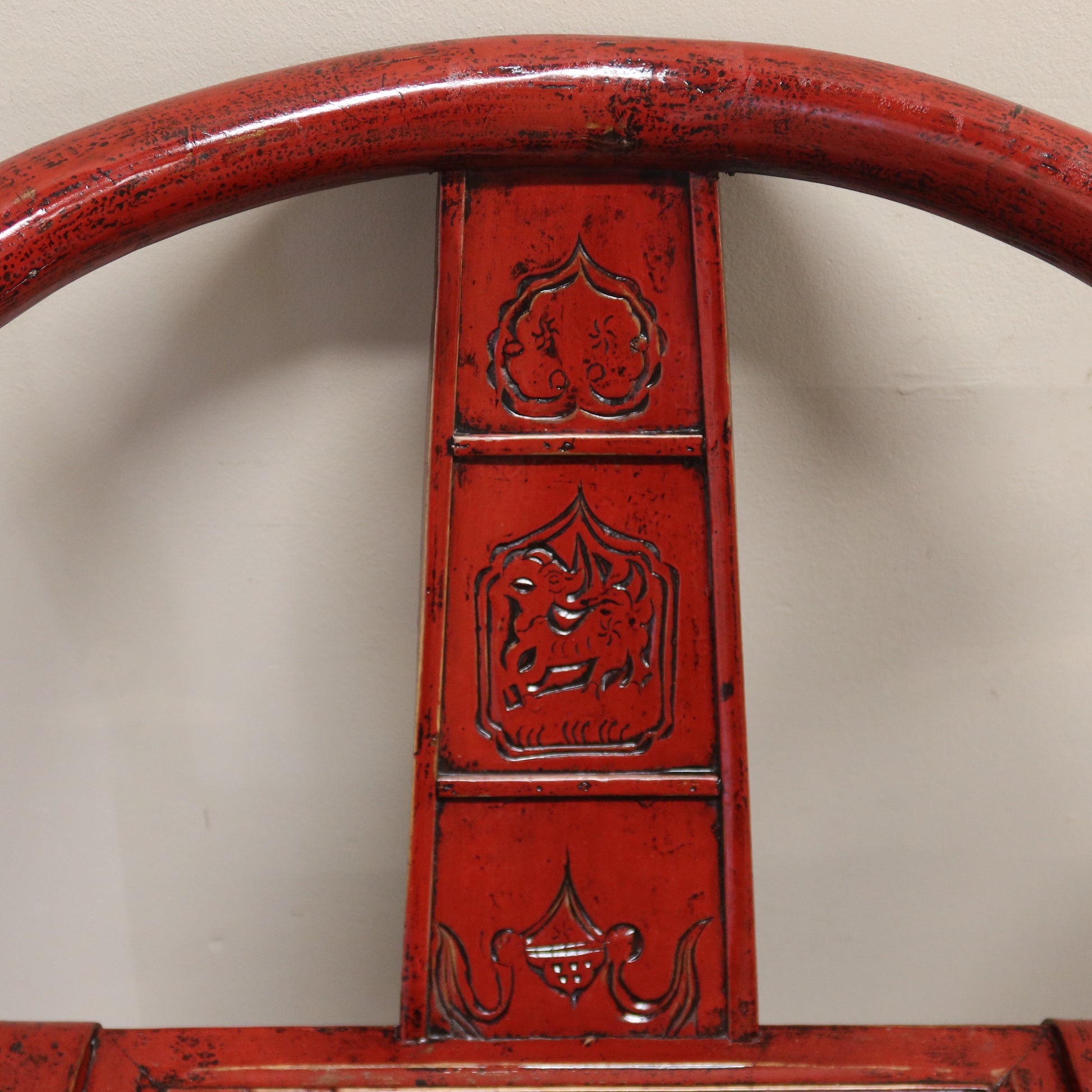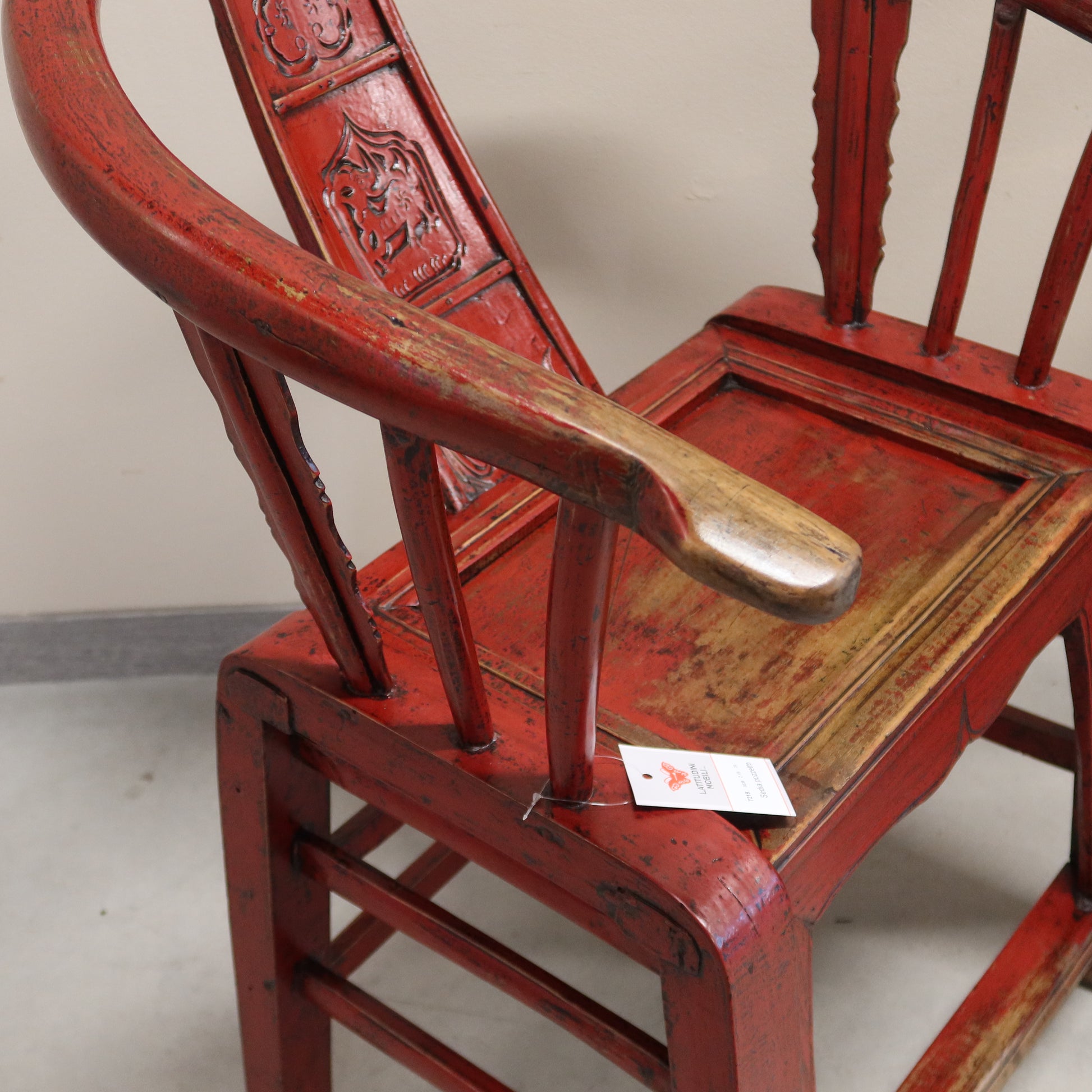 Sedia in olmo cinese in lacca rossa con unico pezzo di legno sagomato a guisa di ferro da cavallo che funge da schienale e da bracciolo. E' una poltroncina etnica comoda, oltre che elegante! L'altezza indicata (cm. 89) è quella totale; l'altezza da terra della seduta è di cm. 51. IL PREZZO INDICATO E' PER SINGOLA SEDIA.