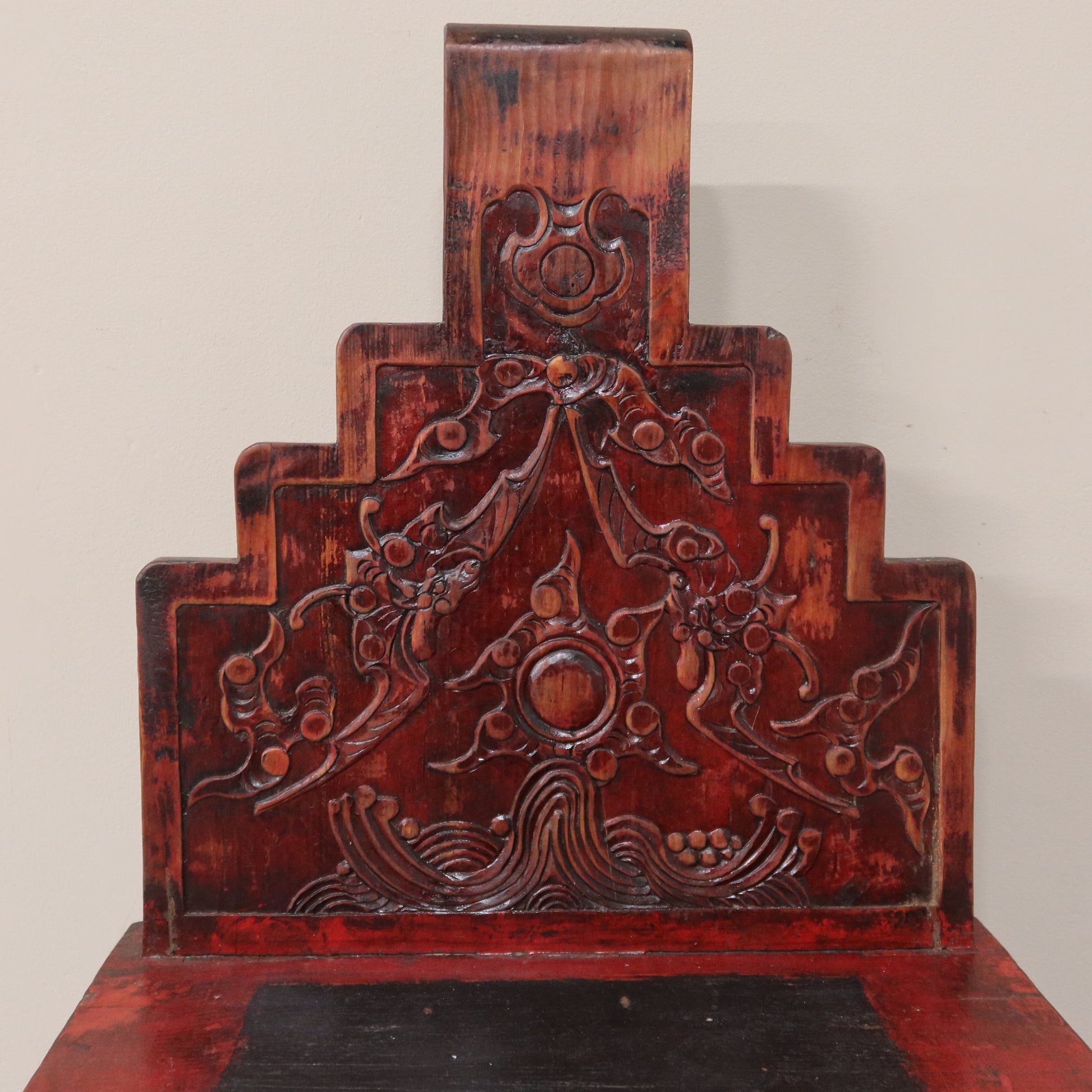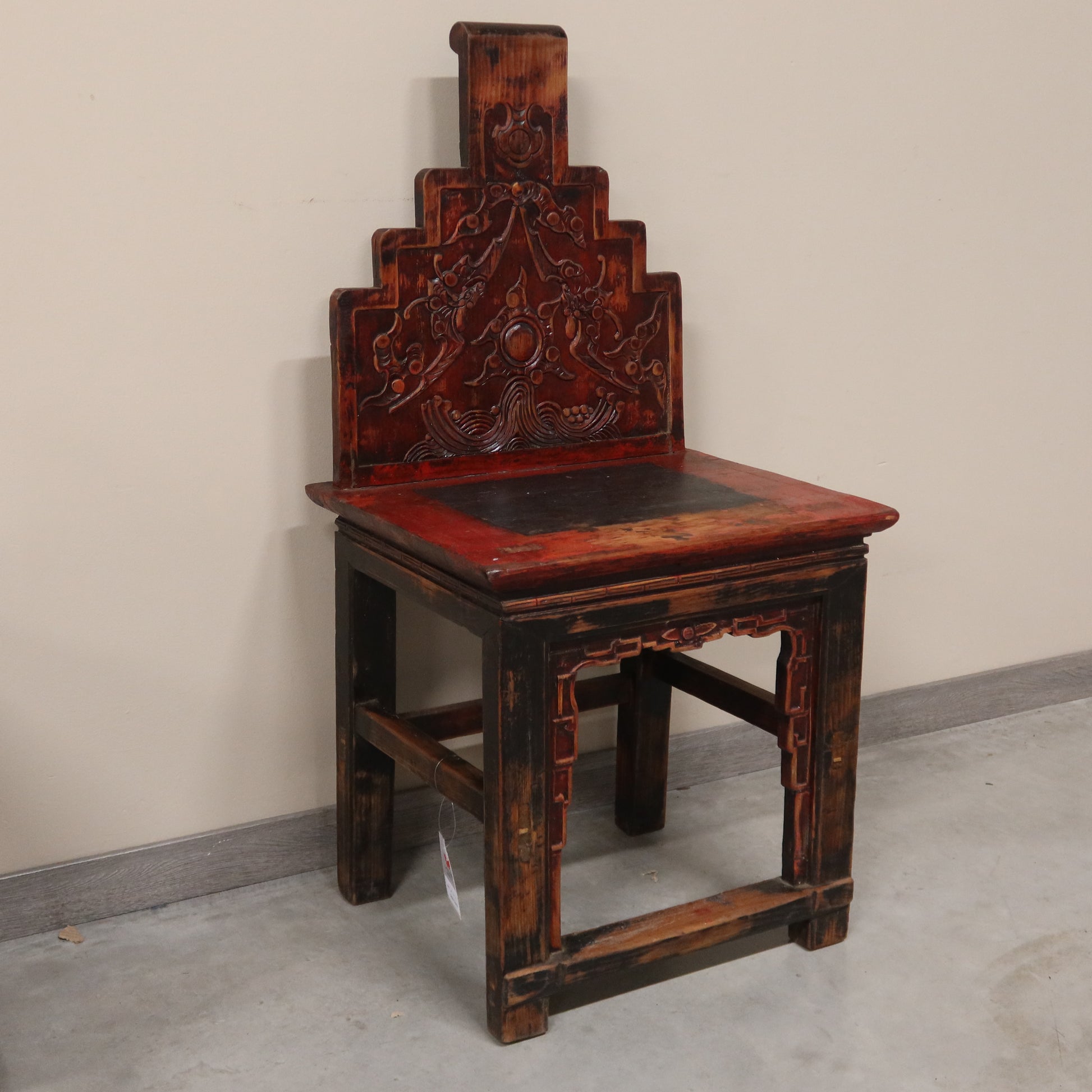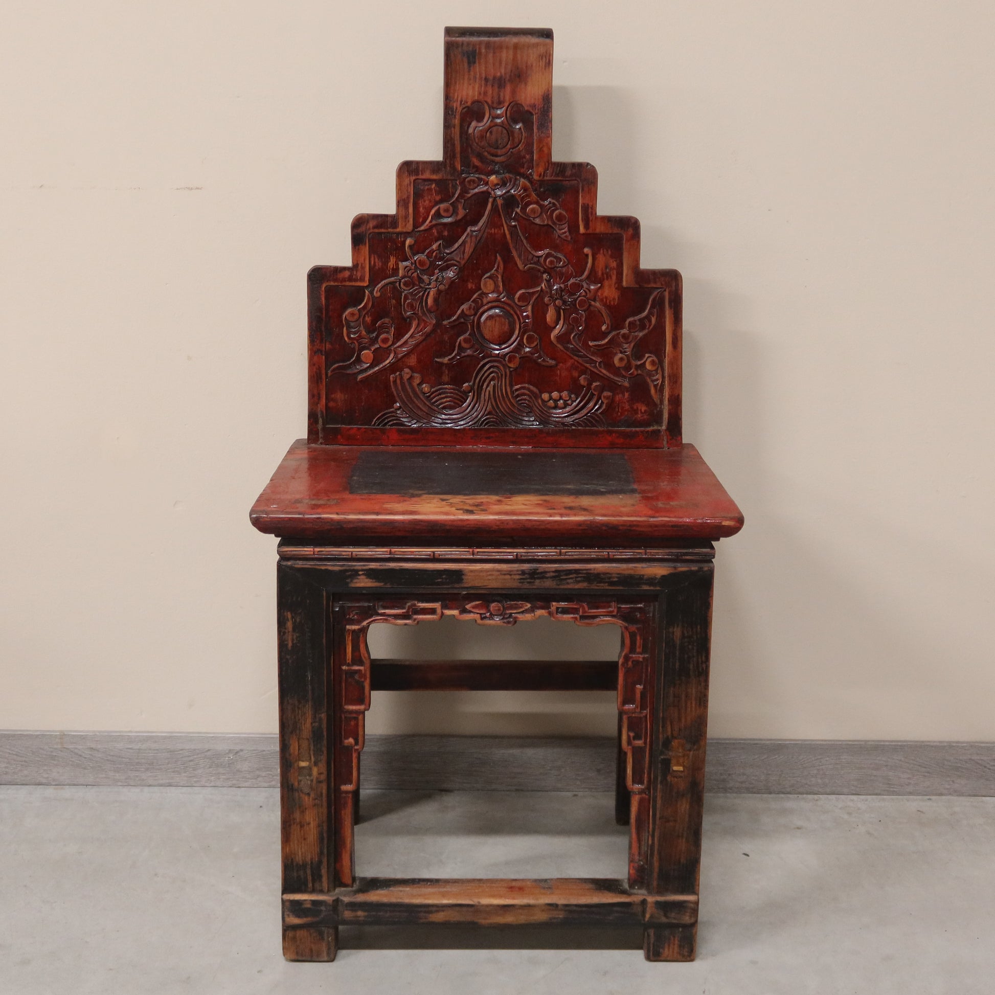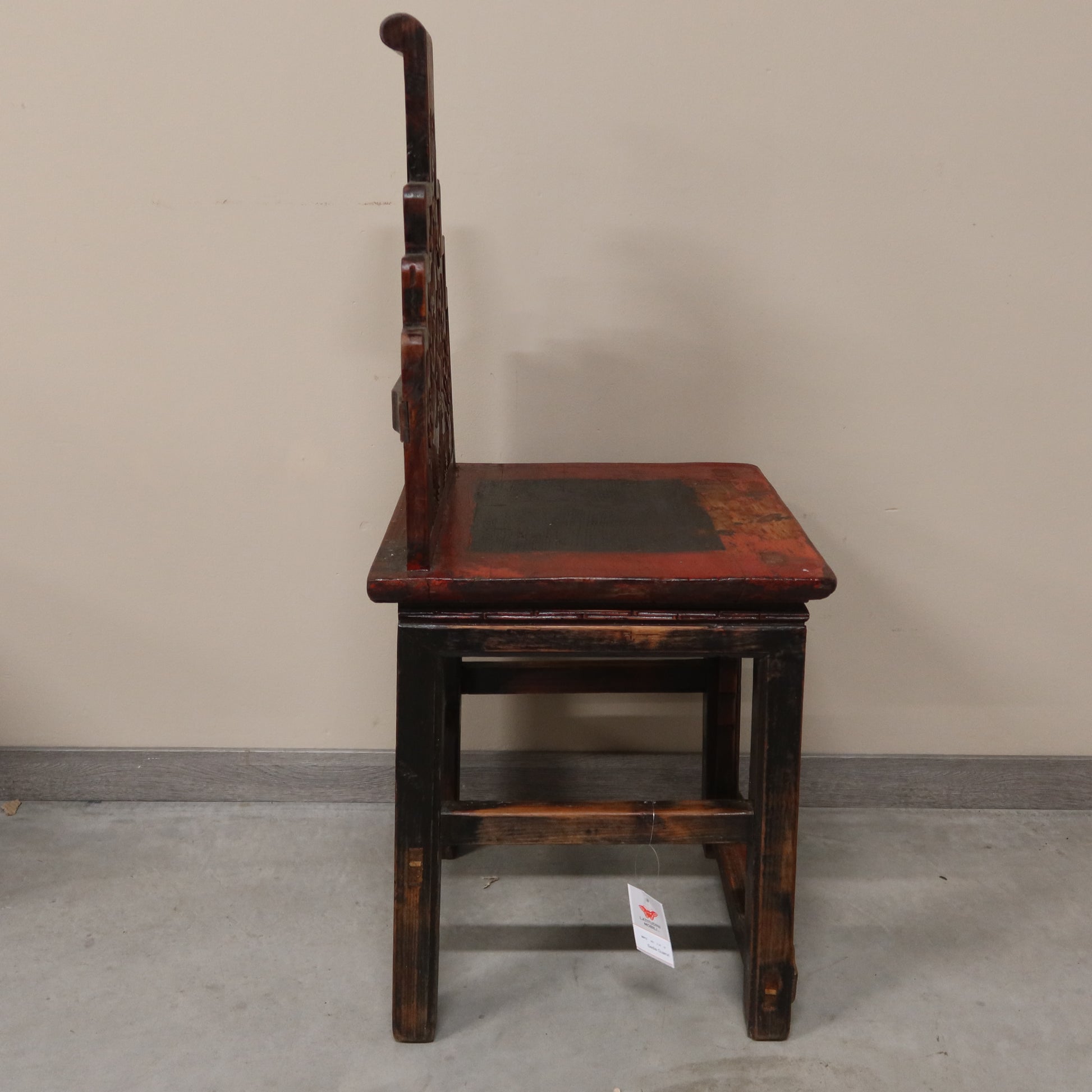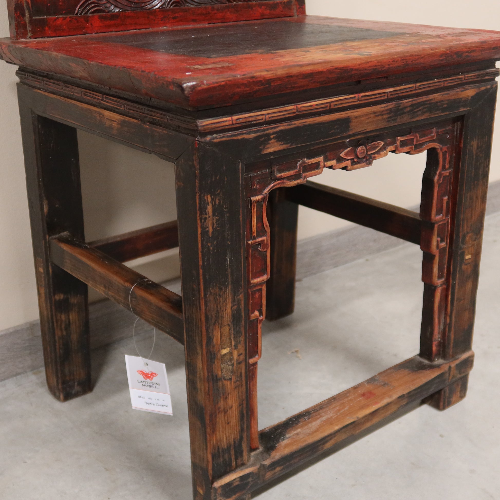 Caratteristica sedia in lacca bicromatica in patina con particolare schienale, tipico della regione del Guanxi. L'altezza fornita in scheda è quella massima. L'altezza della seduta misura da terra cm. 54