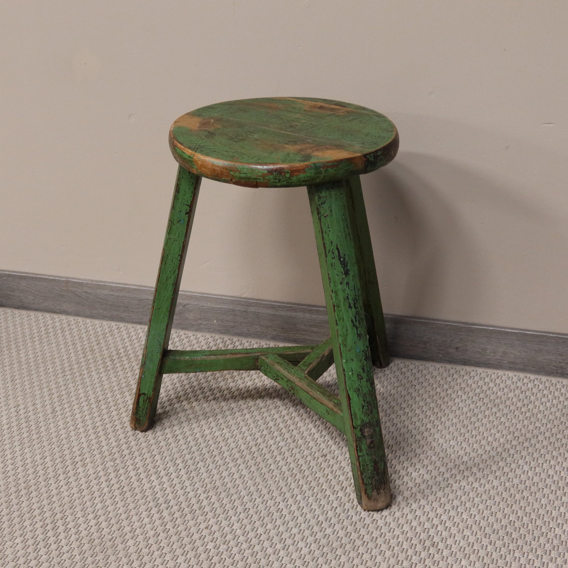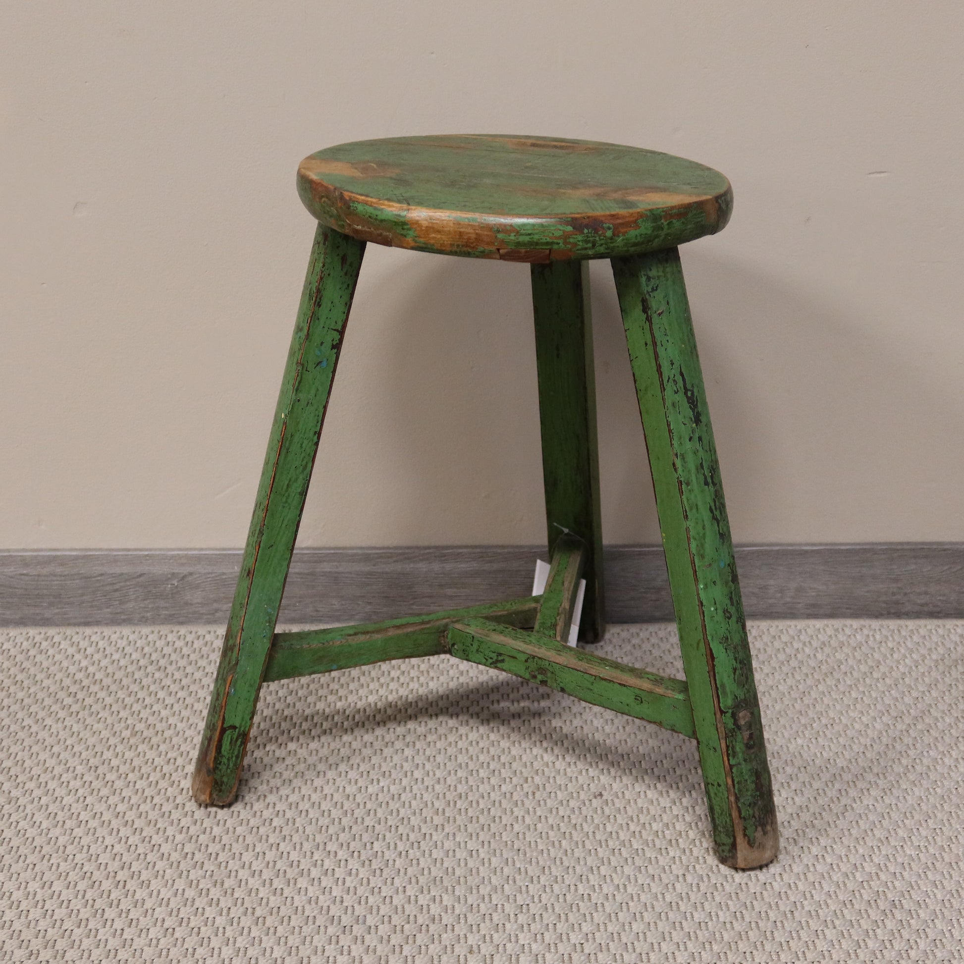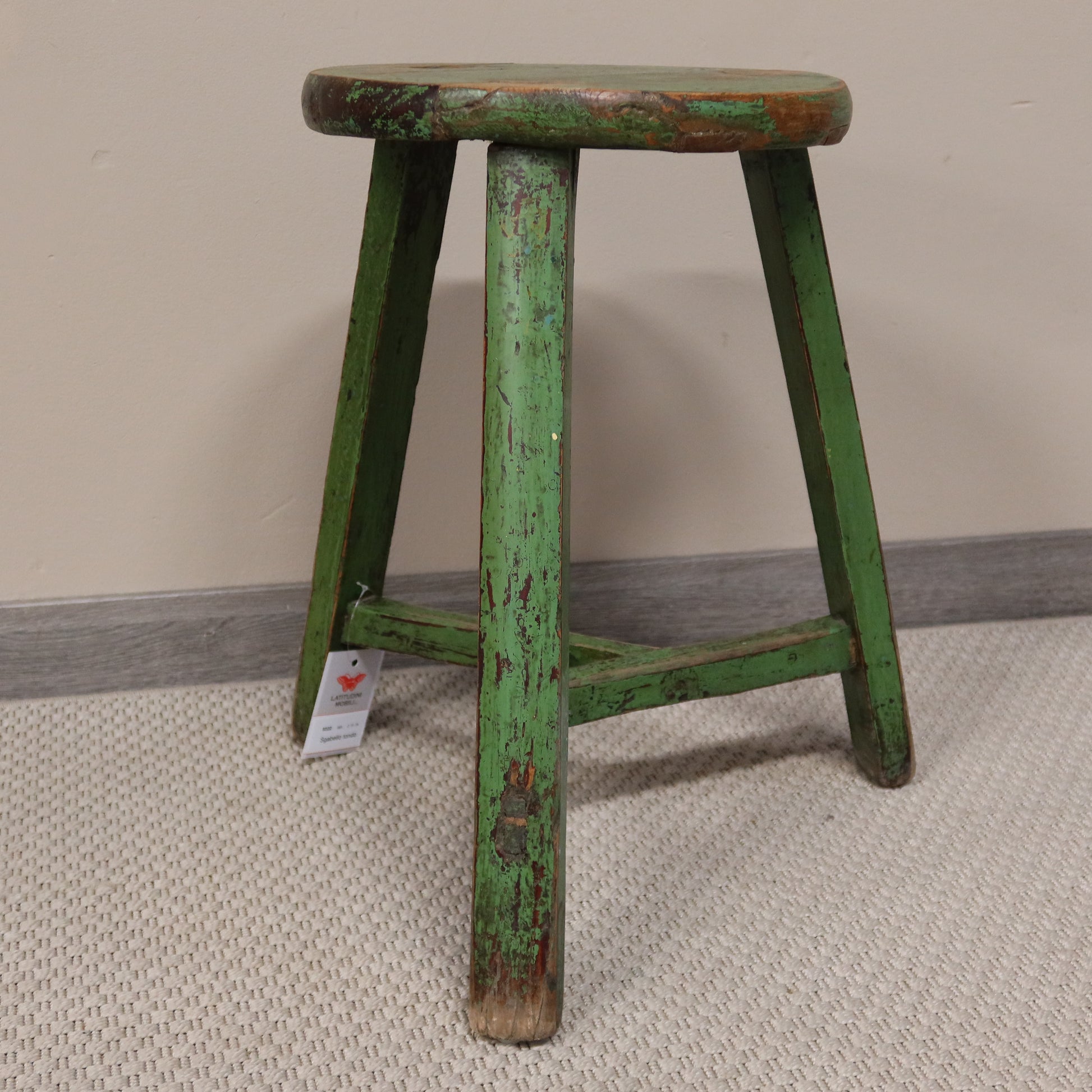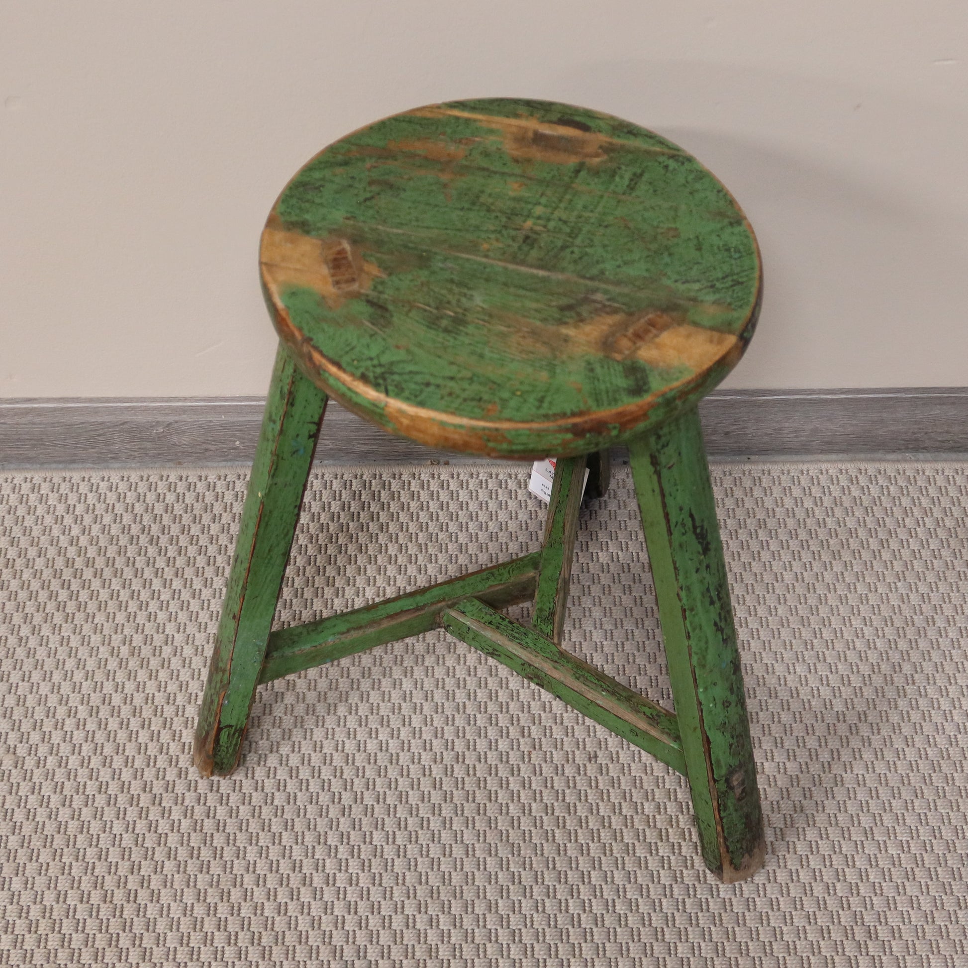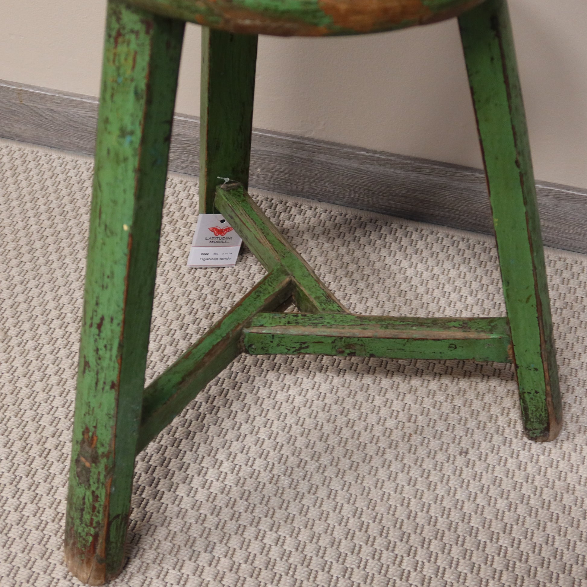Particolare sgabellino in olmo cinese a tre gambe rastremate in lacca verde . Le misure indicate sono le massime di ingombro. il diametro della seduta è cm. 33