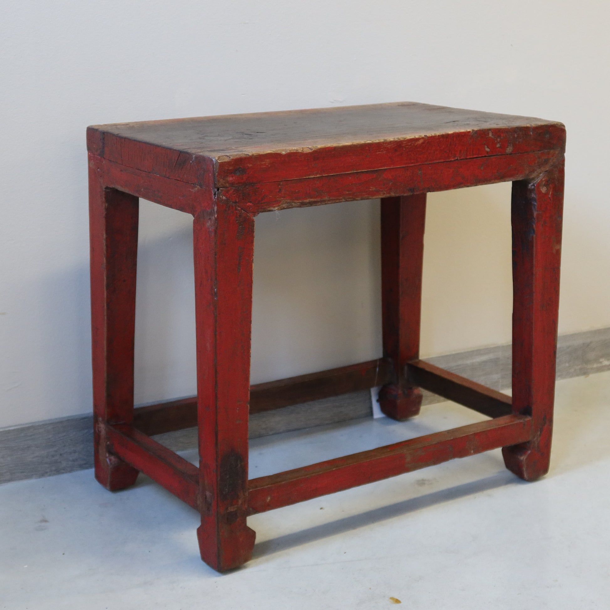 Particolare sgabello in olmo cinese rosso in patina.