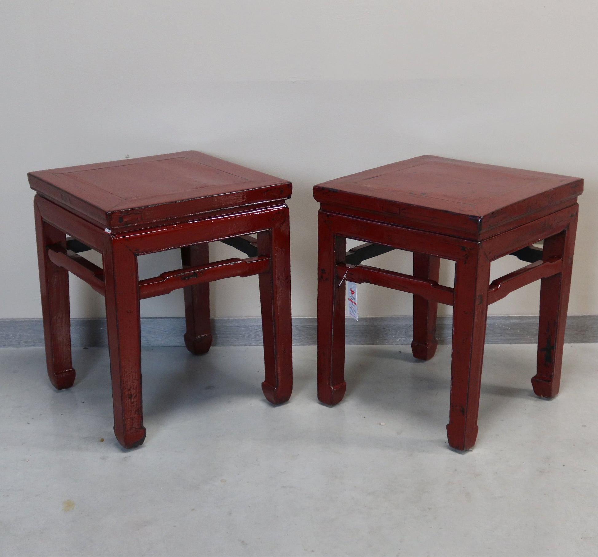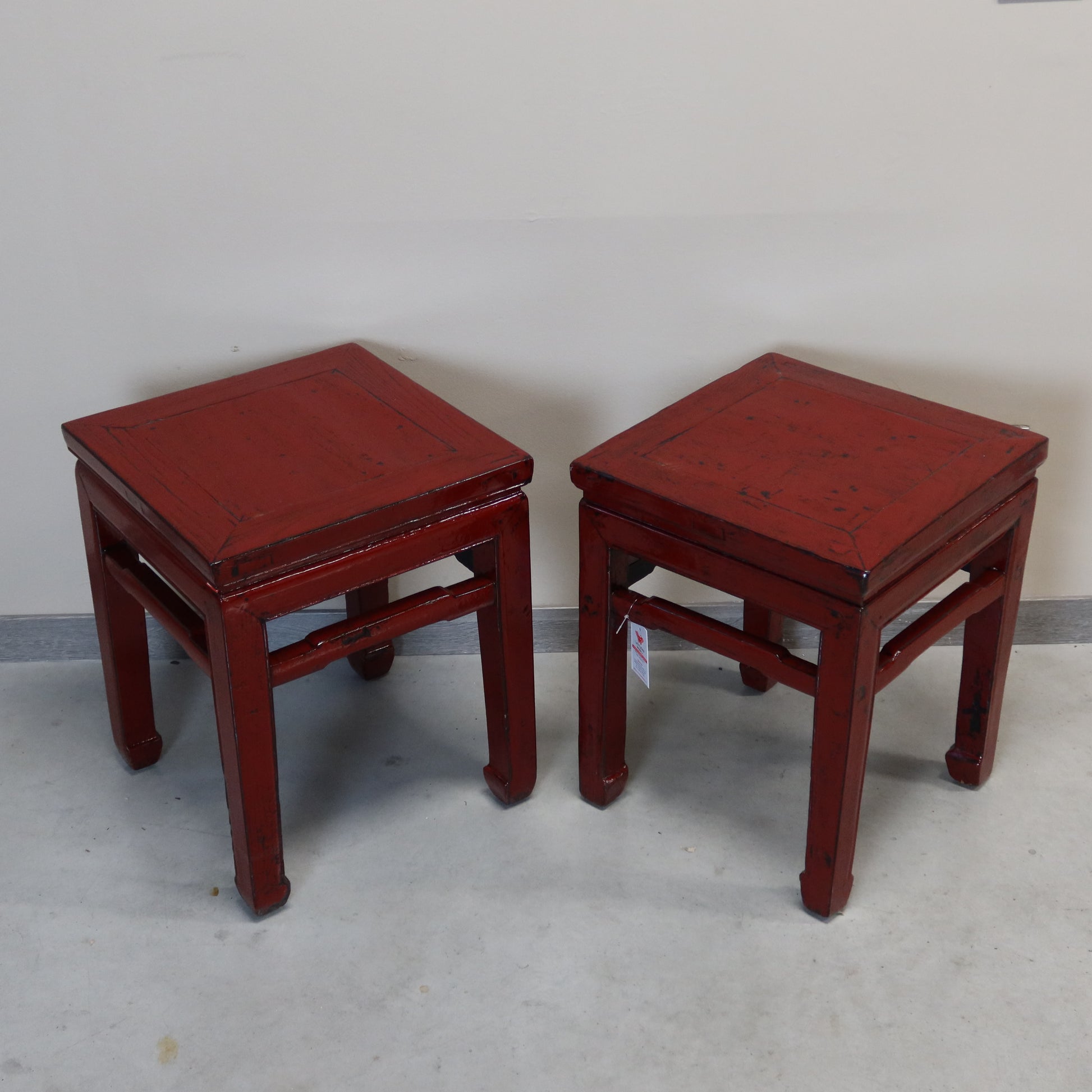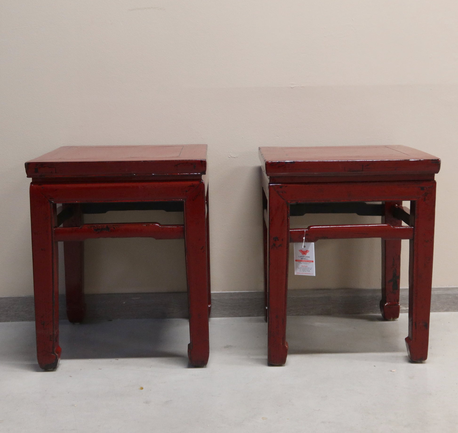 Elegante coppia di sgabelli quadrati in lacca bordeaux, provenienti dalla Regione di Pechino. IL PREZZO INDICATO E' PER SINGOLO SGABELLO.