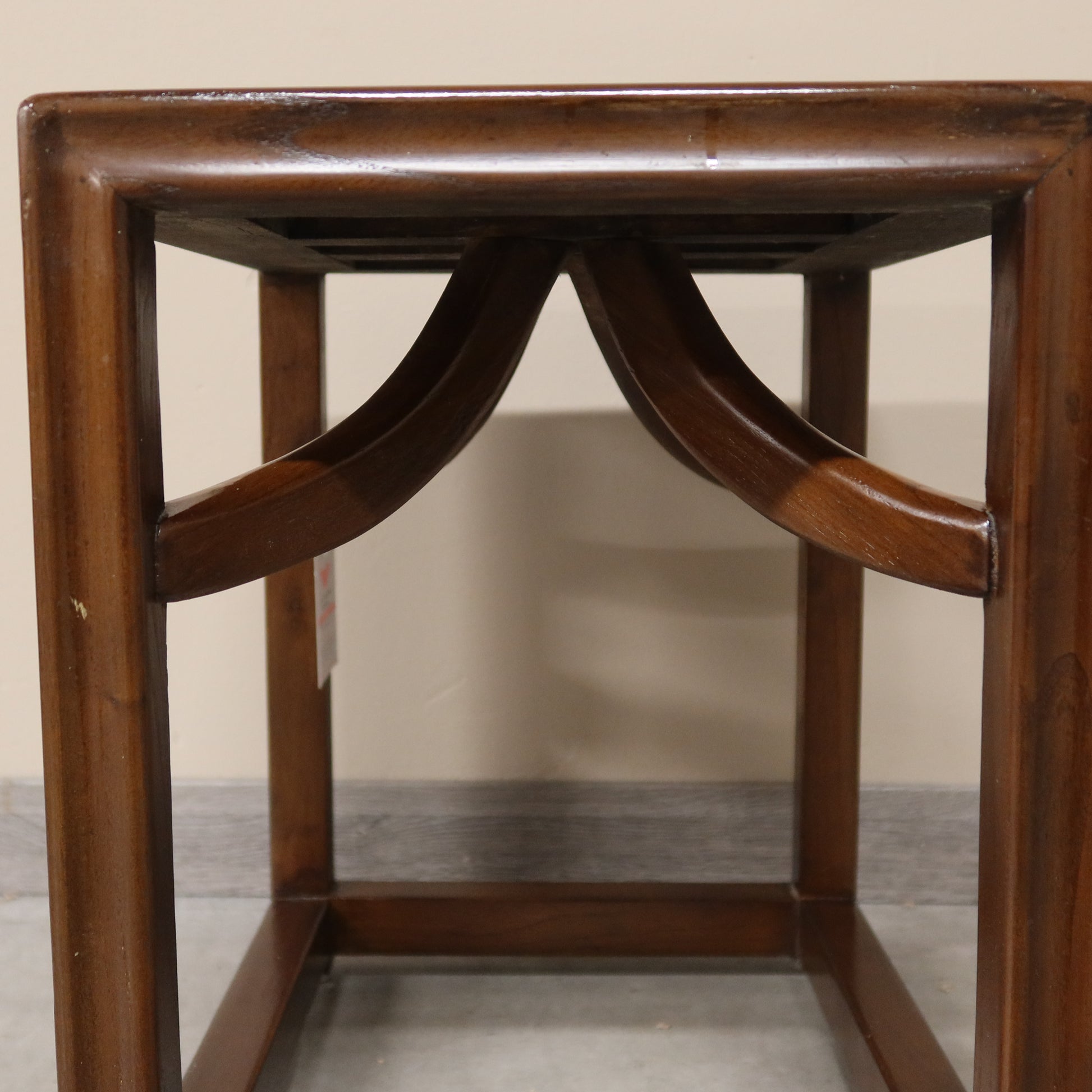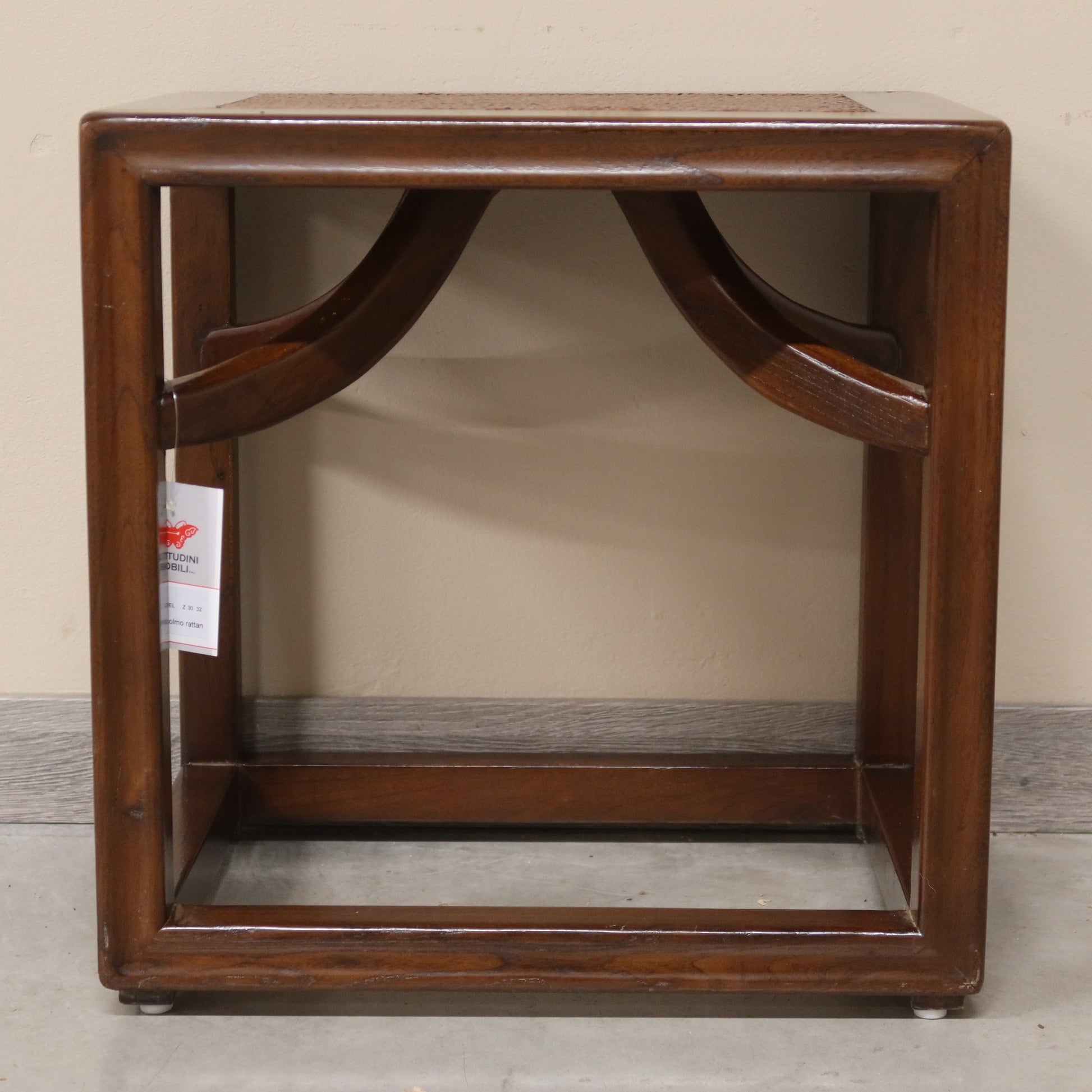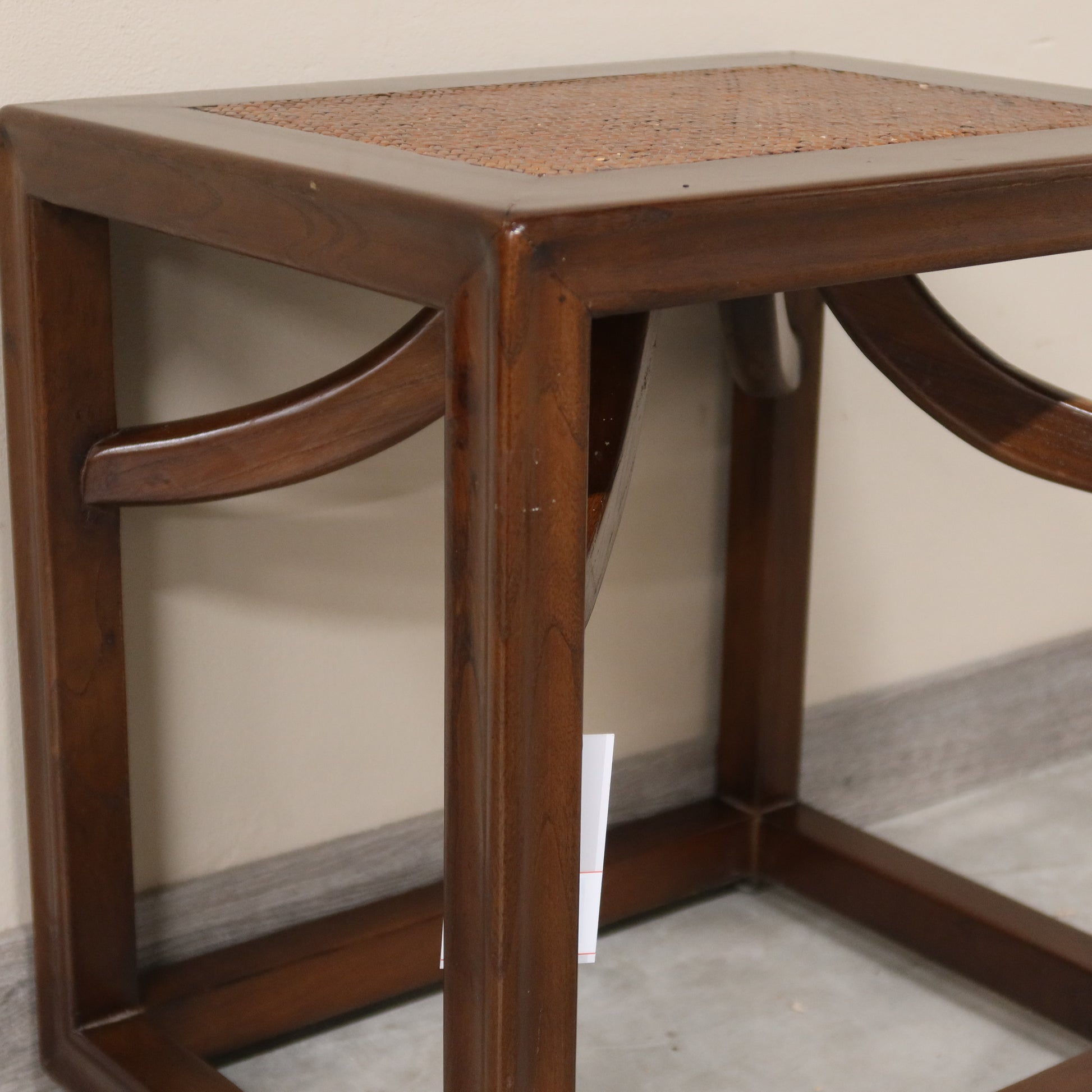 Sgabello cinese in olmo e piano rattan. Particolari i raccordi ad arco sotto la seduta.