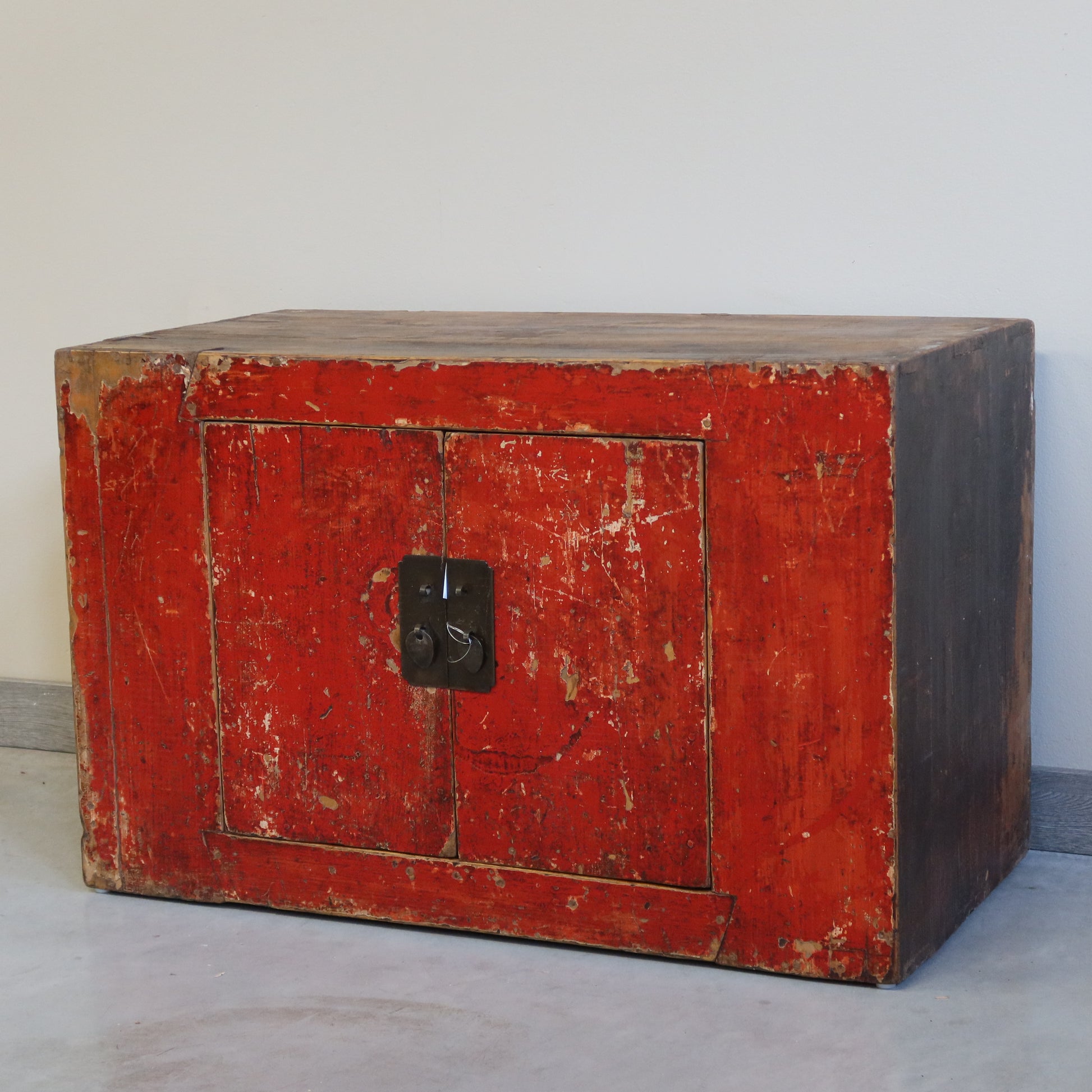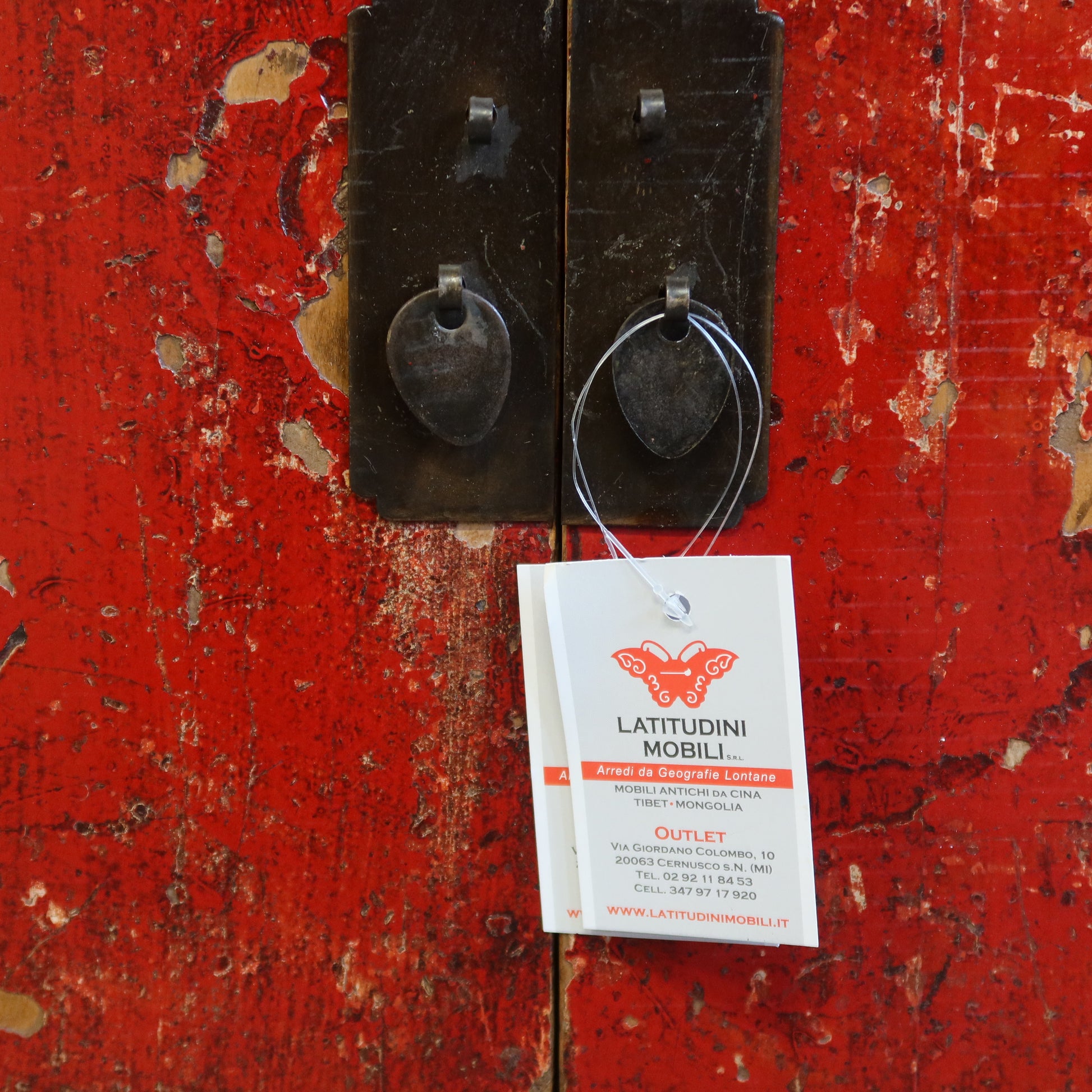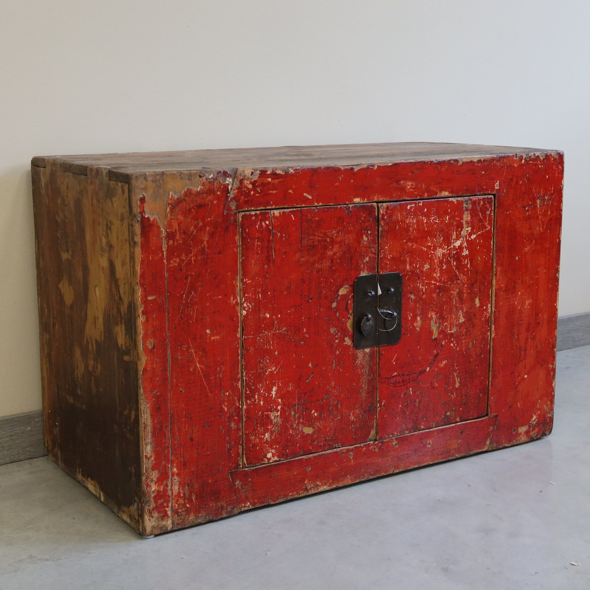 Mobiletto in olmo cinese in patina originale: una sorta di baule con accesso frontale a due ante. Ha una forma compatta, senz'altro rigorosa ed elegante.