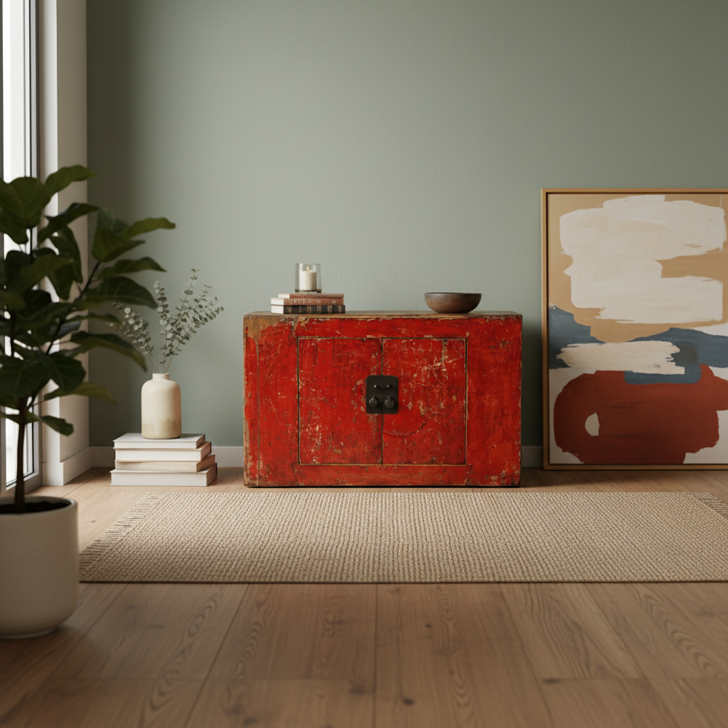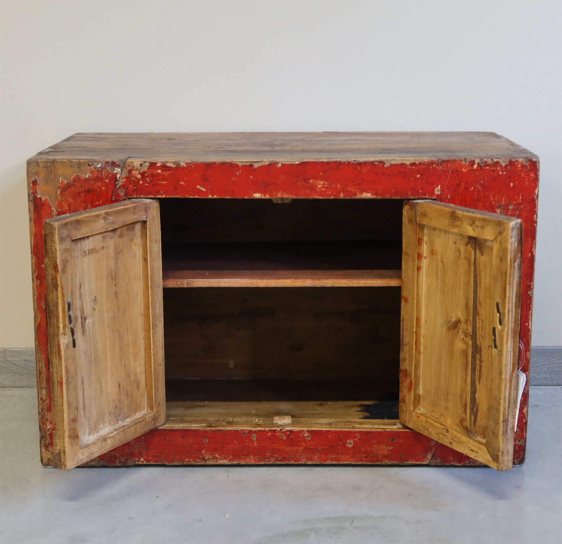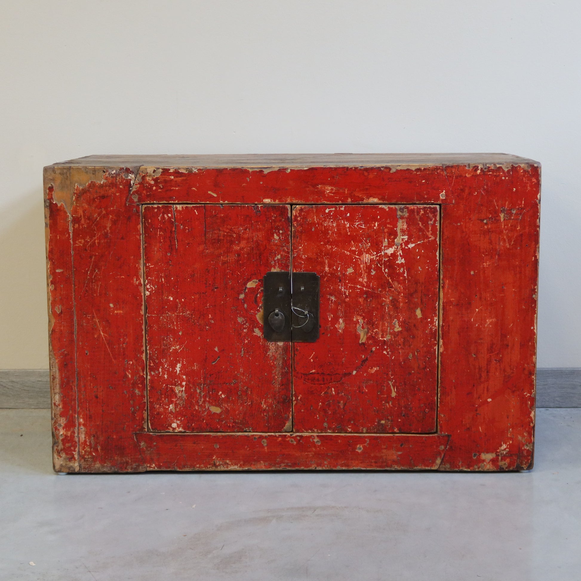 Mobiletto in olmo cinese in patina originale: una sorta di baule con accesso frontale a due ante. Ha una forma compatta, senz'altro rigorosa ed elegante.