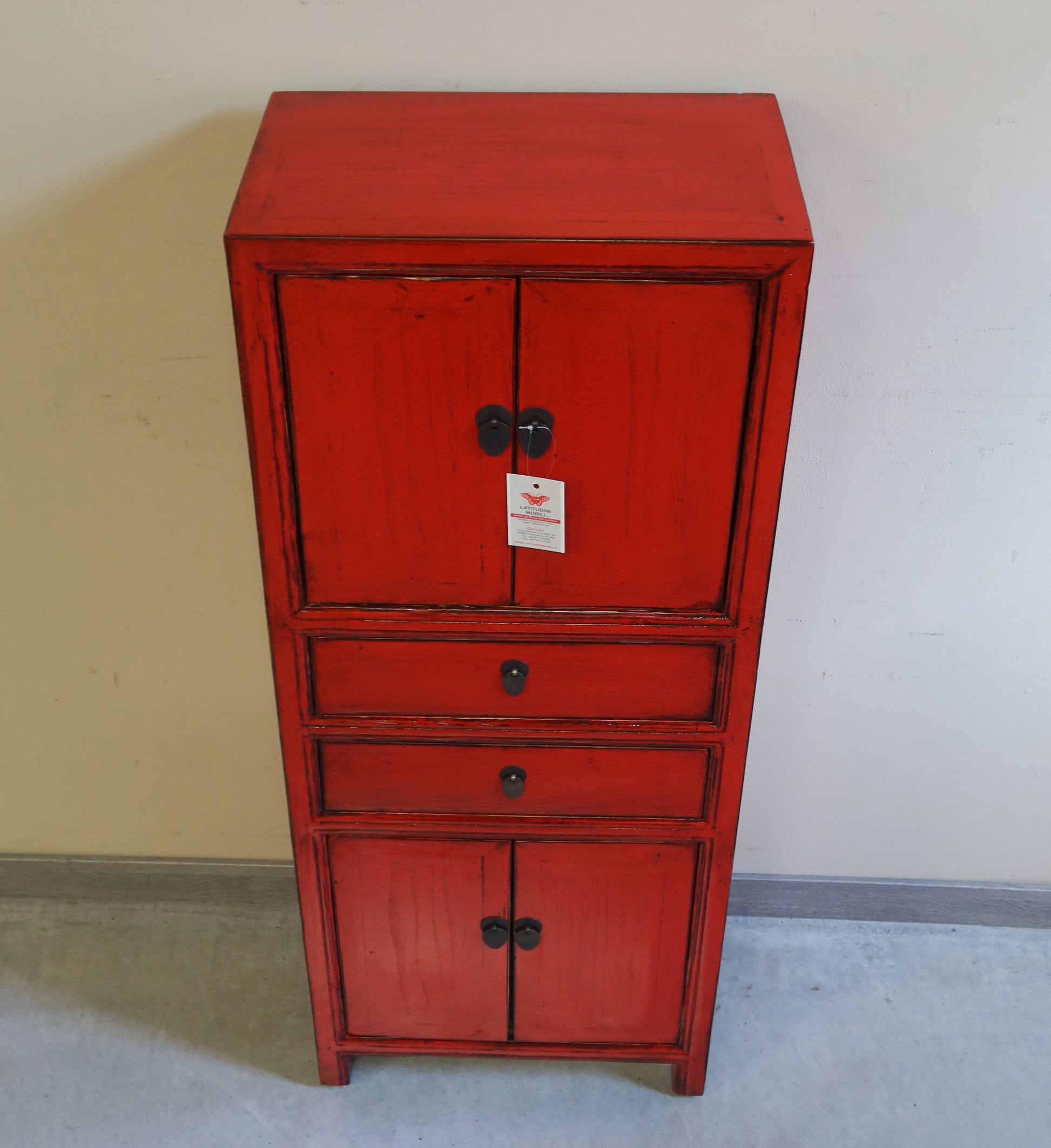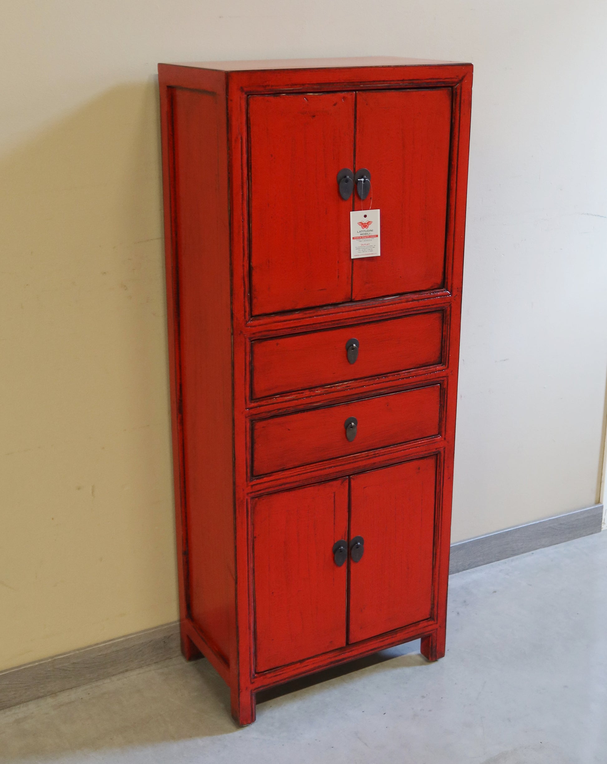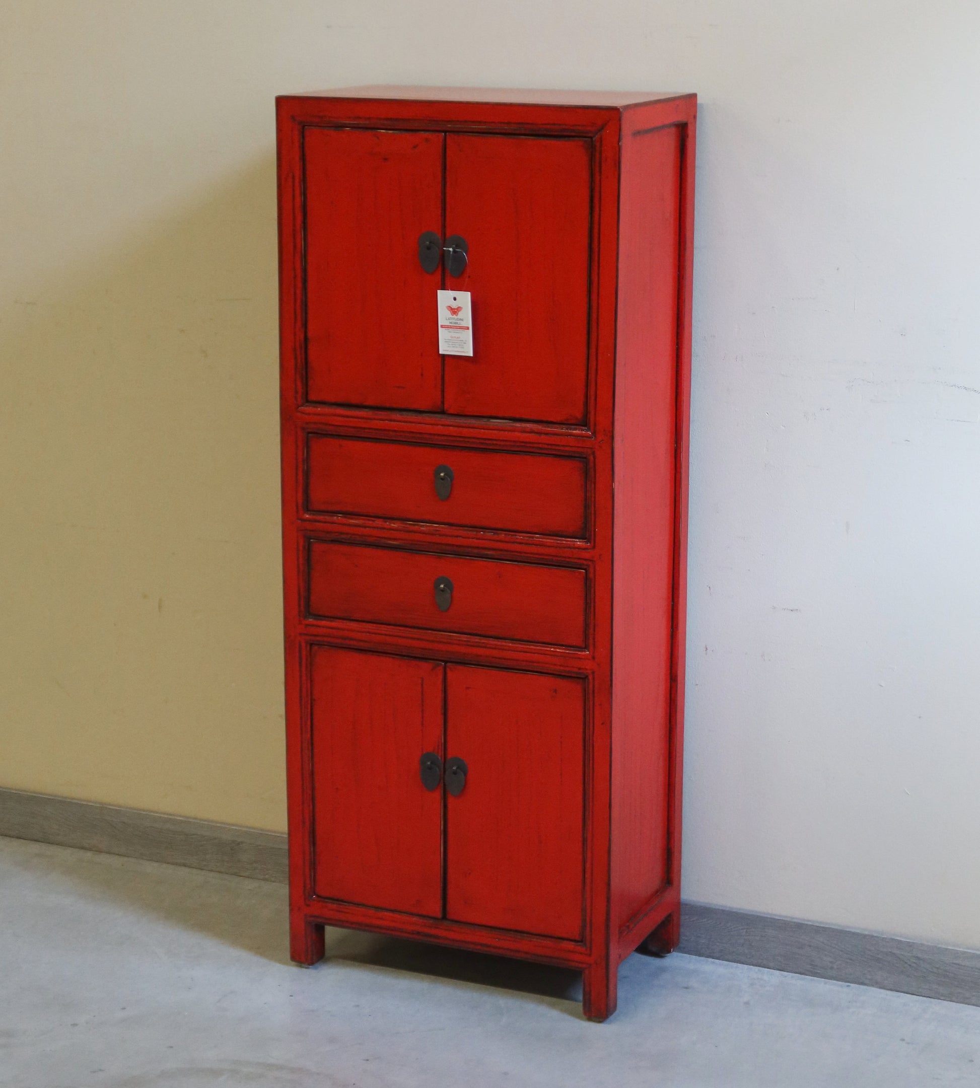 Stretto armadietto cinese con due doppie ante e cassetti. Un armadietto di dimensioni contenute, adatto a risolvere necessità di arredo e contenimento con un tocco di personalità.