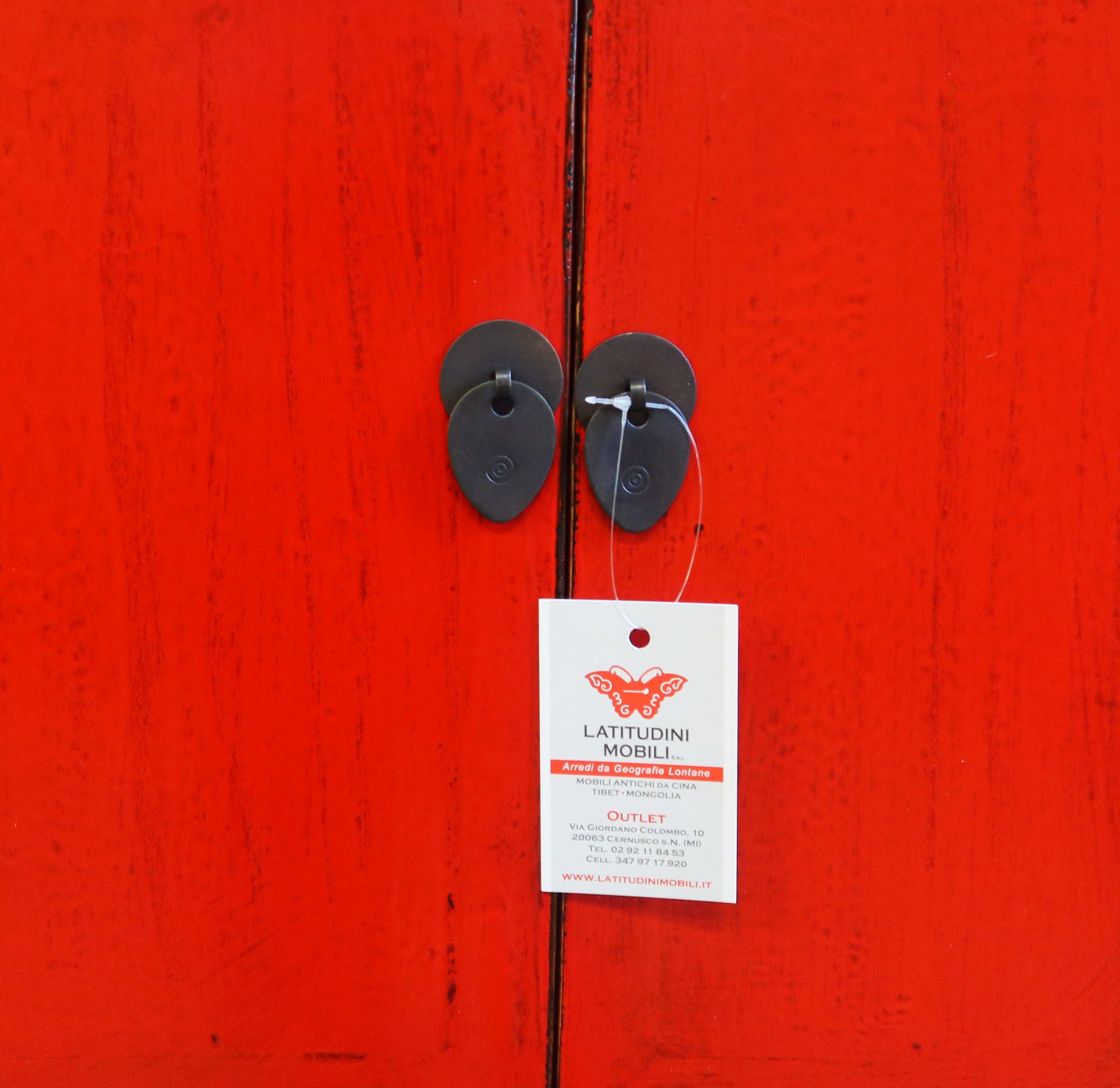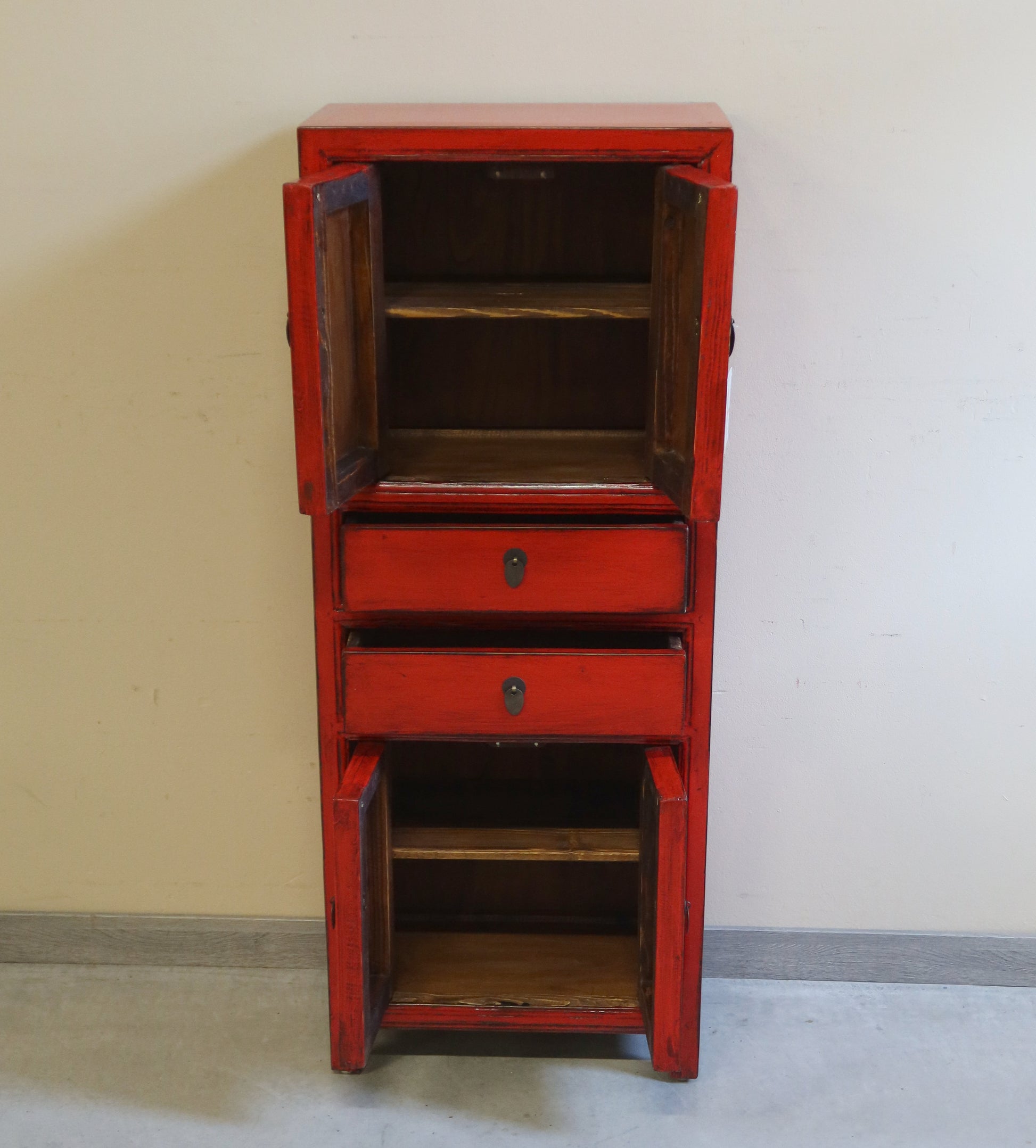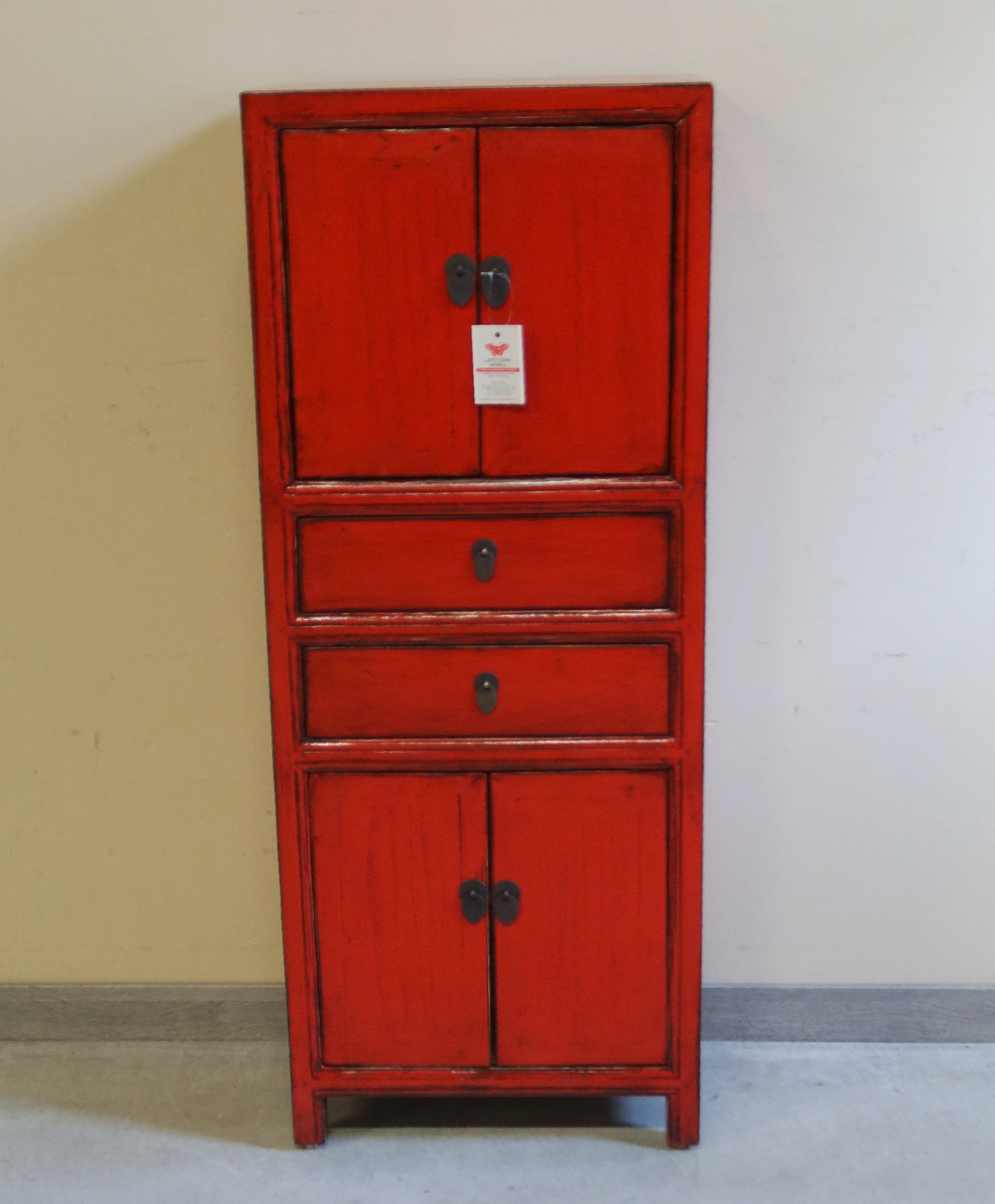 Stretto armadietto cinese con due doppie ante e cassetti. Un armadietto di dimensioni contenute, adatto a risolvere necessità di arredo e contenimento con un tocco di personalità.