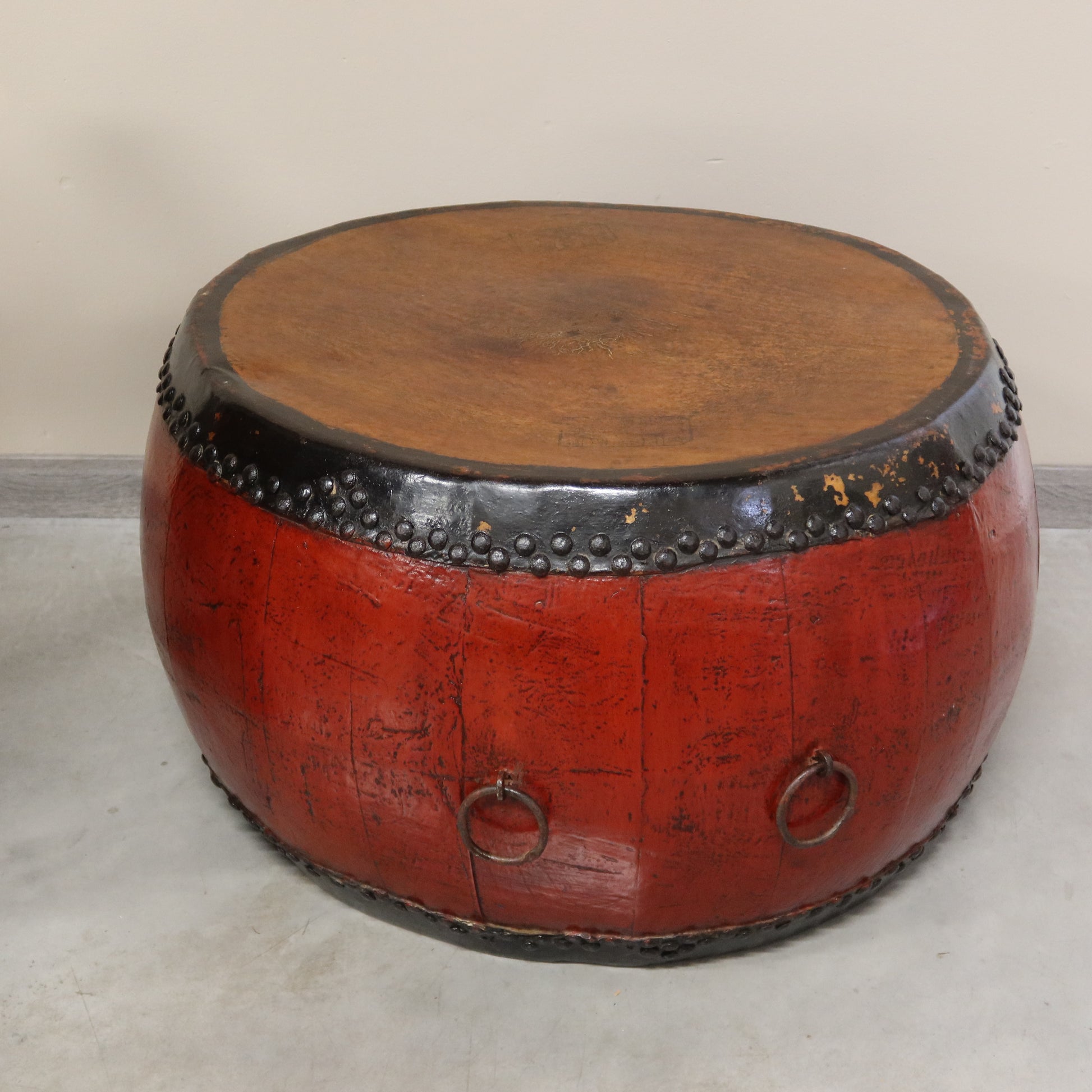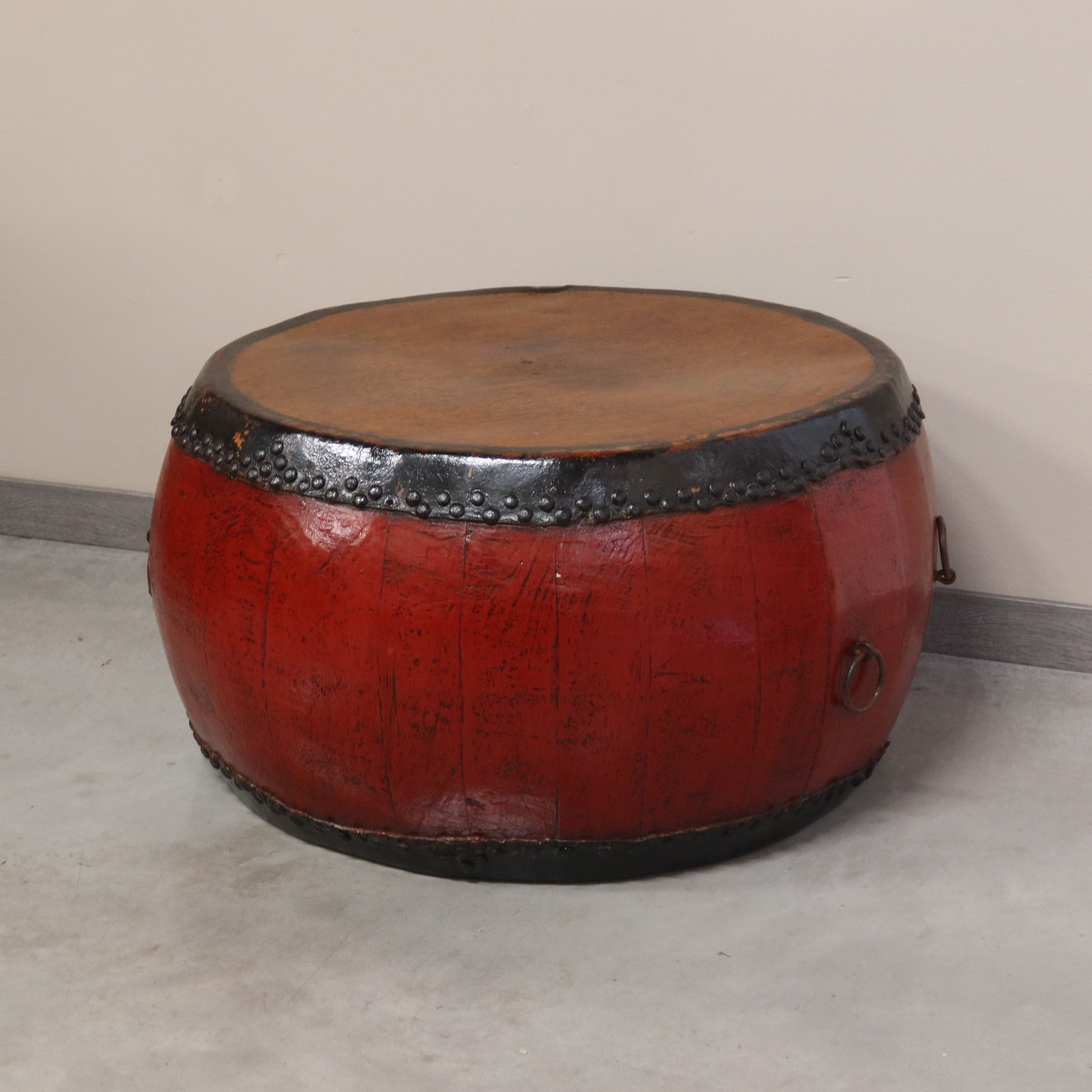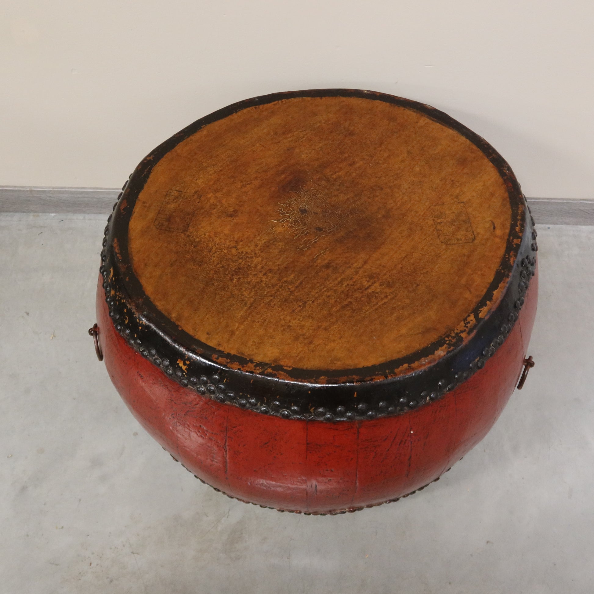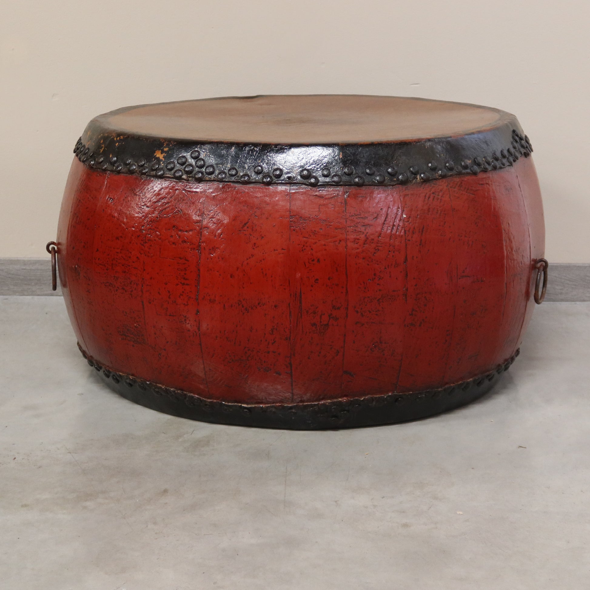 Tamburo cinese laccato con pergamena fissata alla struttura con decorative borchie metalliche, così come metallici sono gli anelli laterali. Di grande impatto decorativo, può essere utilizzato come base d'appoggio o anche come tavolino etnico in soggiorno! Il diametro del piano d'appoggio è cm 70; il diametro massimo alla stondatura è cm 84 come indicato in scheda.