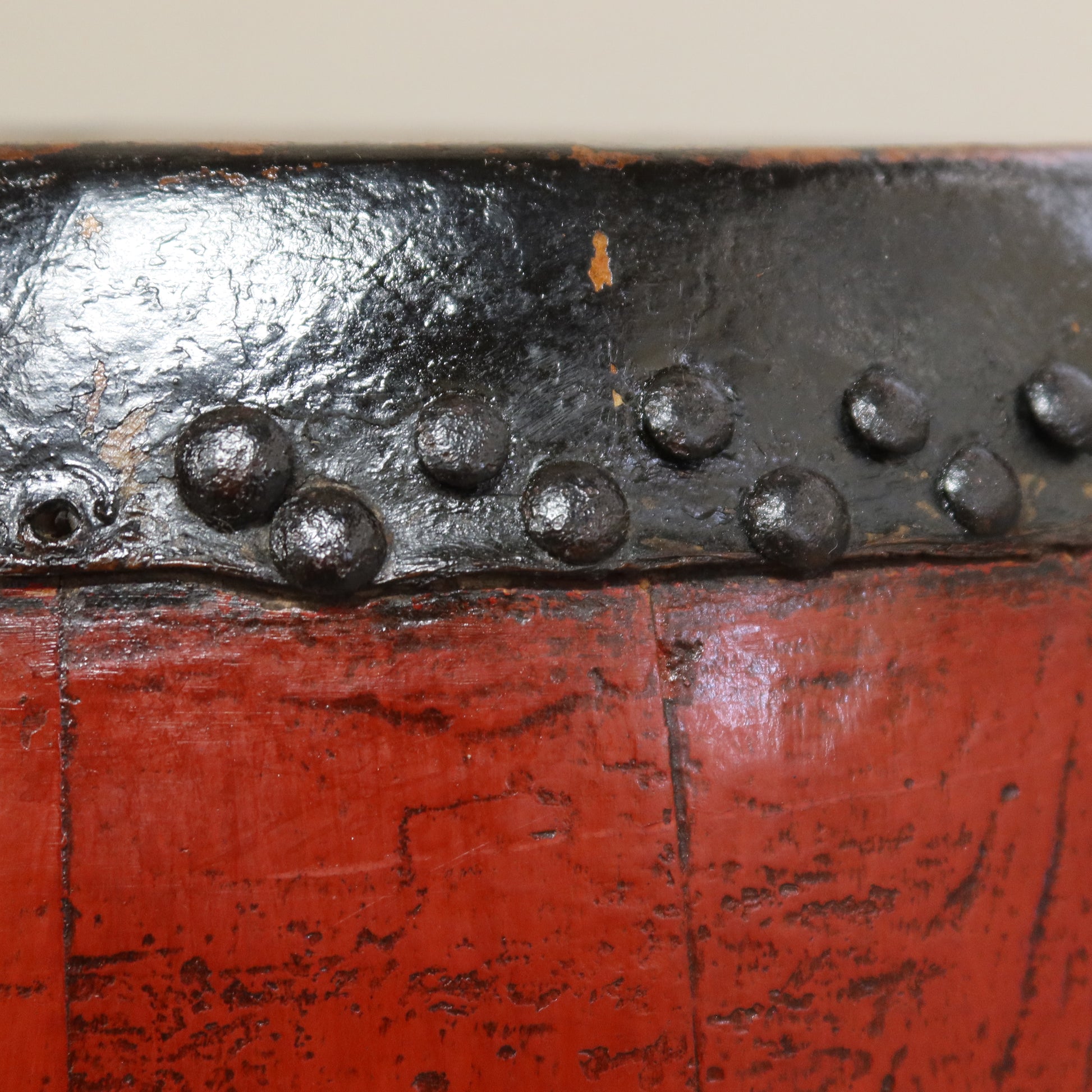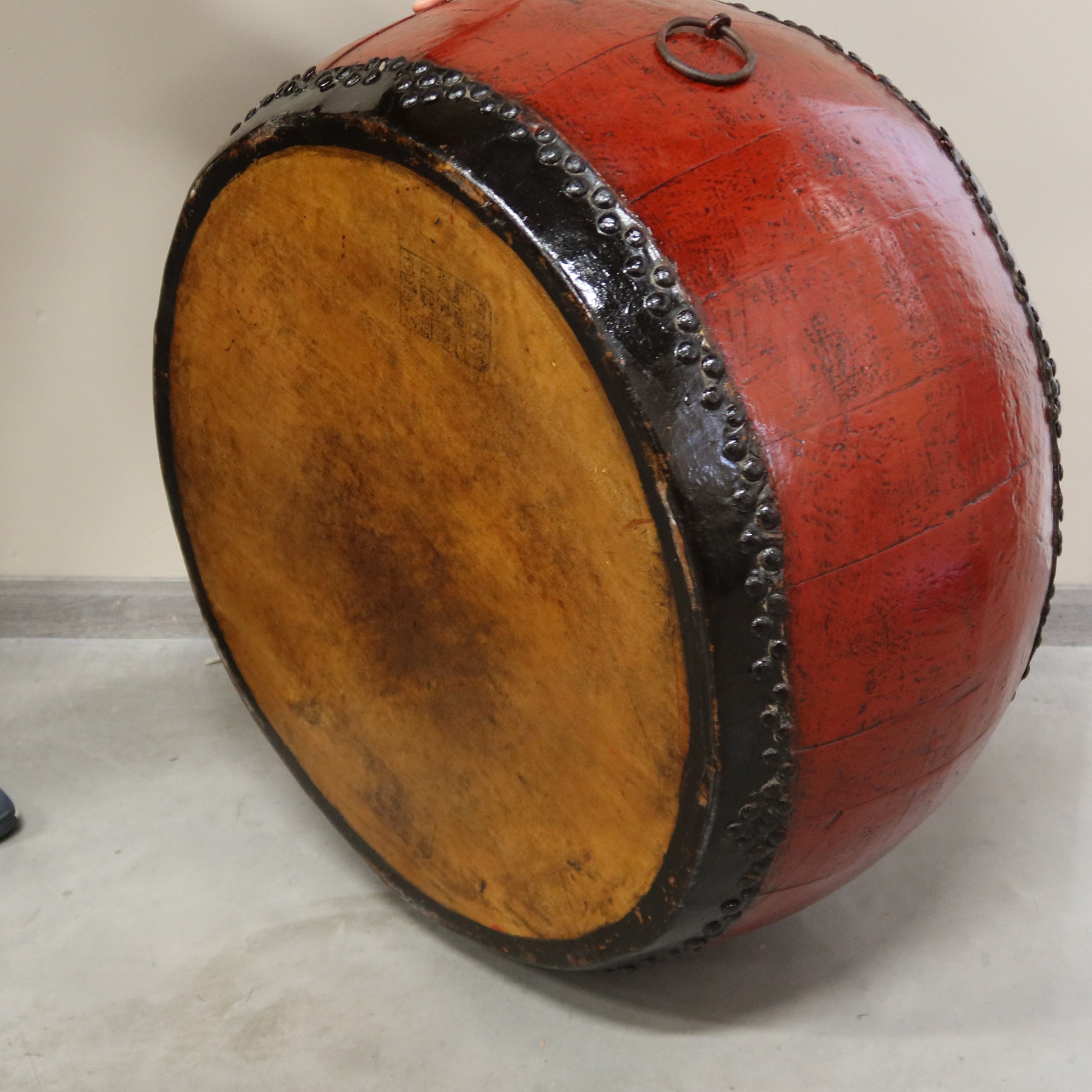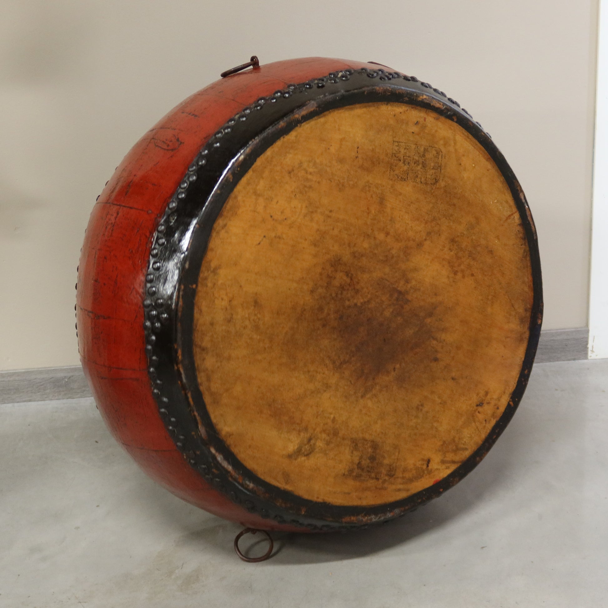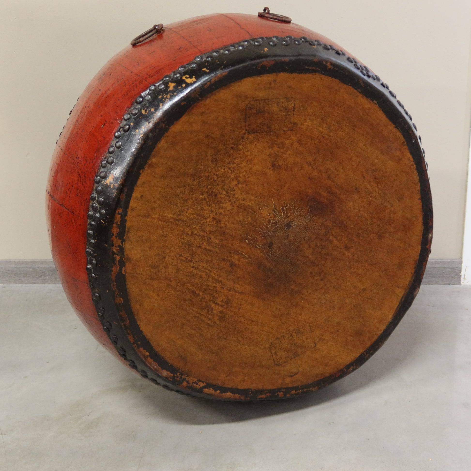 Tamburo cinese laccato con pergamena fissata alla struttura con decorative borchie metalliche, così come metallici sono gli anelli laterali. Di grande impatto decorativo, può essere utilizzato come base d'appoggio o anche come tavolino etnico in soggiorno! Il diametro del piano d'appoggio è cm 70; il diametro massimo alla stondatura è cm 84 come indicato in scheda.