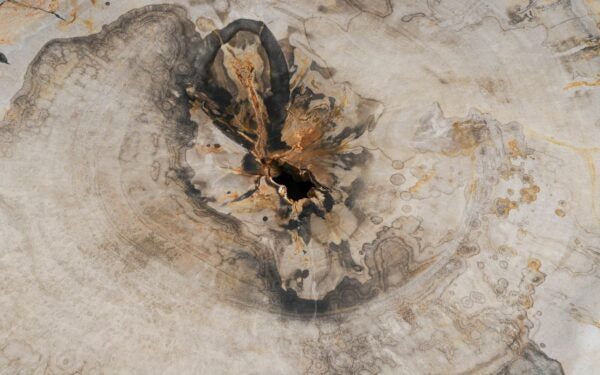 Questo tavolino in legno pietrificato unisce design e storia. Il piano, ricavato da un albero vissuto 20 milioni di anni fa, mostra colori unici frutto della naturale mineralizzazione nel tempo.