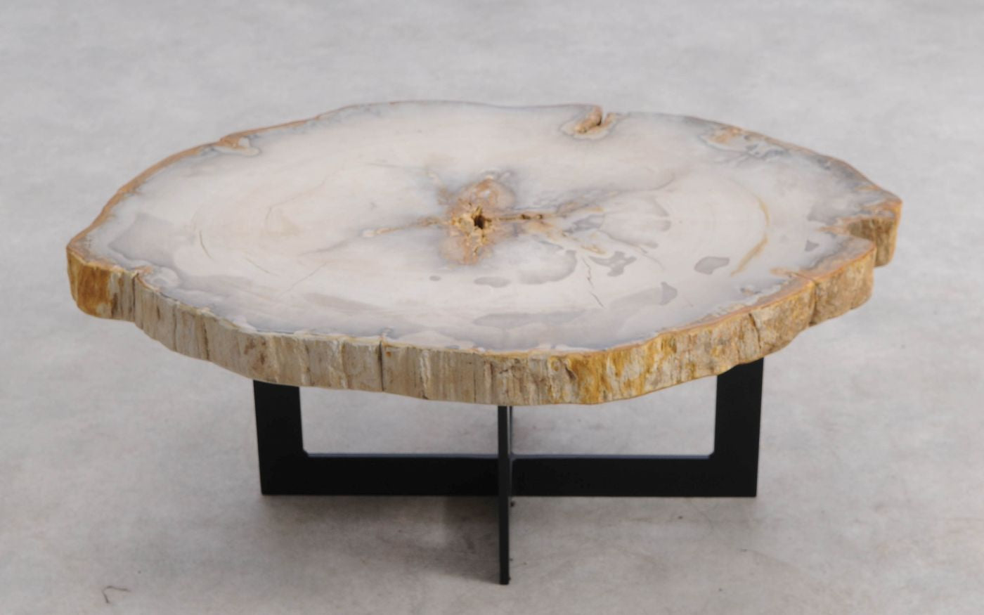Questo tavolino in legno pietrificato unisce design e storia. Il piano, ricavato da un albero vissuto 20 milioni di anni fa, mostra colori unici frutto della naturale mineralizzazione nel tempo.