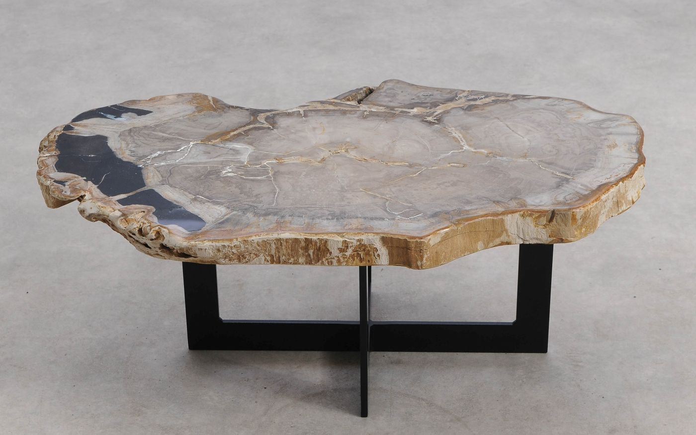 Questo tavolino in legno pietrificato unisce design e storia. Il piano, ricavato da un albero vissuto 20 milioni di anni fa, mostra colori unici frutto della naturale mineralizzazione nel tempo.