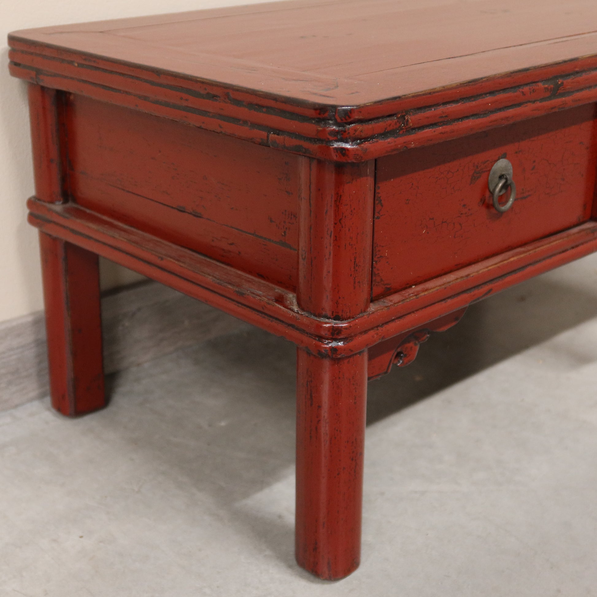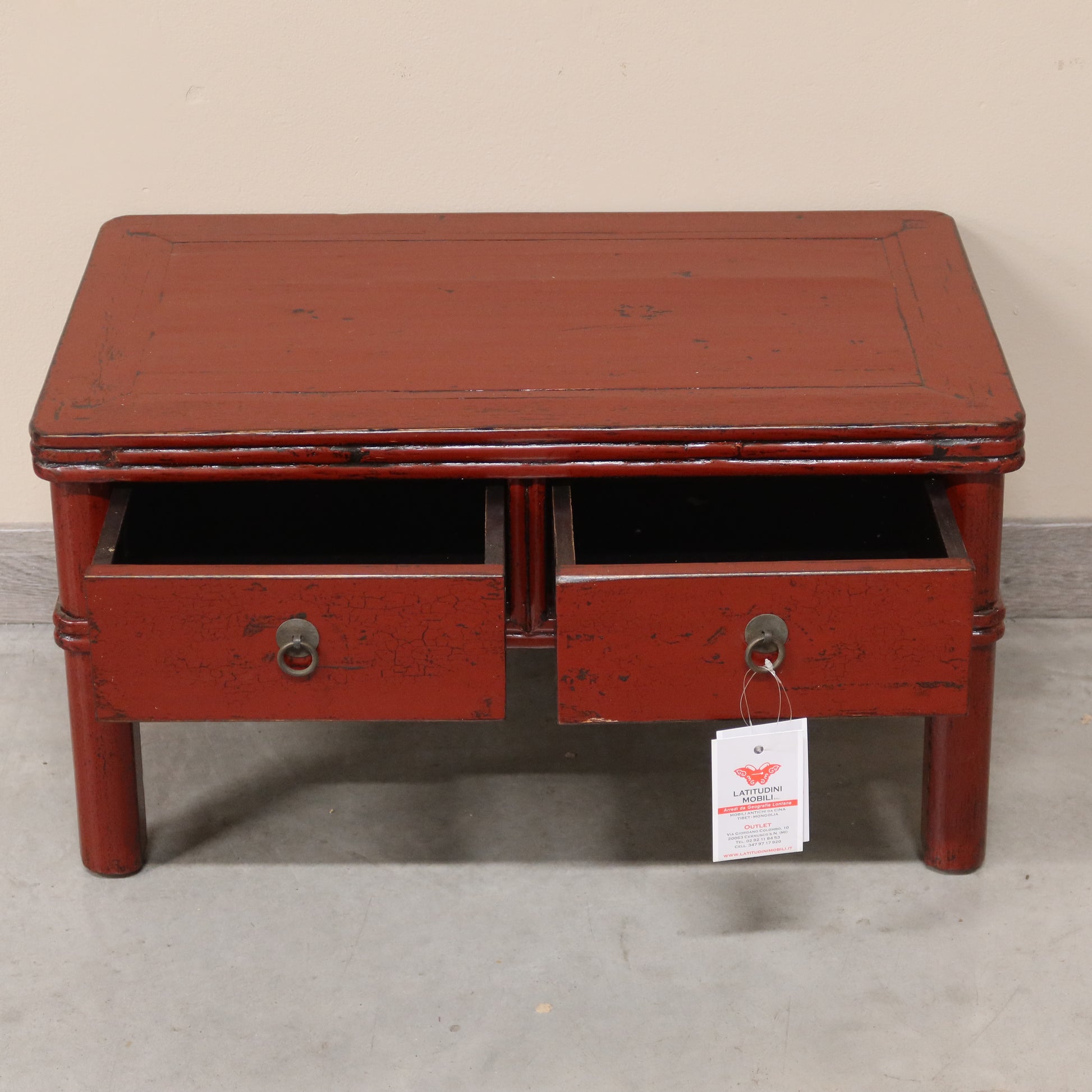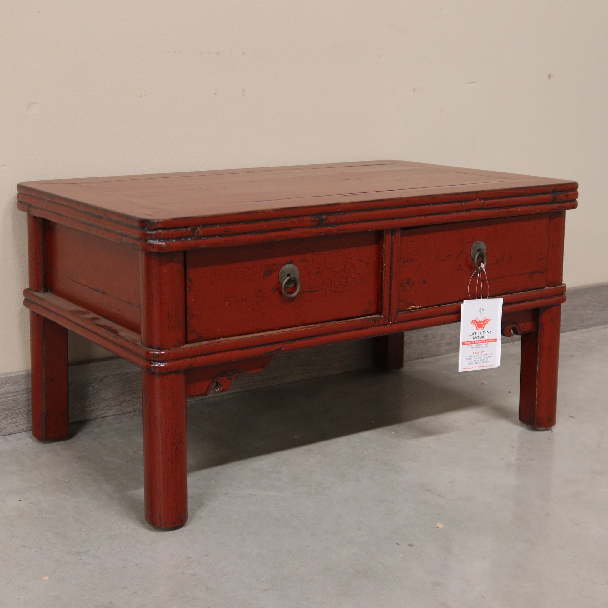 Piccolo tavolino orientale a due cassetti in olmo cinese in lacca bordeaux
