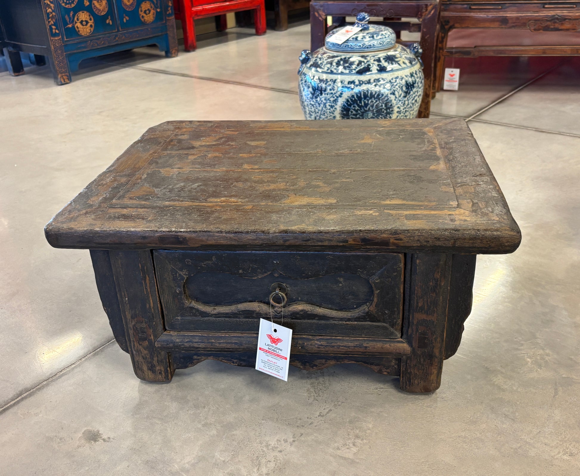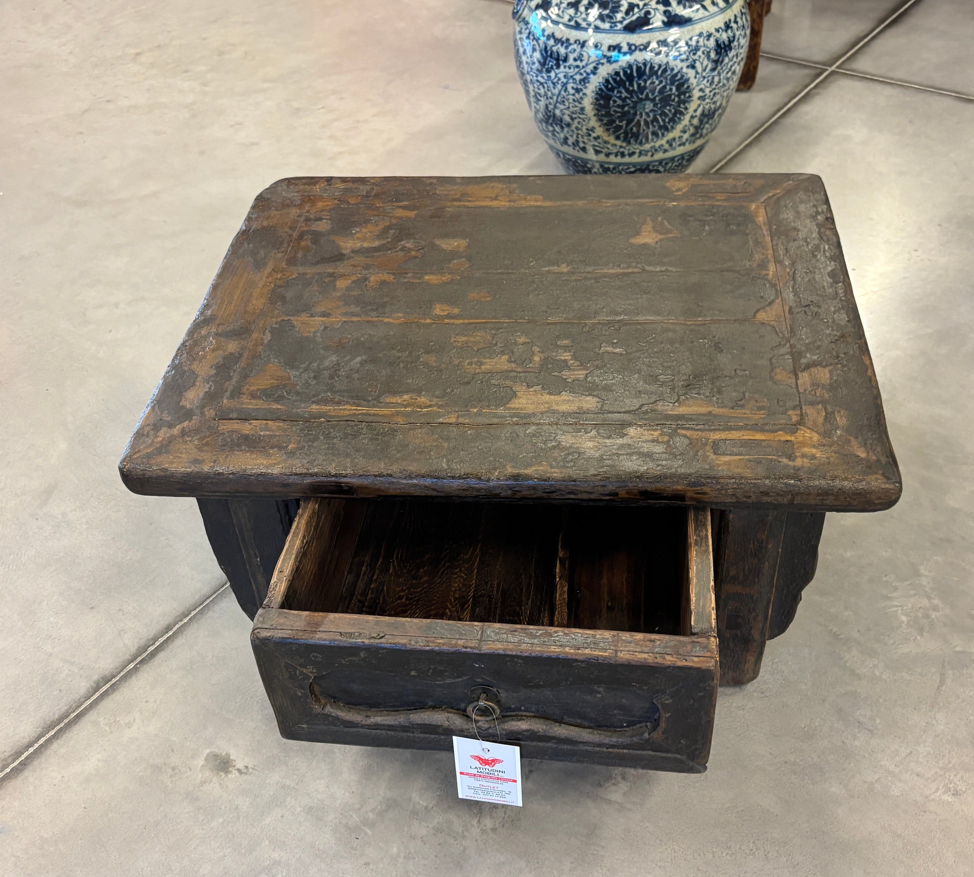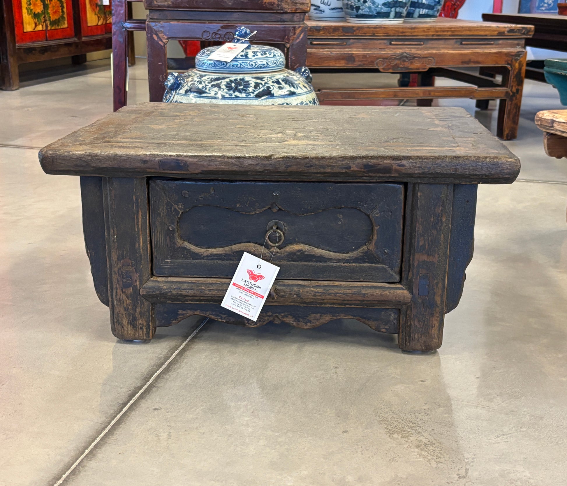 Altarino in patina in olmo cinese con caratteristico piano aggettante e fronte ad un cassetto. Provenienza regione di Pechino.