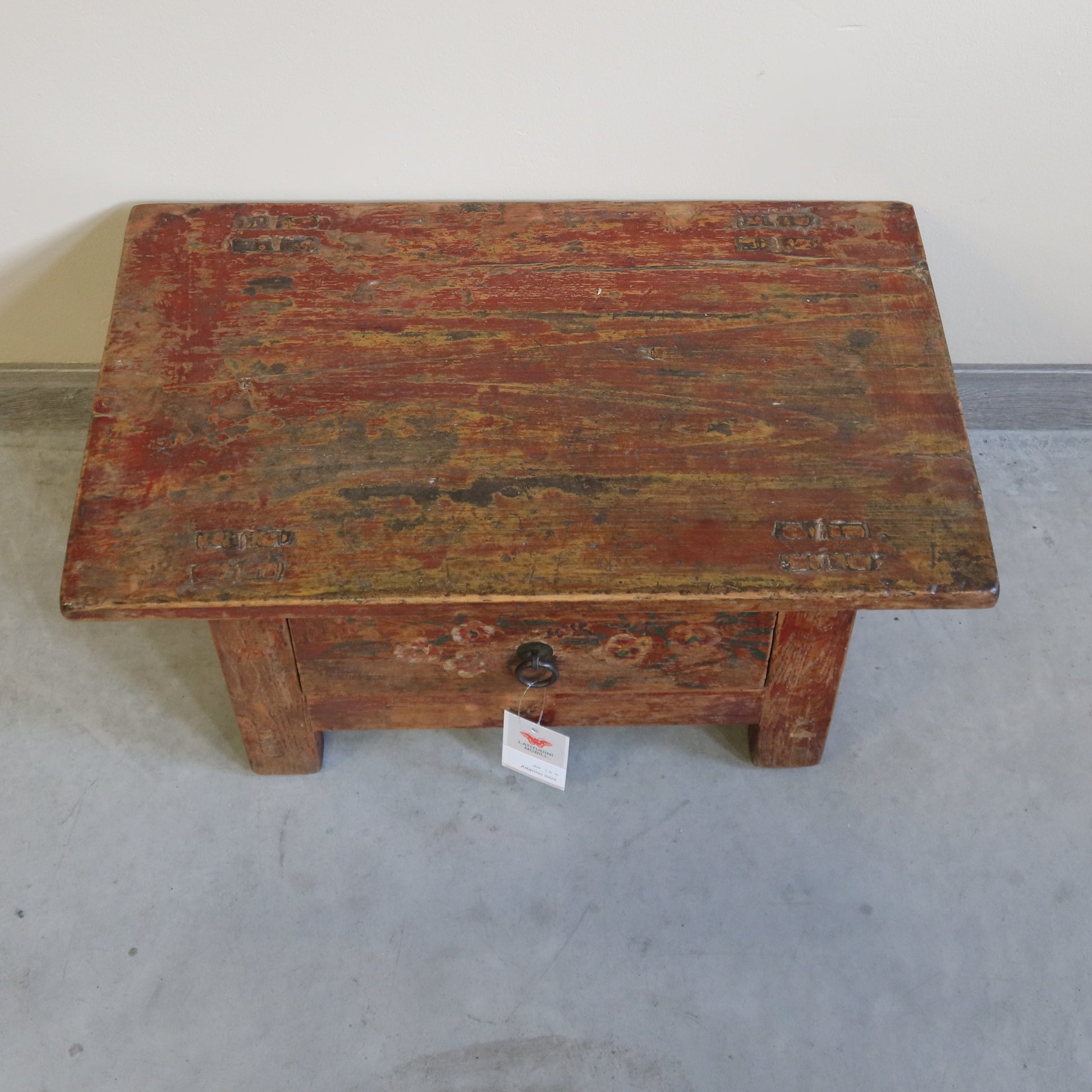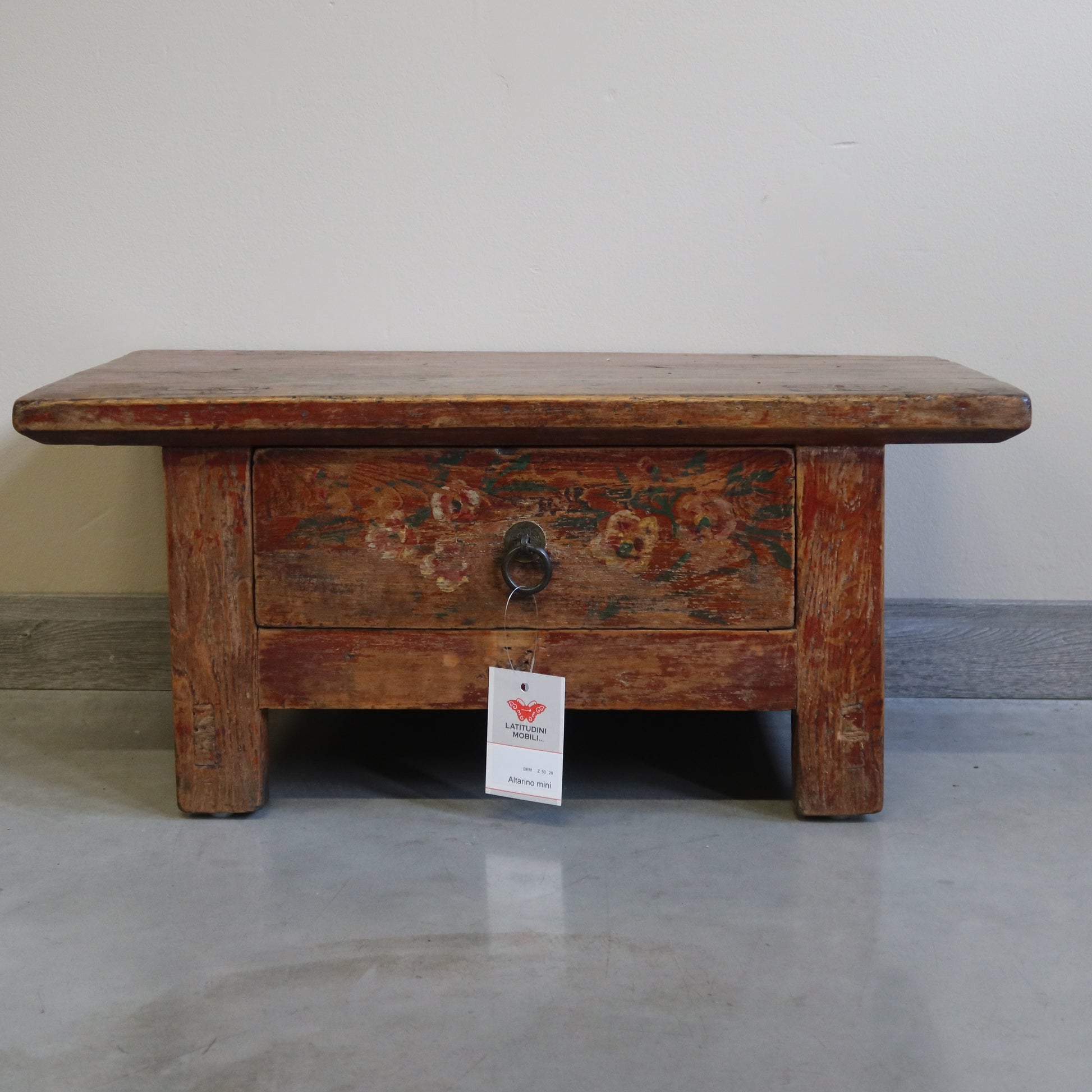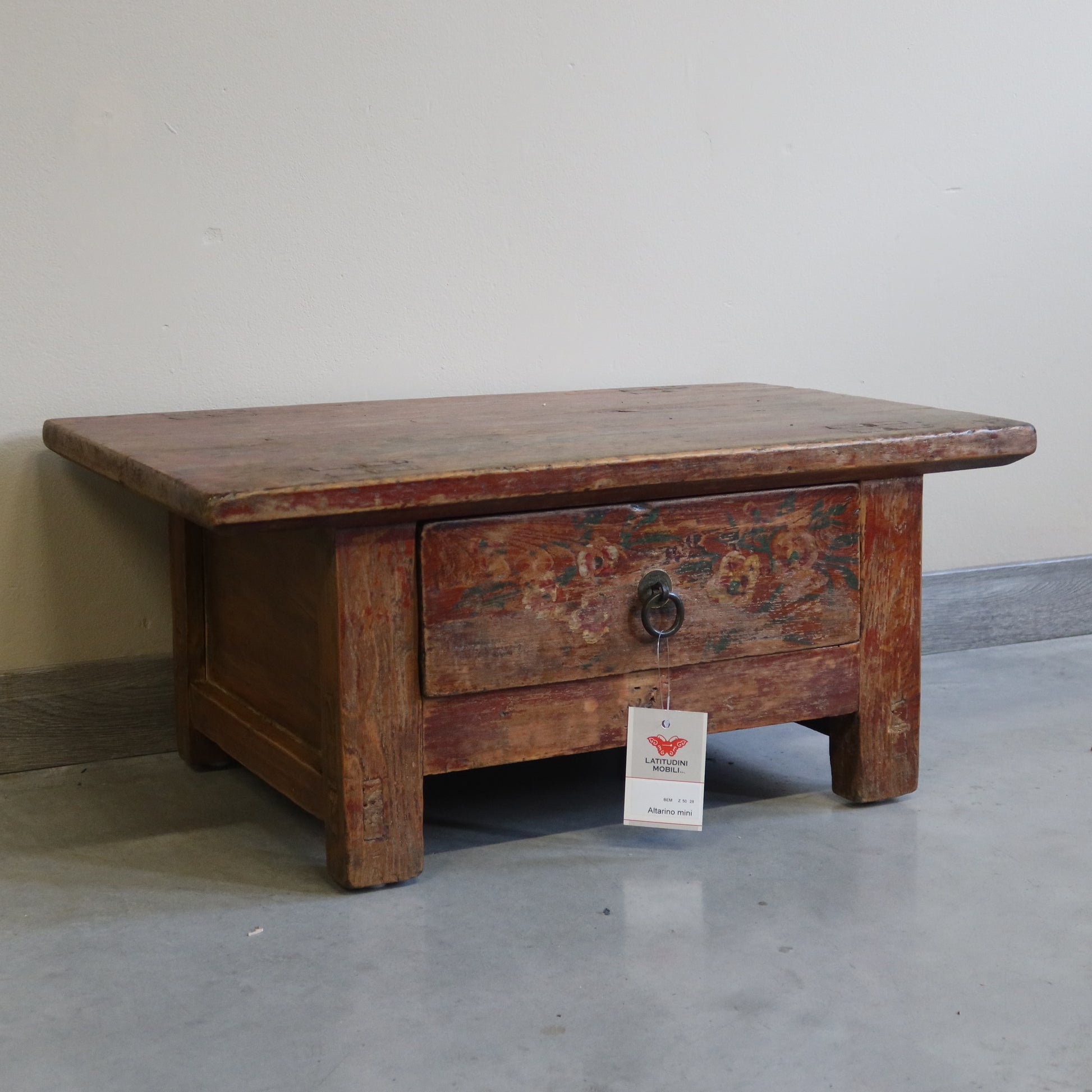 Altarino in patina in olmo cinese con caratteristico piano aggettante e fronte ad un cassetto con decoro lieve. Provenienza regione di Pechino.