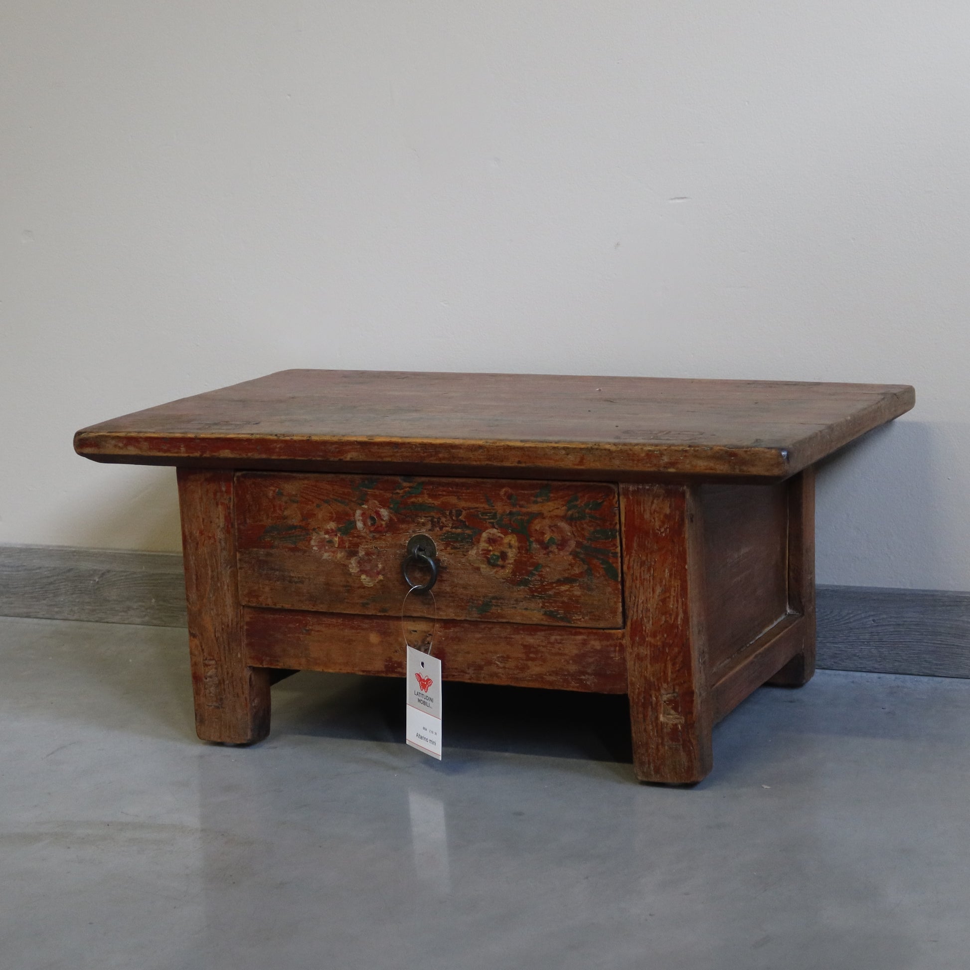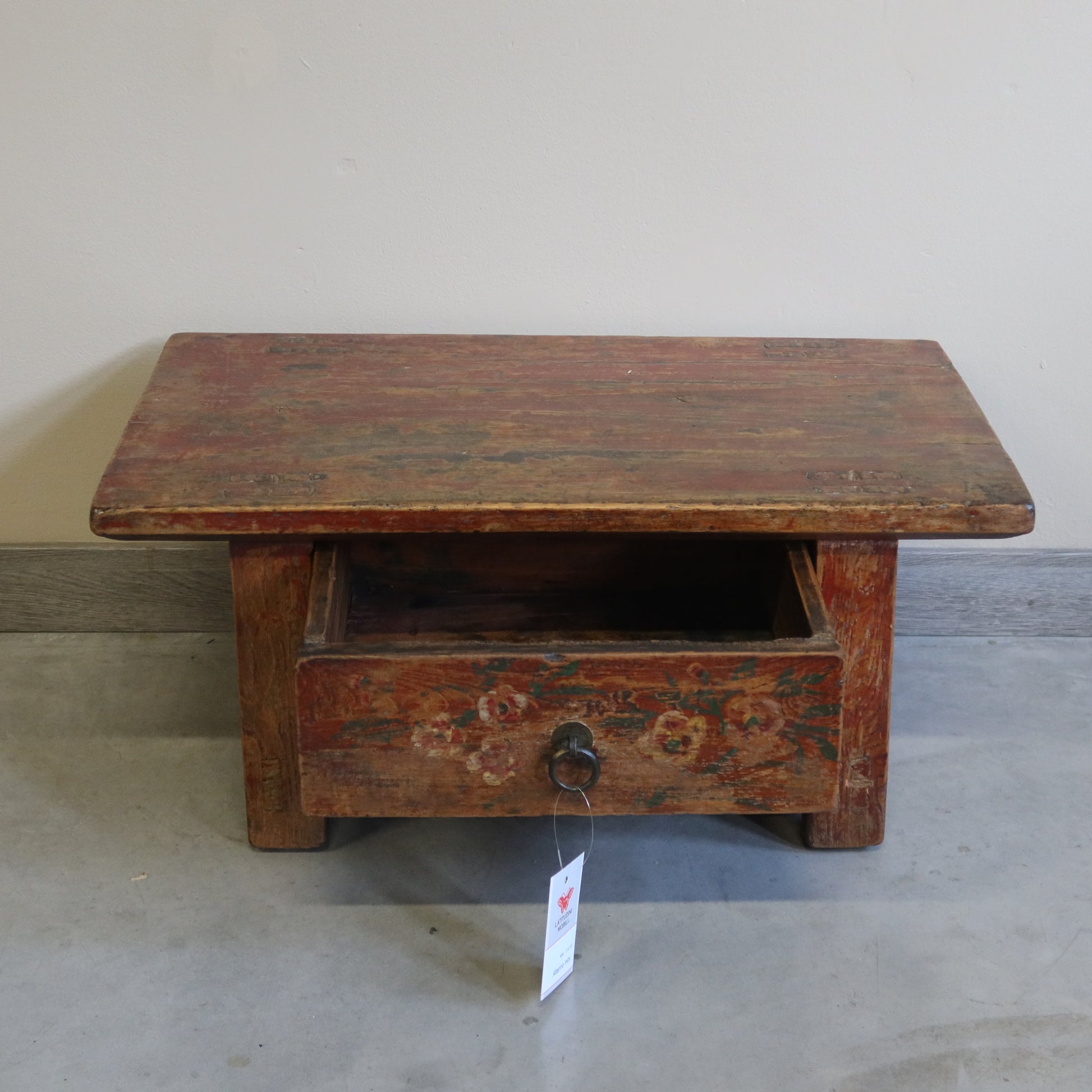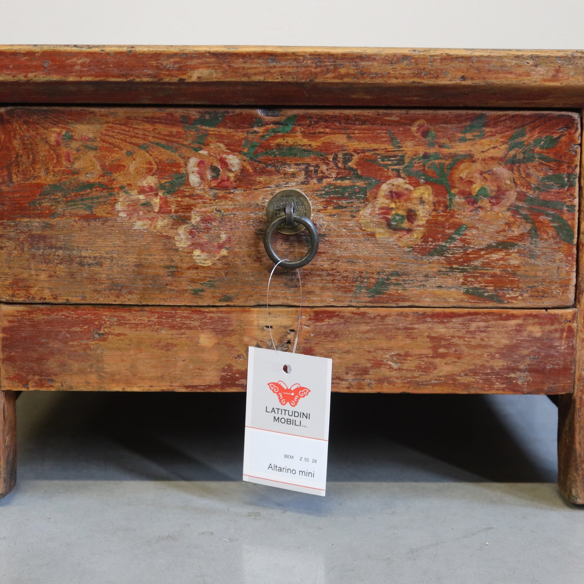 Altarino in patina in olmo cinese con caratteristico piano aggettante e fronte ad un cassetto con decoro lieve. Provenienza regione di Pechino.