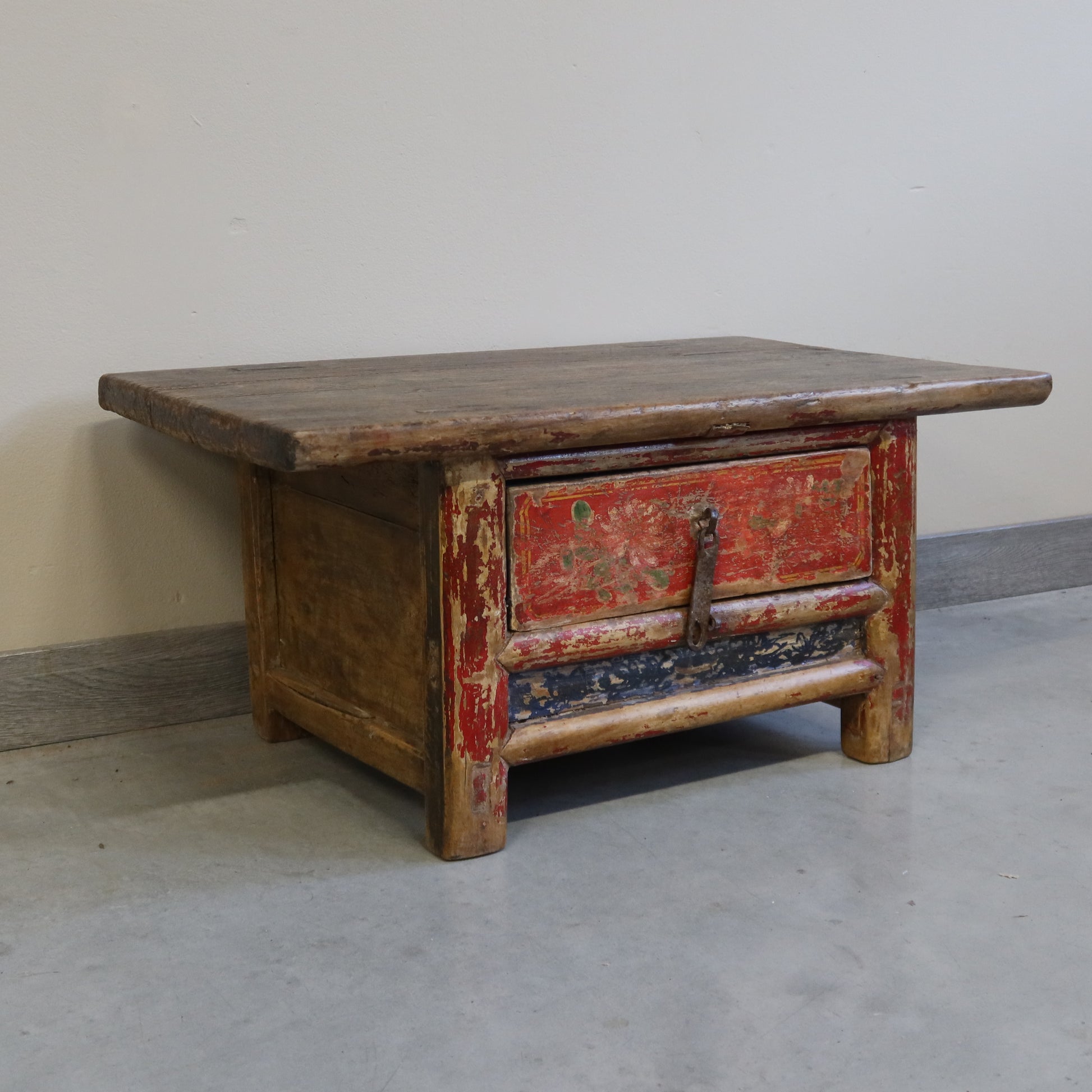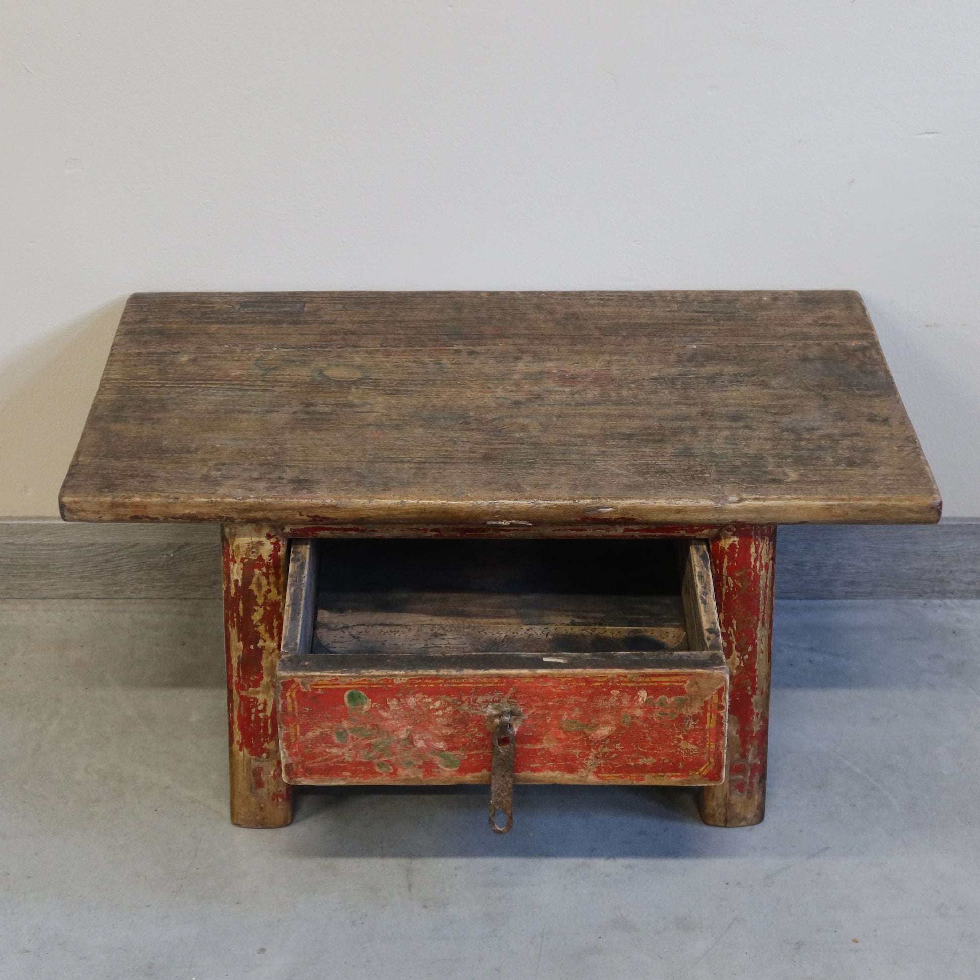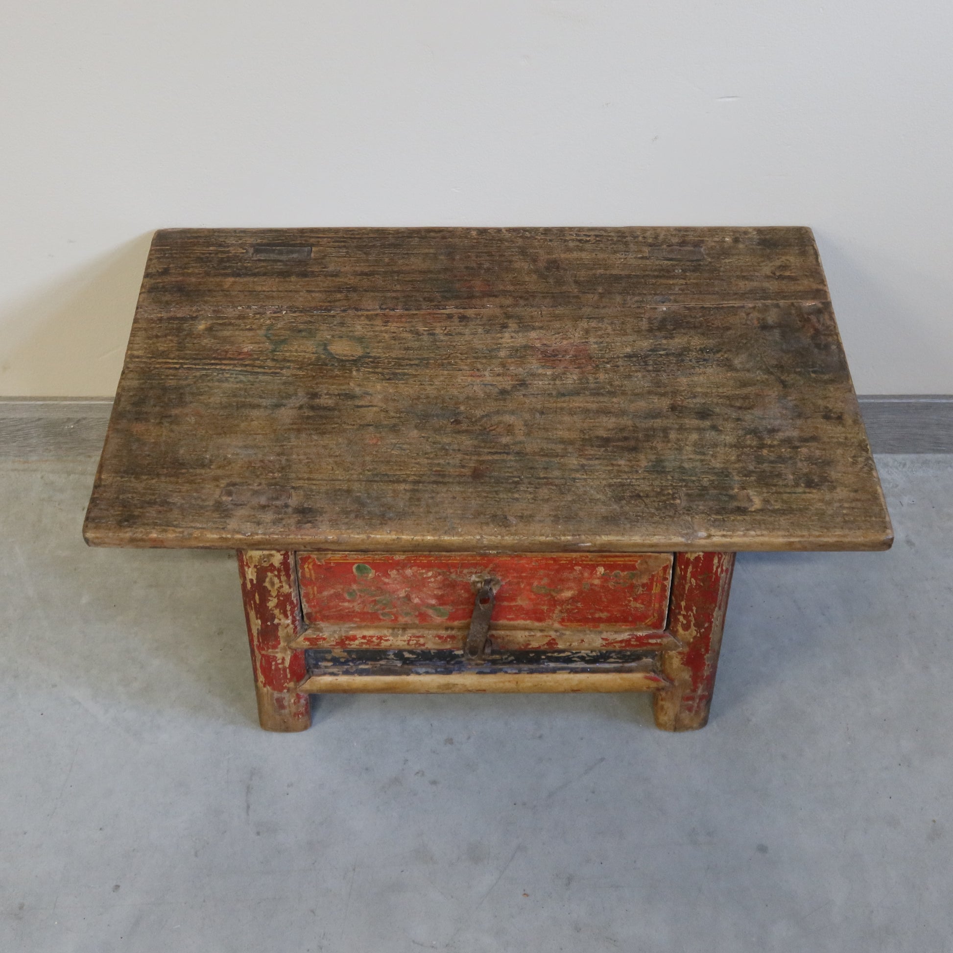 Tavolino in patina in olmo cinese con caratteristico piano aggettante e fronte ad un cassetto con decoro lieve. Provenienza regione di Pechino.