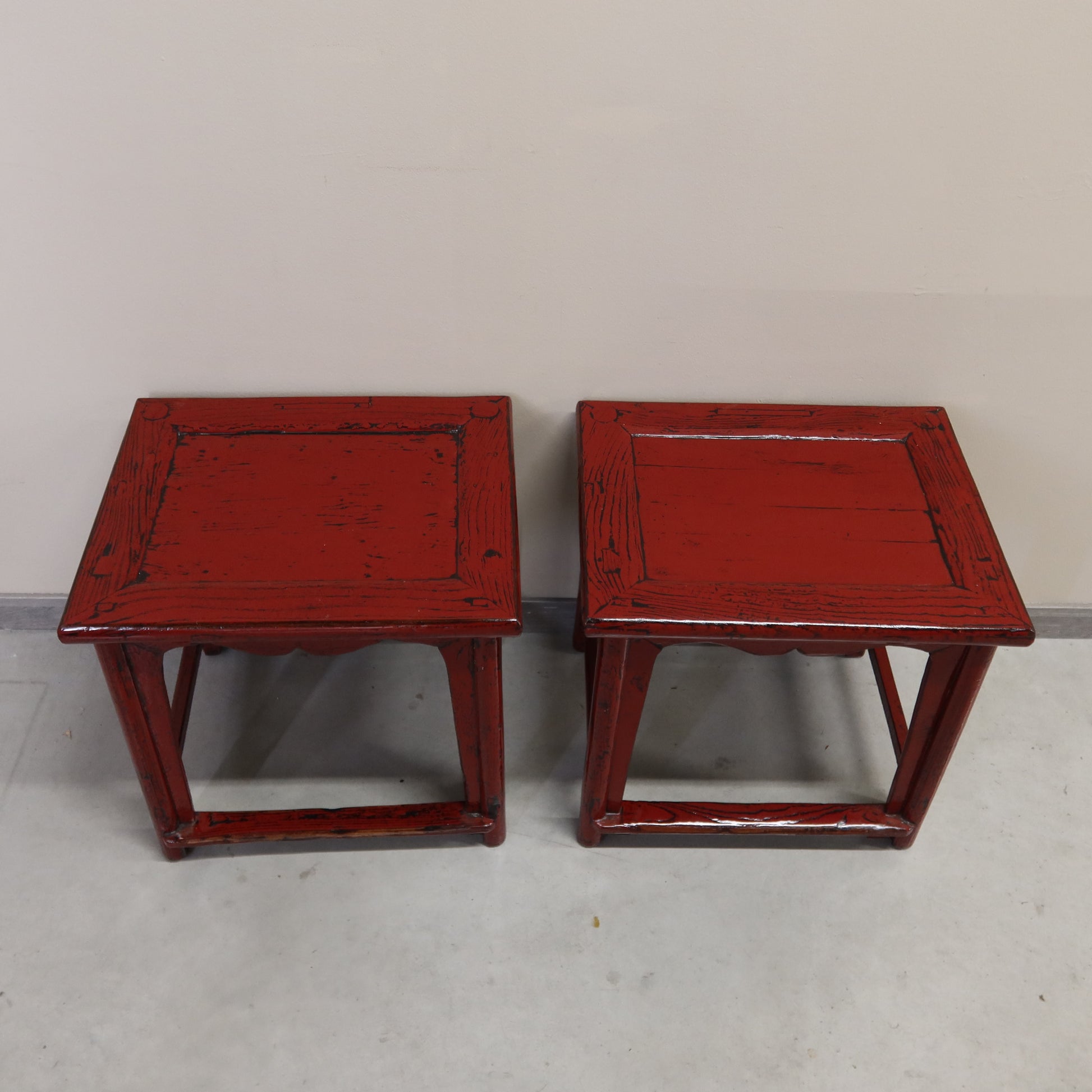 Elegante tavolino in lacca bordeaux con le traverse centrali e il bordo della seduta che riportano un semplice motivo decorativo orizzontale. L'essenza è l'olmo cinese. Il prezzo indicato è per singolo tavolino.