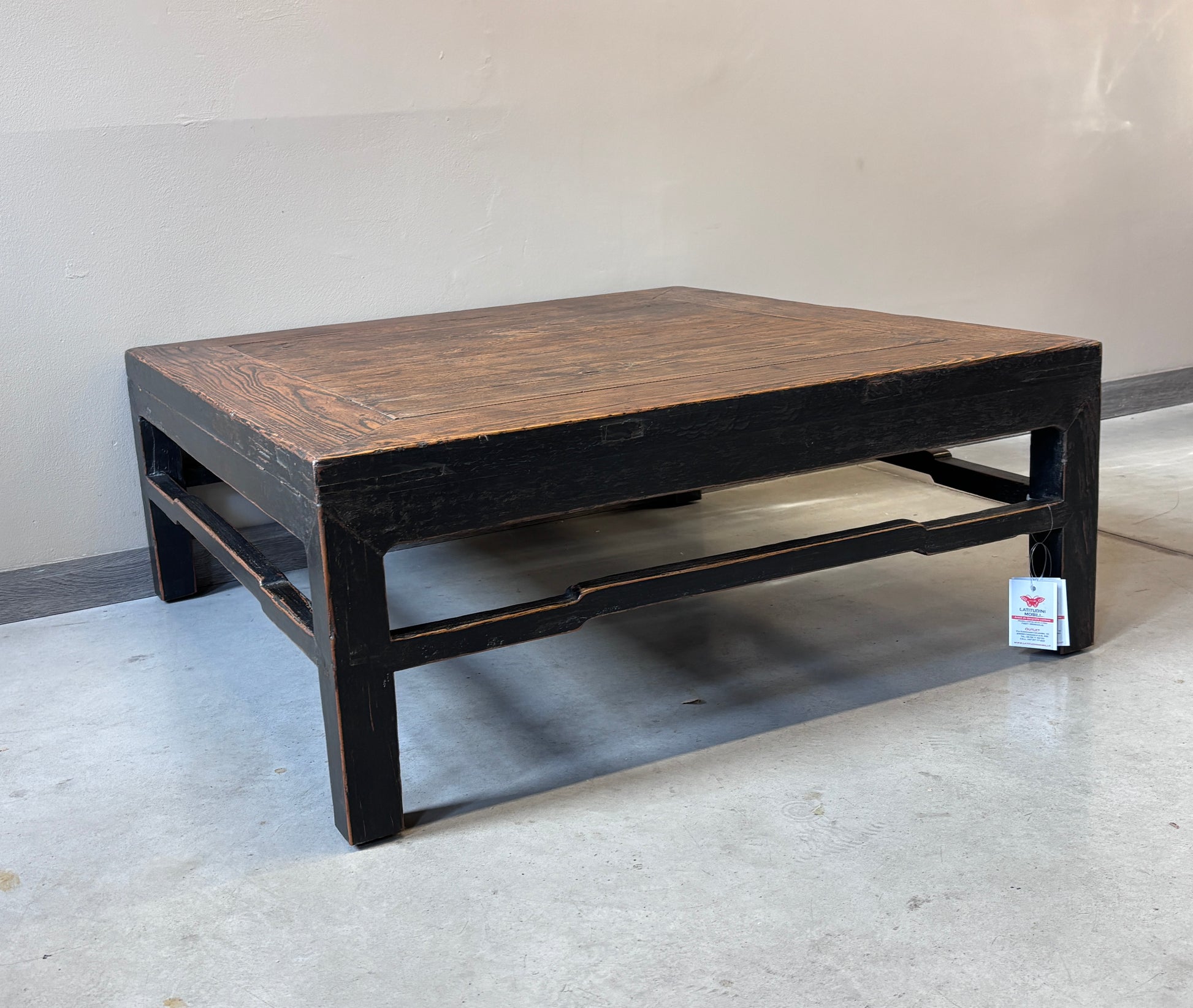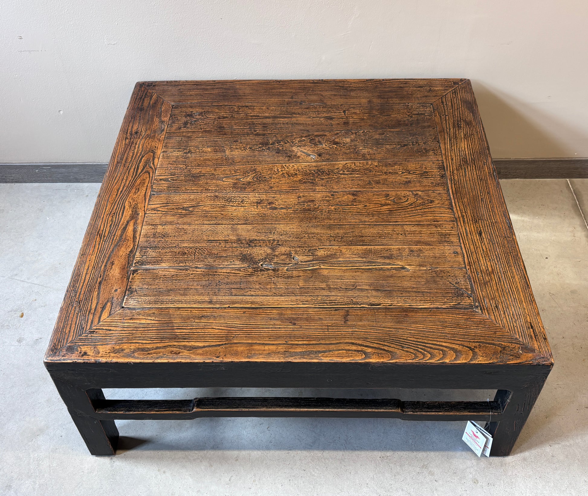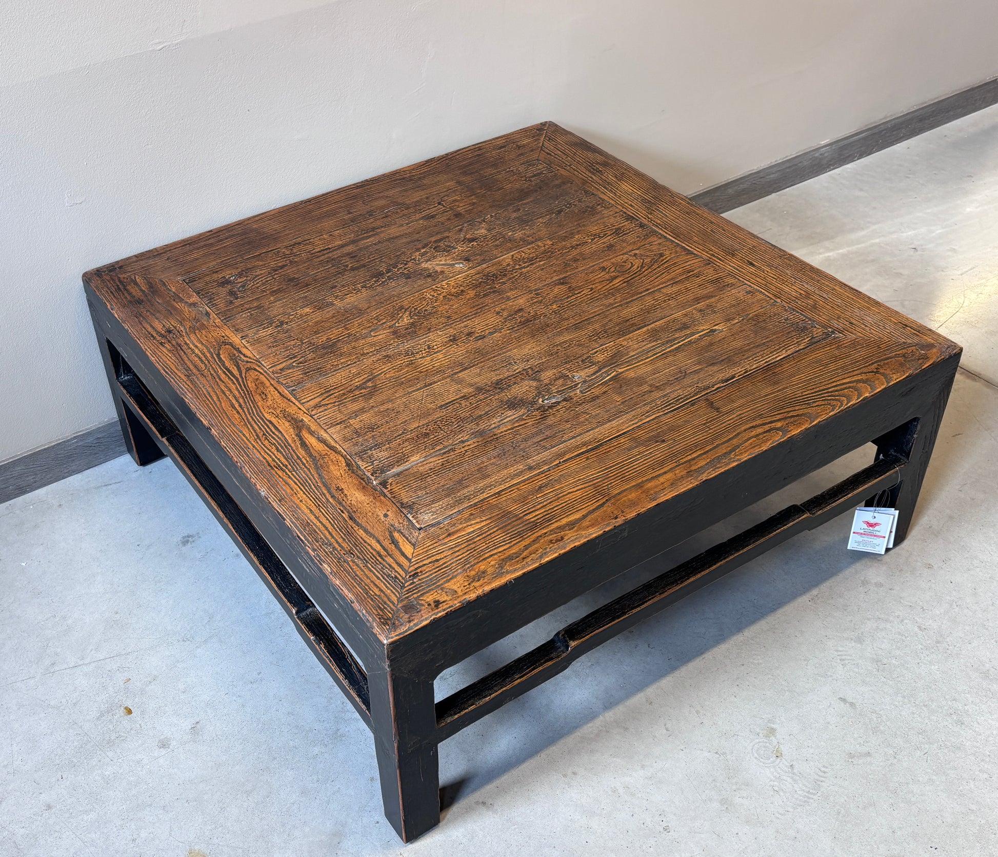 Rigoroso tavolo basso cinese in legno massello, con gambe e traverse in lacca scura e piano nel colore naturale. Particolarmente bella è la venatura del piano. Forma quadrata. Adatto come tavolo da salotto davanti al divano.
