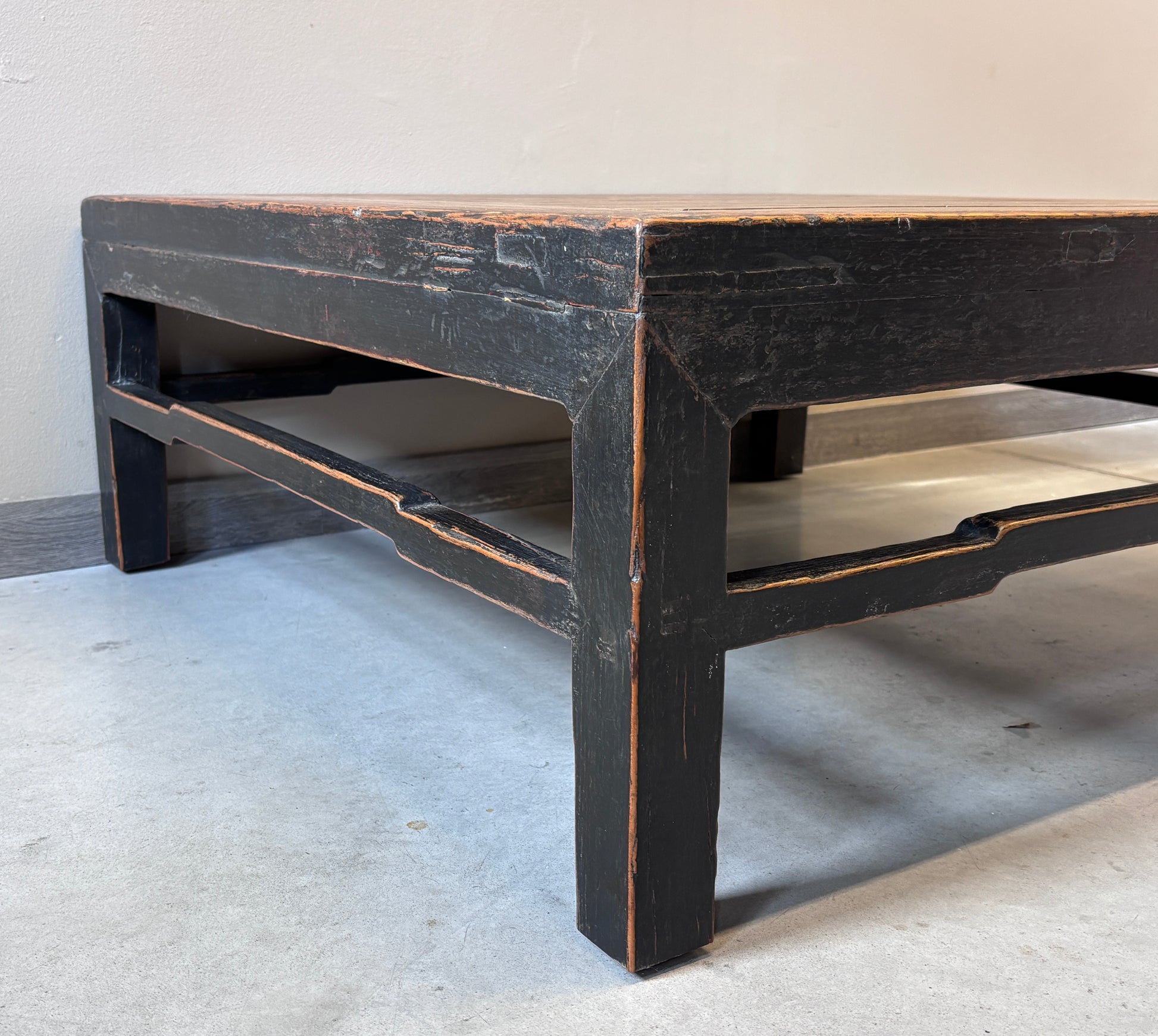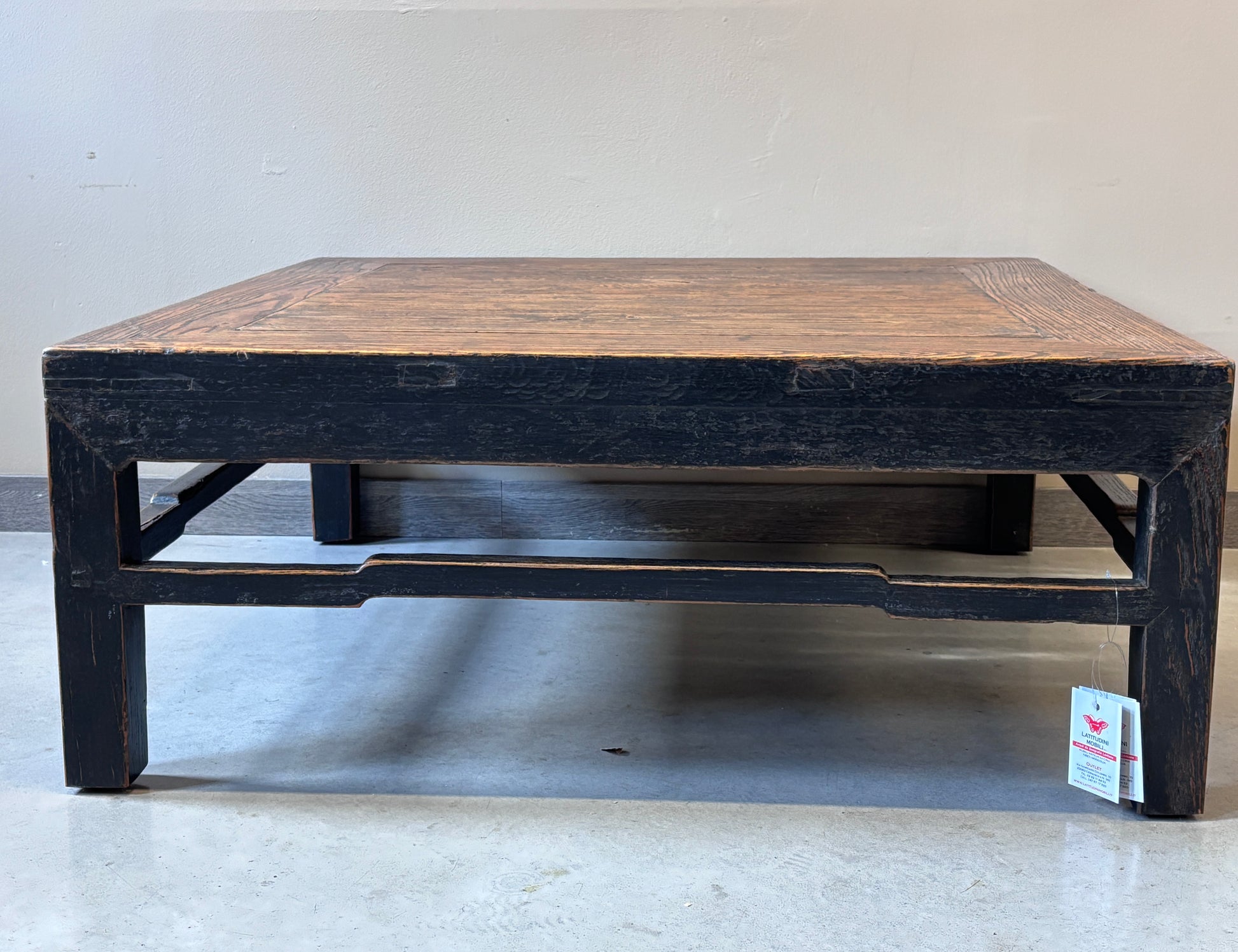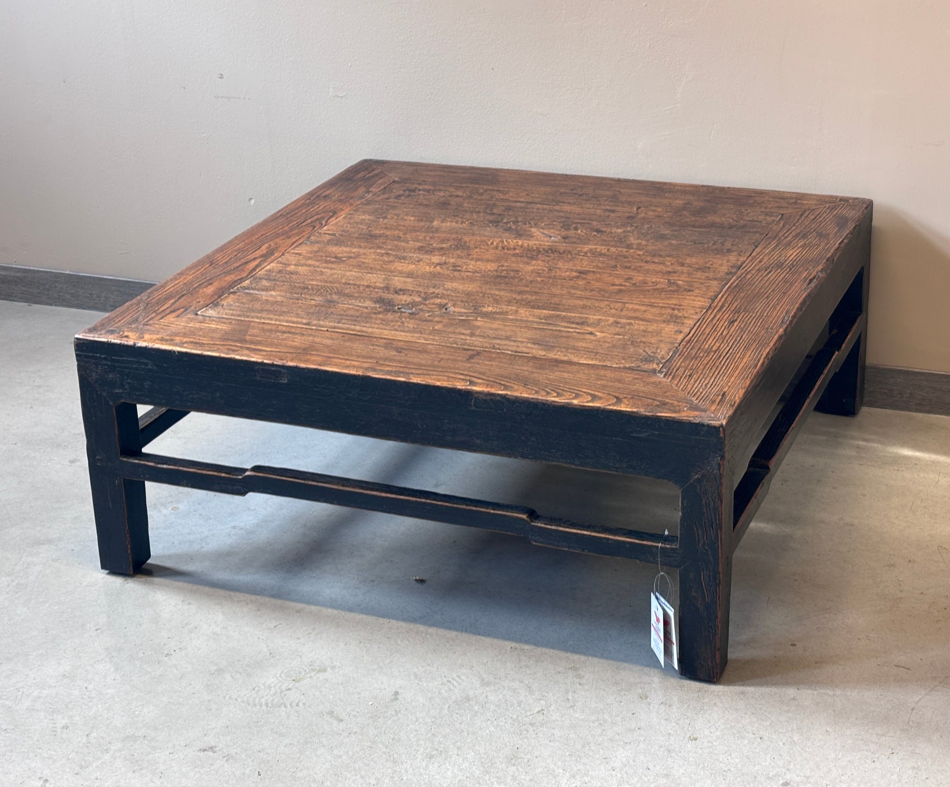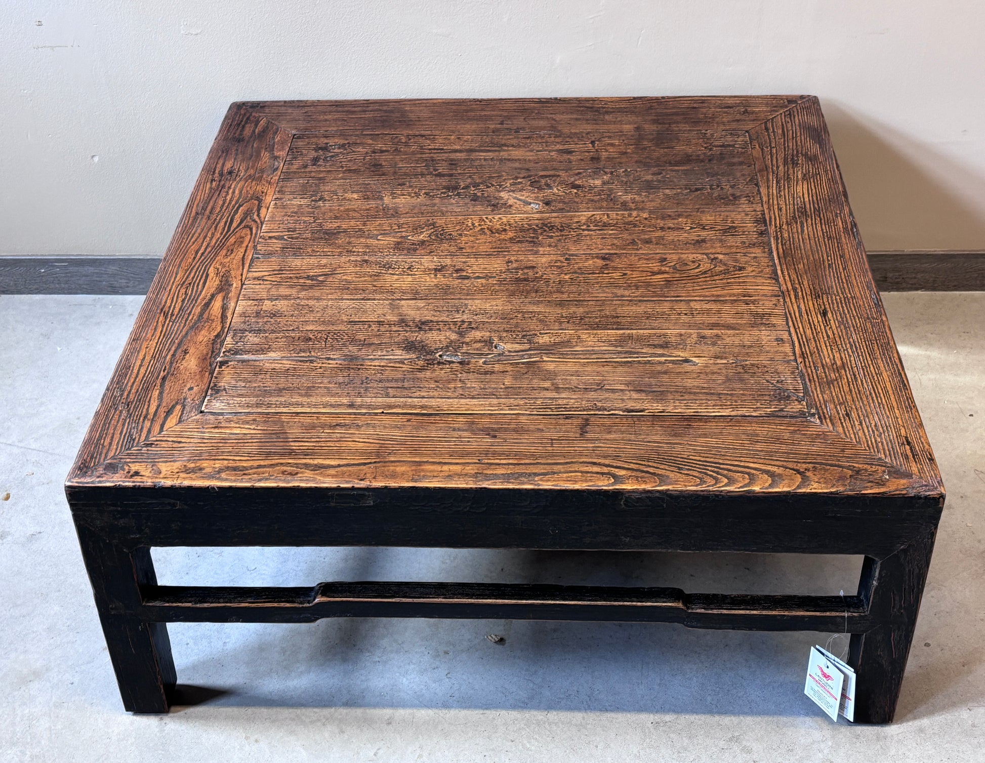 Rigoroso tavolo basso cinese in legno massello, con gambe e traverse in lacca scura e piano nel colore naturale. Particolarmente bella è la venatura del piano. Forma quadrata. Adatto come tavolo da salotto davanti al divano.