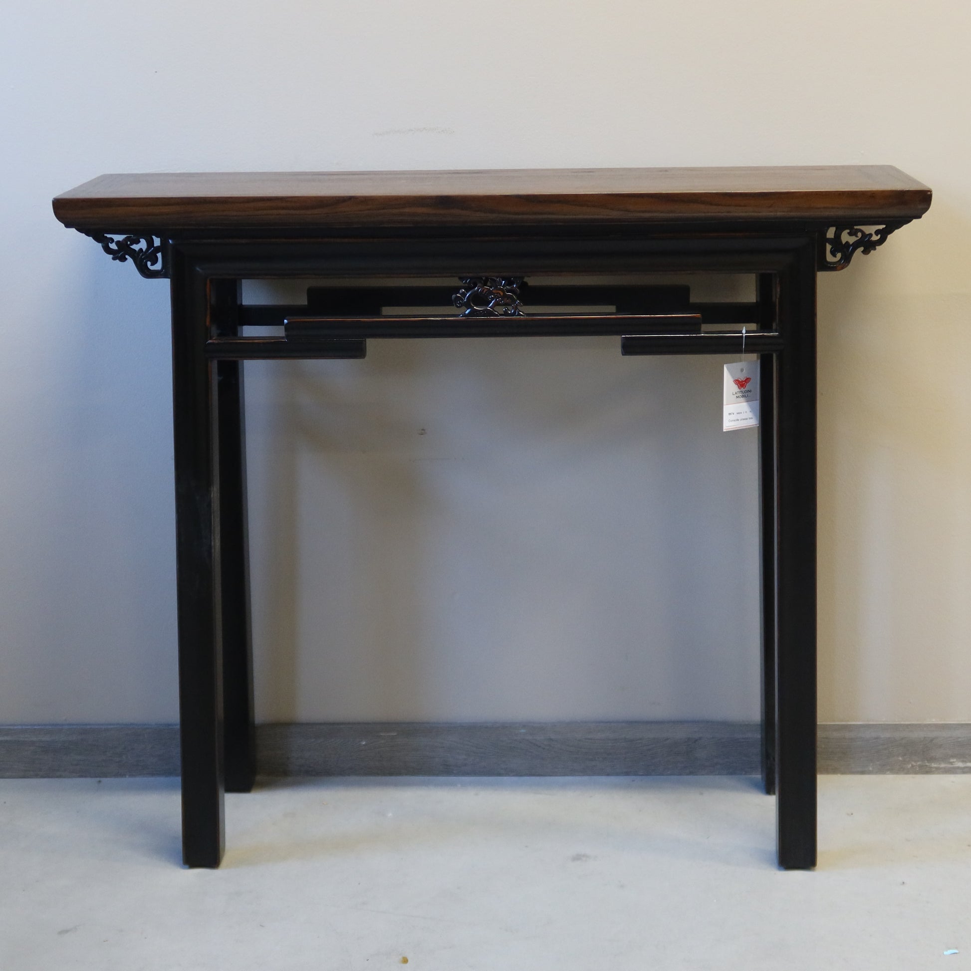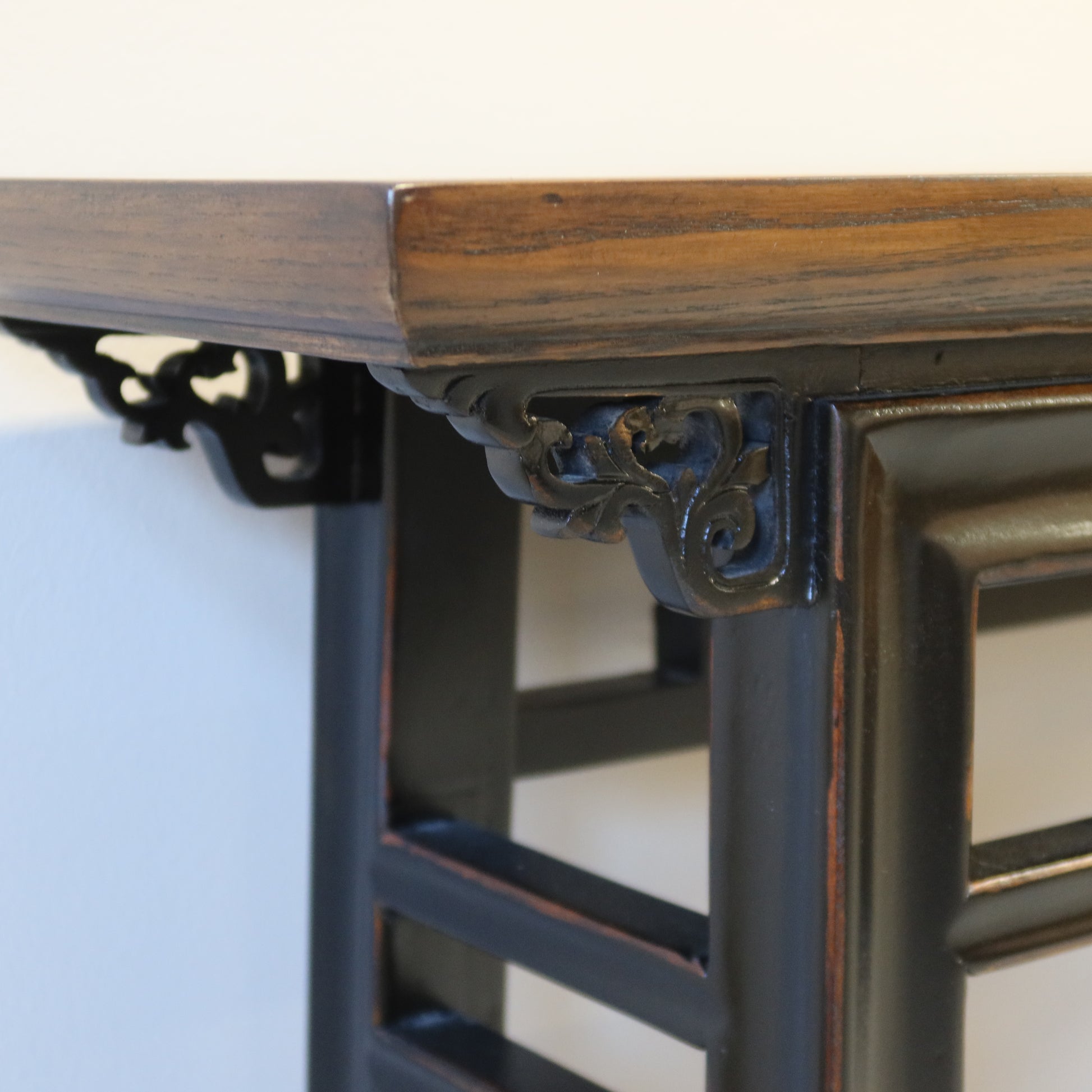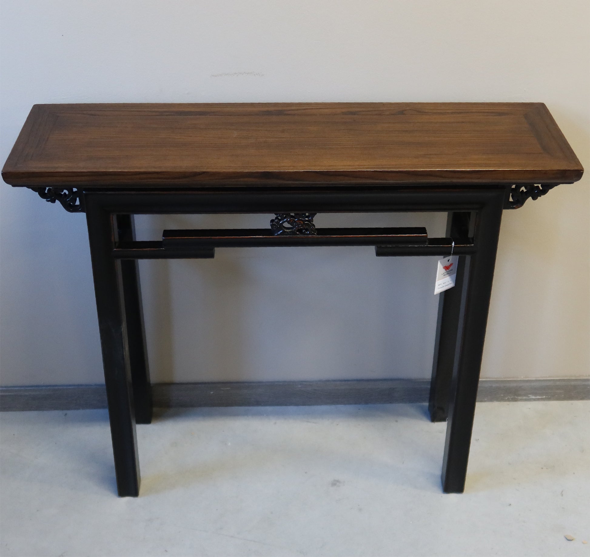 Console etnica in olmo naturale. Linee leggere con delicati raccordi intagliati. Ideale per un ingresso o un disimpegno, ma ottima in qualunque parte della casa in cui si ha bisogno di un piano d'appoggio elegante e non ingombrante.